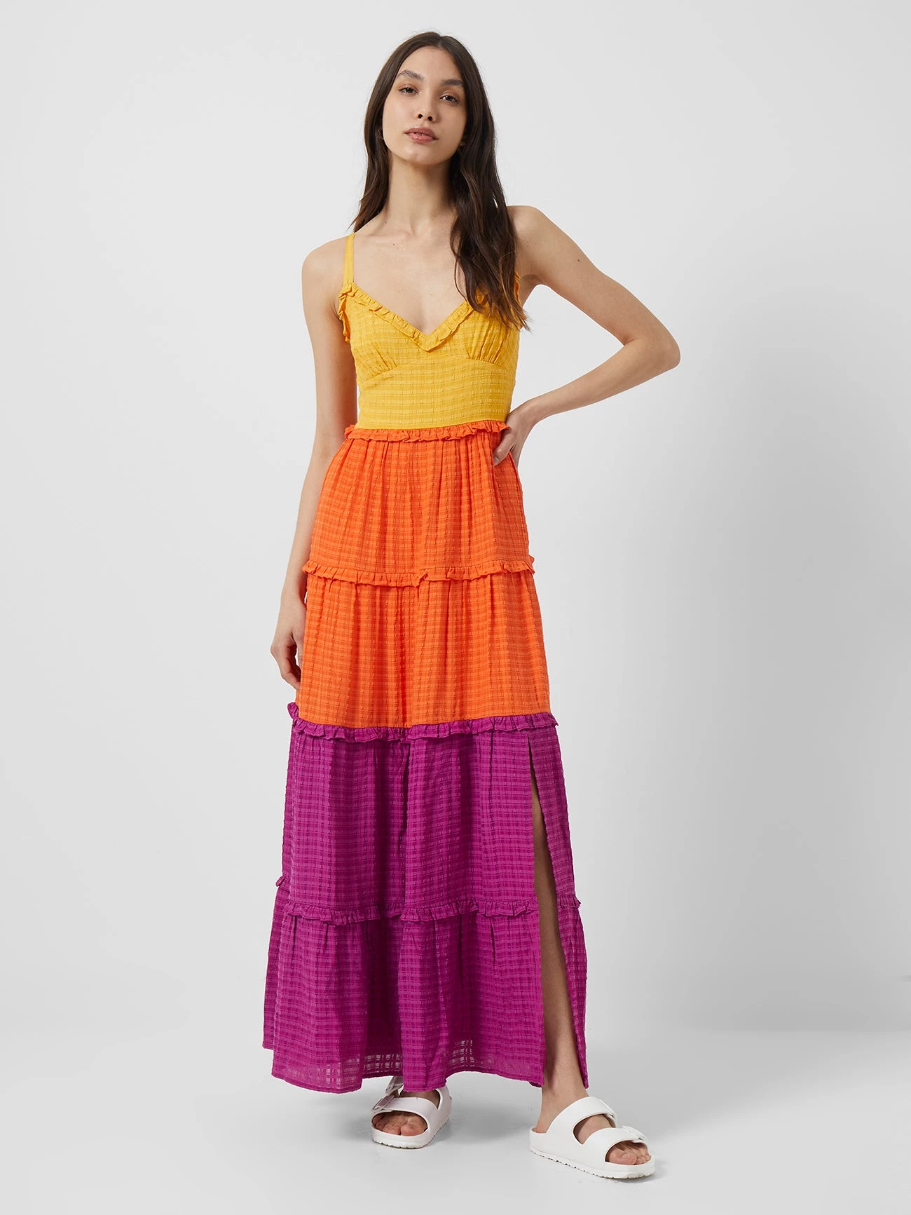 The Adira Birch Tiered Maxi Dress is best to be enjoyed in stages. The floor-sweeping silhouette hangs on thin double straps and has a V-neckline, with bold and beautiful bursts of summer colours.
