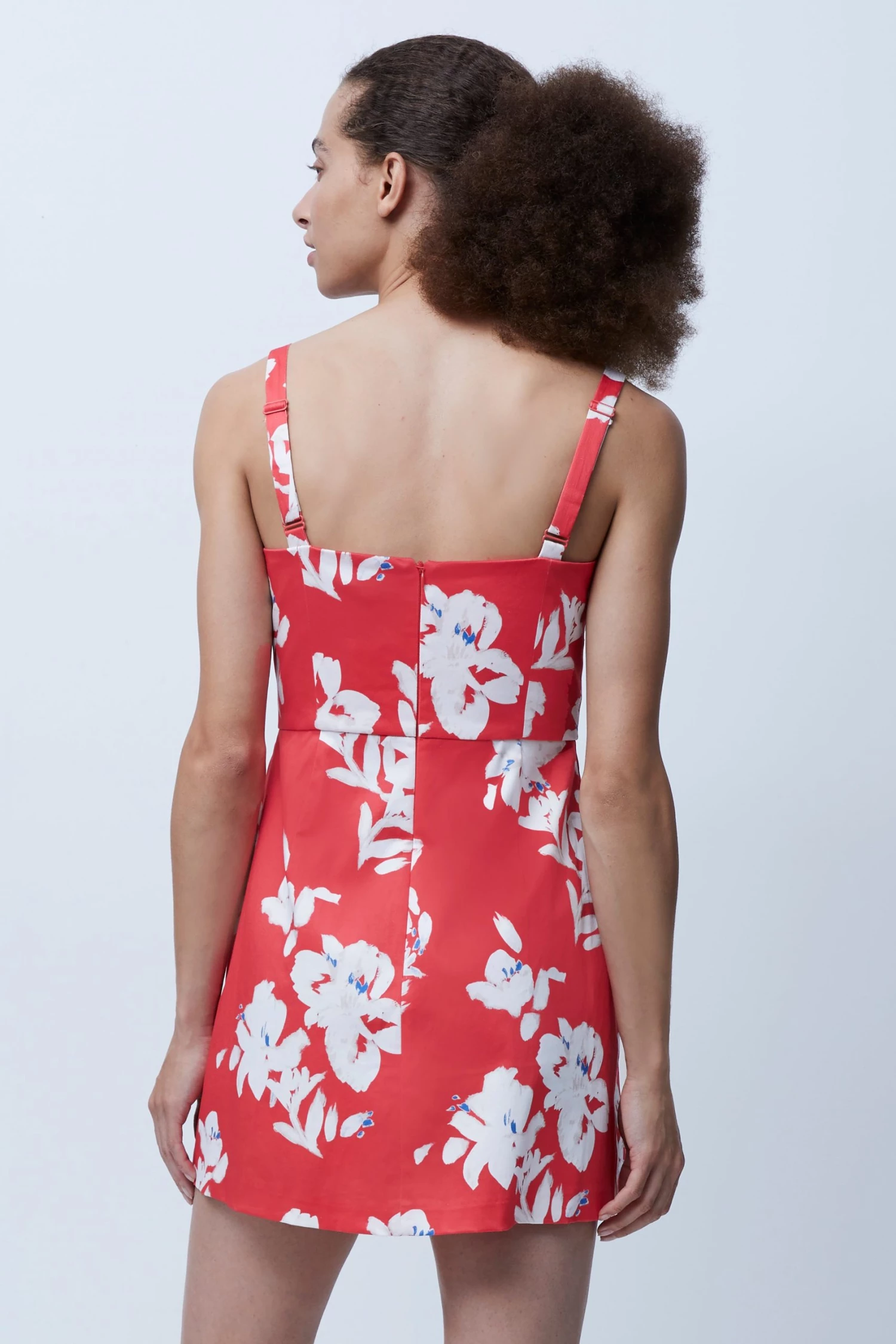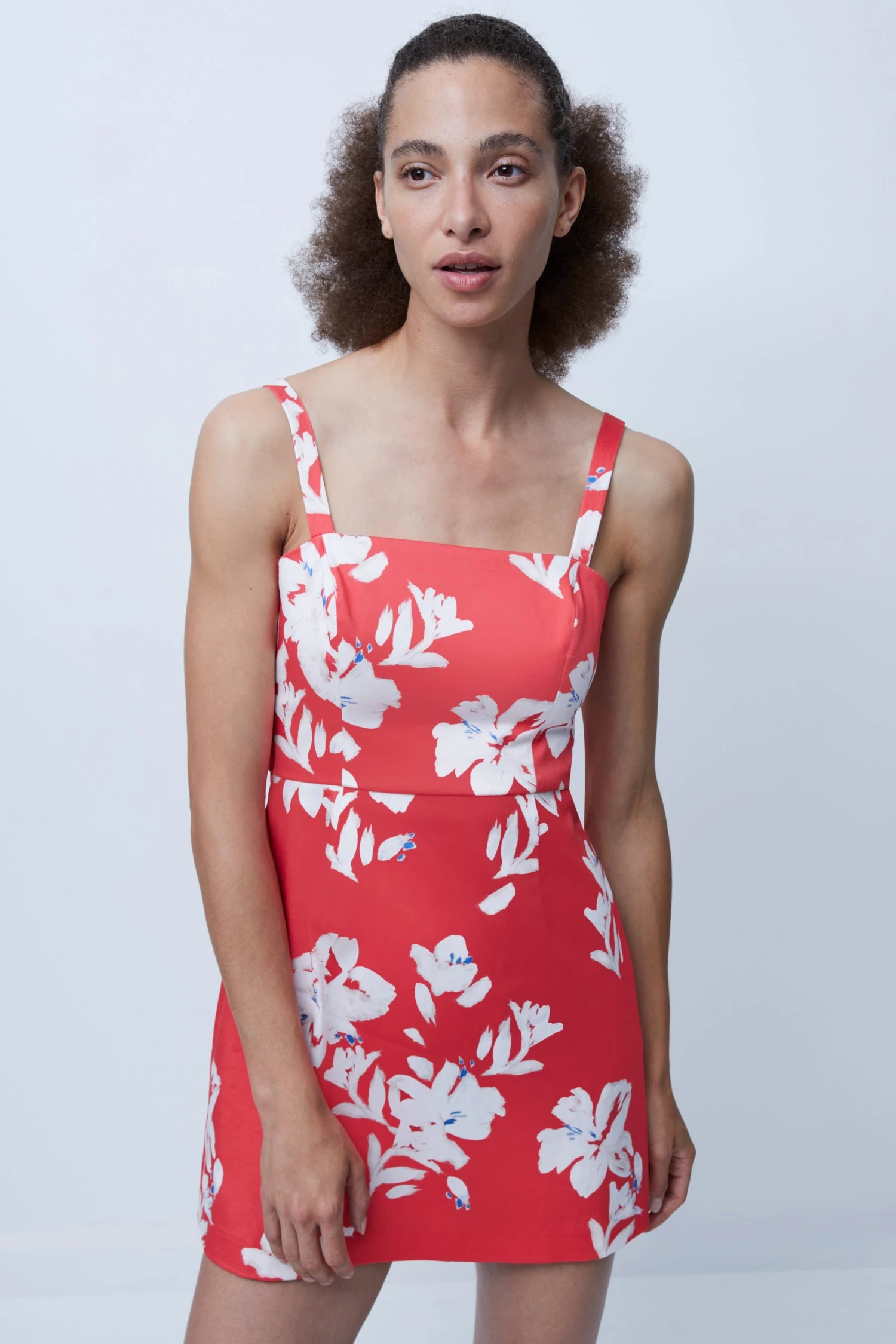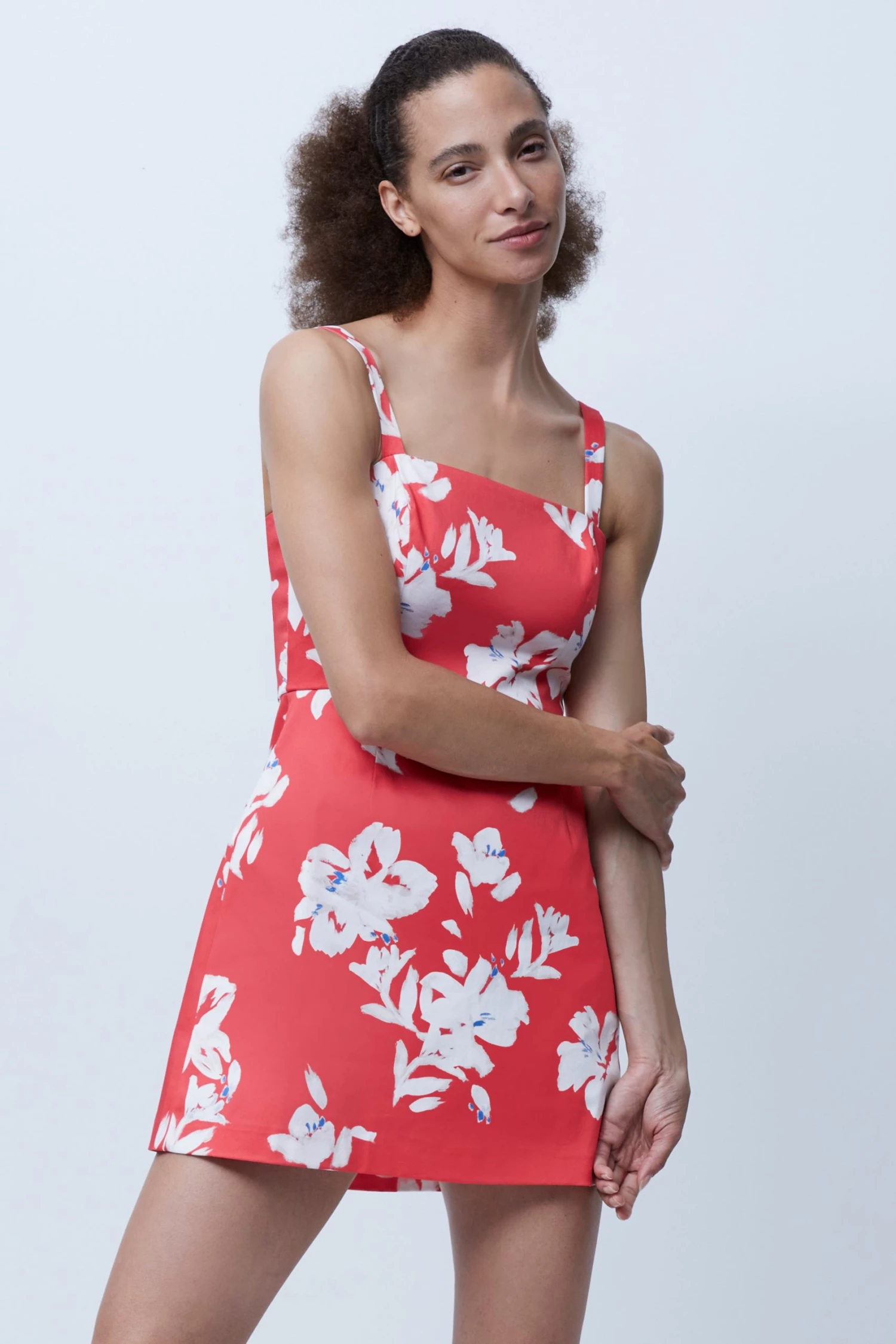 For modern, feminine style, try the Alba dress. Adorned with a pretty floral print that instantly catches the eye, the dress features a contemporary straight neckline, fitted bodice and short length. Marrying comfort and style with it’s stretch cotton fabrication, the floral dress pairs perfectly with trainers for a walk in the park, or with heels for an elevated aesthetic.