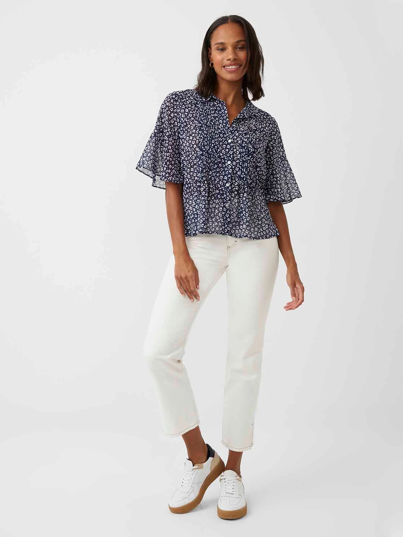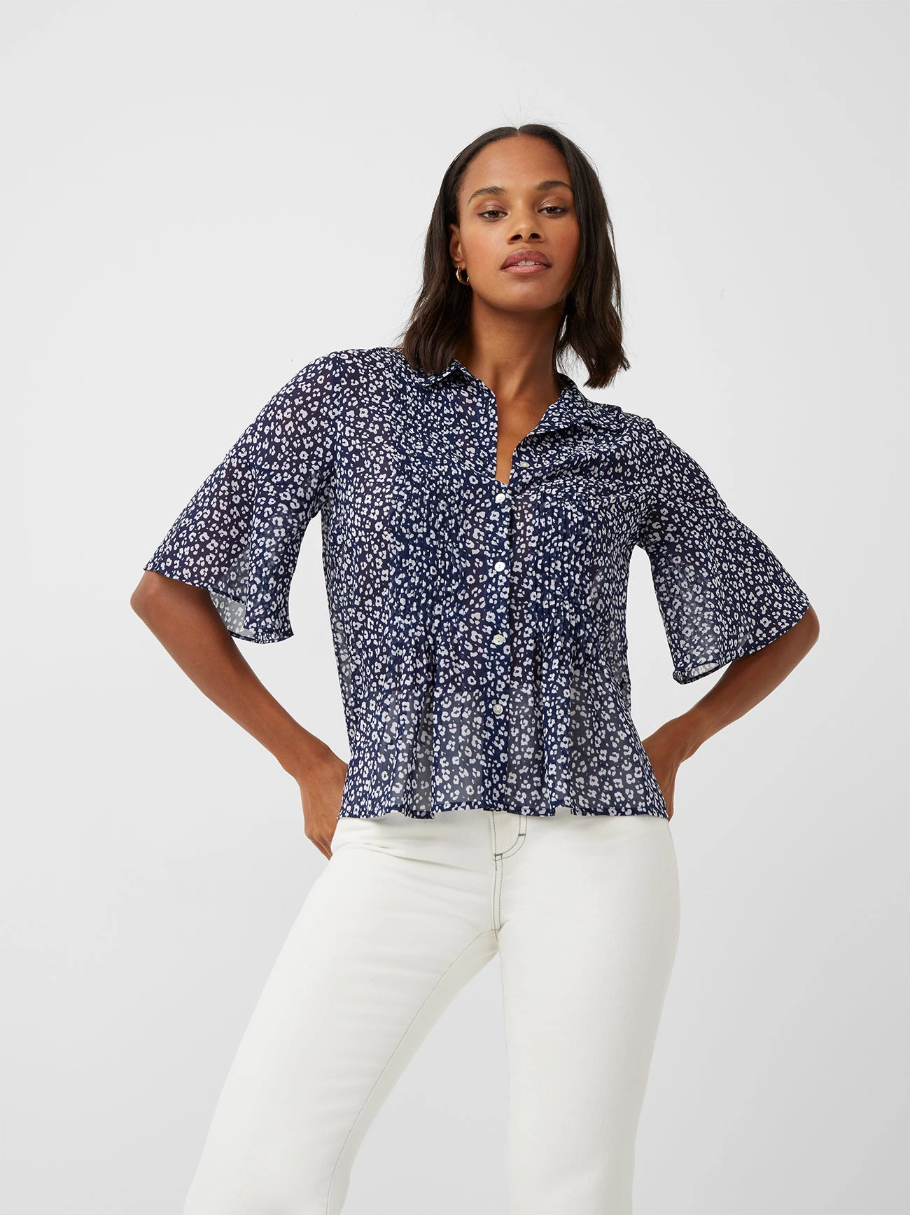 Keep things light in the Animal Print Pintuck Shirt. Floaty and feminine, it has a ditsy leopard pattern all over.