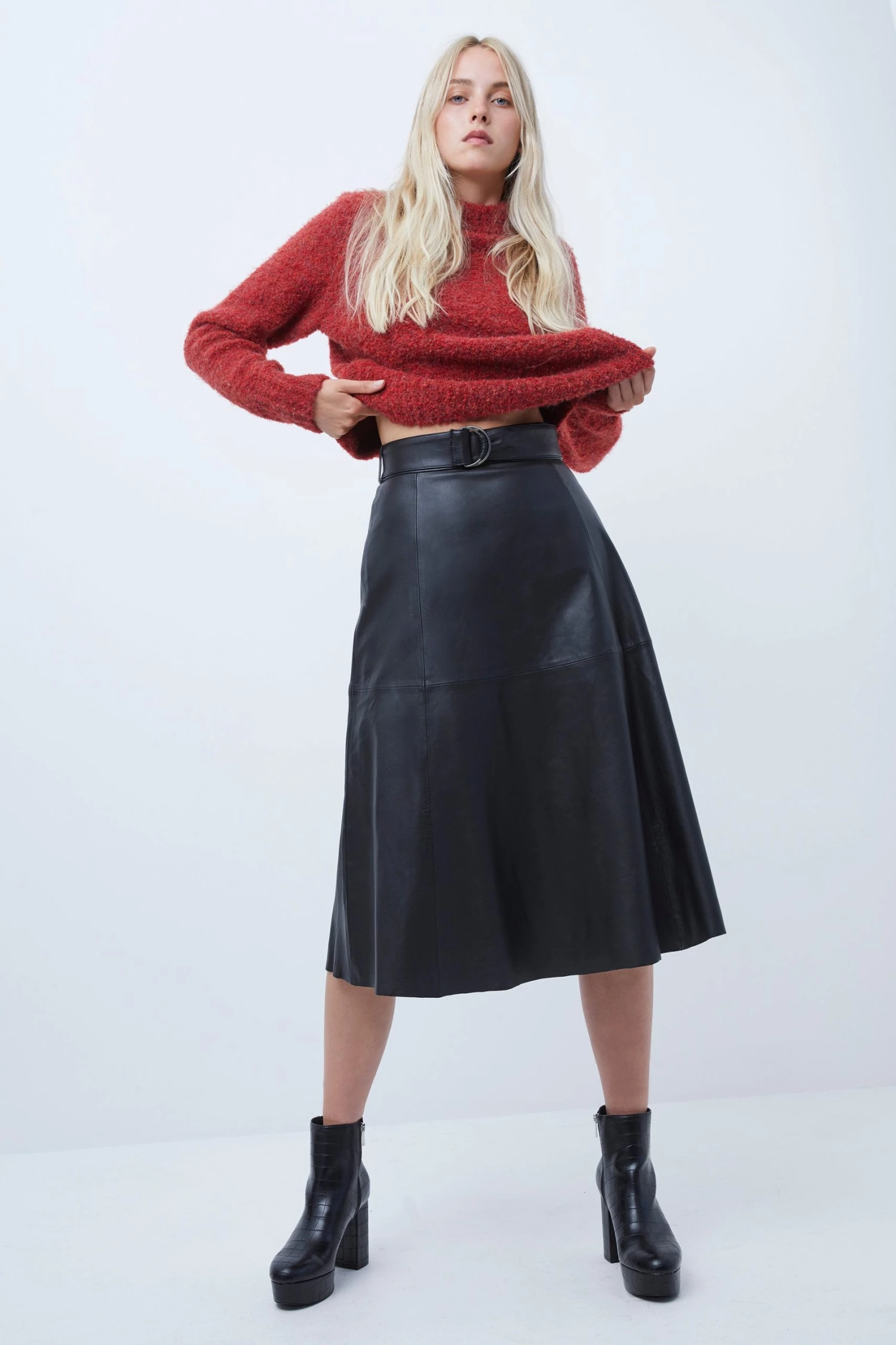 Elevate your wardrobe for the new season with the Arlan skirt. Constructed in smooth, supple leather, the skirt is a refined piece that creates a flawless silhouette. With a d-ring belt at the waist and midi length, the skirt pairs perfectly with a sleek white shirt for days at the office, or can easily be dressed up with a satin top and simple jewellery for premium occasion style.