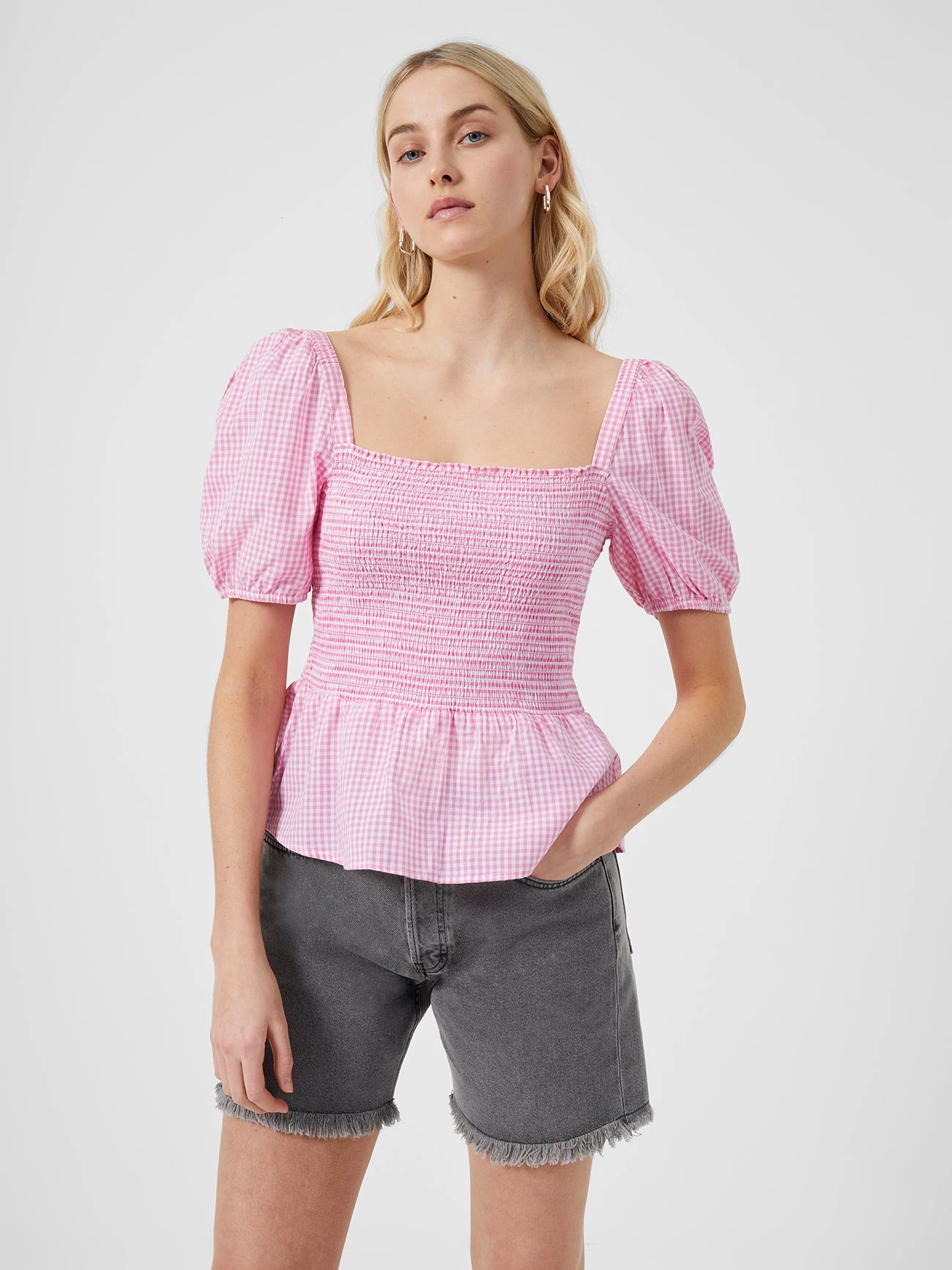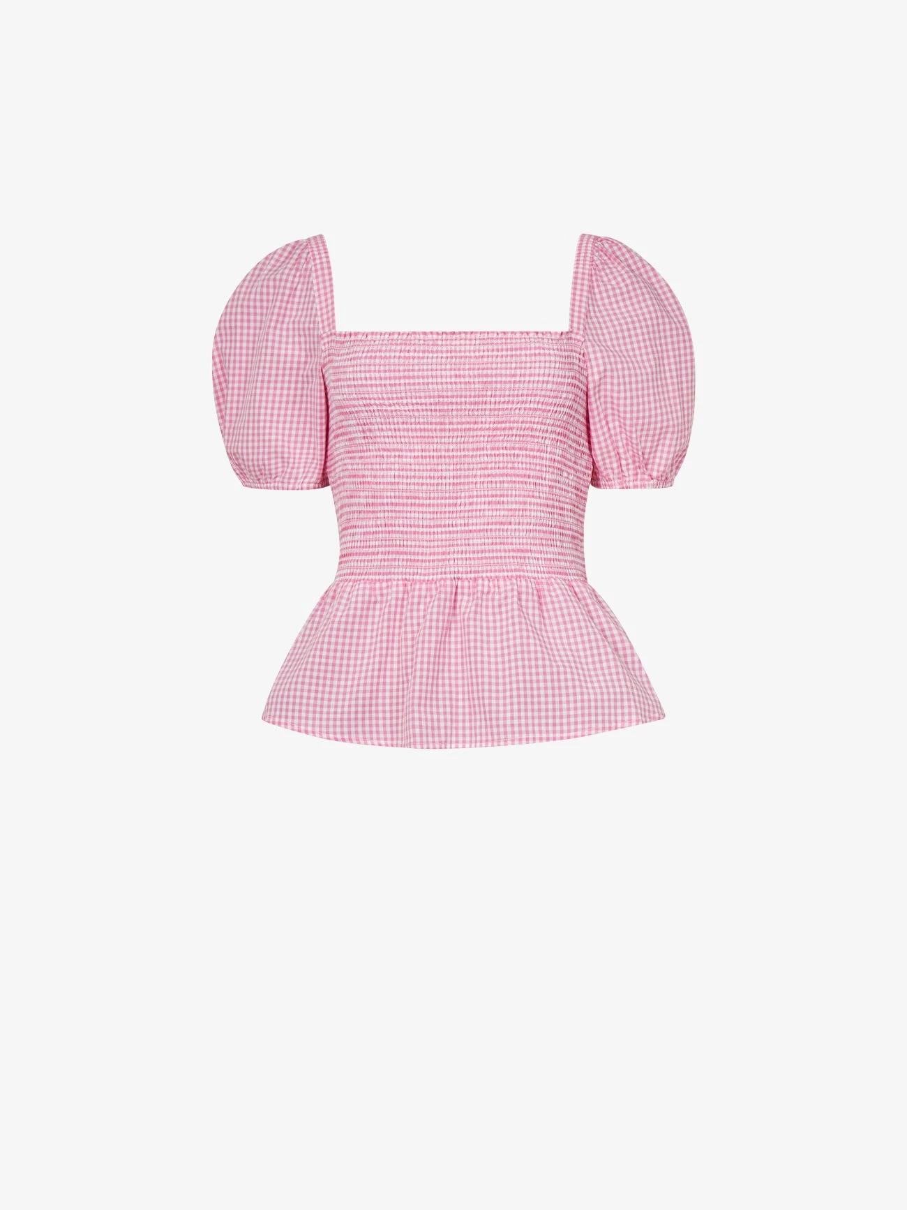 Pretty in pink from picnics in the park to daytime drinks. The Artina Gingham Smocked Top adds a playful spirit to your wardrobe with a square neckline, low back and puffed sleeves, all whilst presenting a begonia pink gingham pattern.