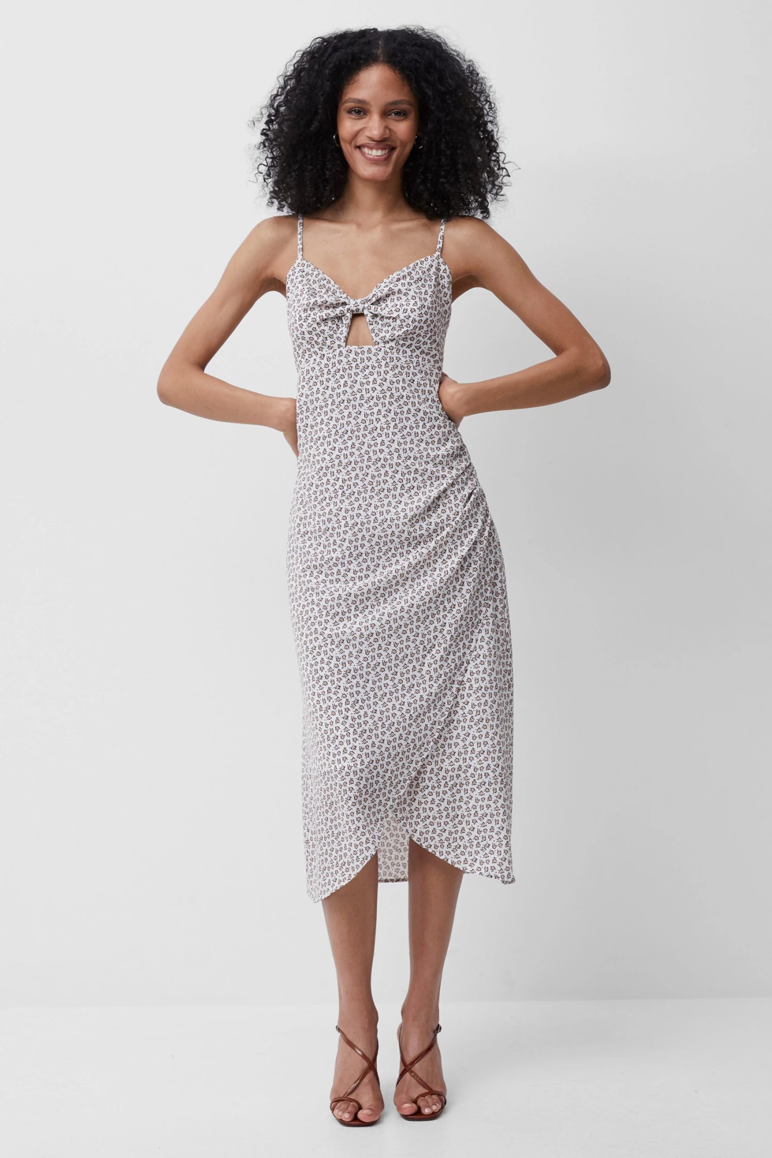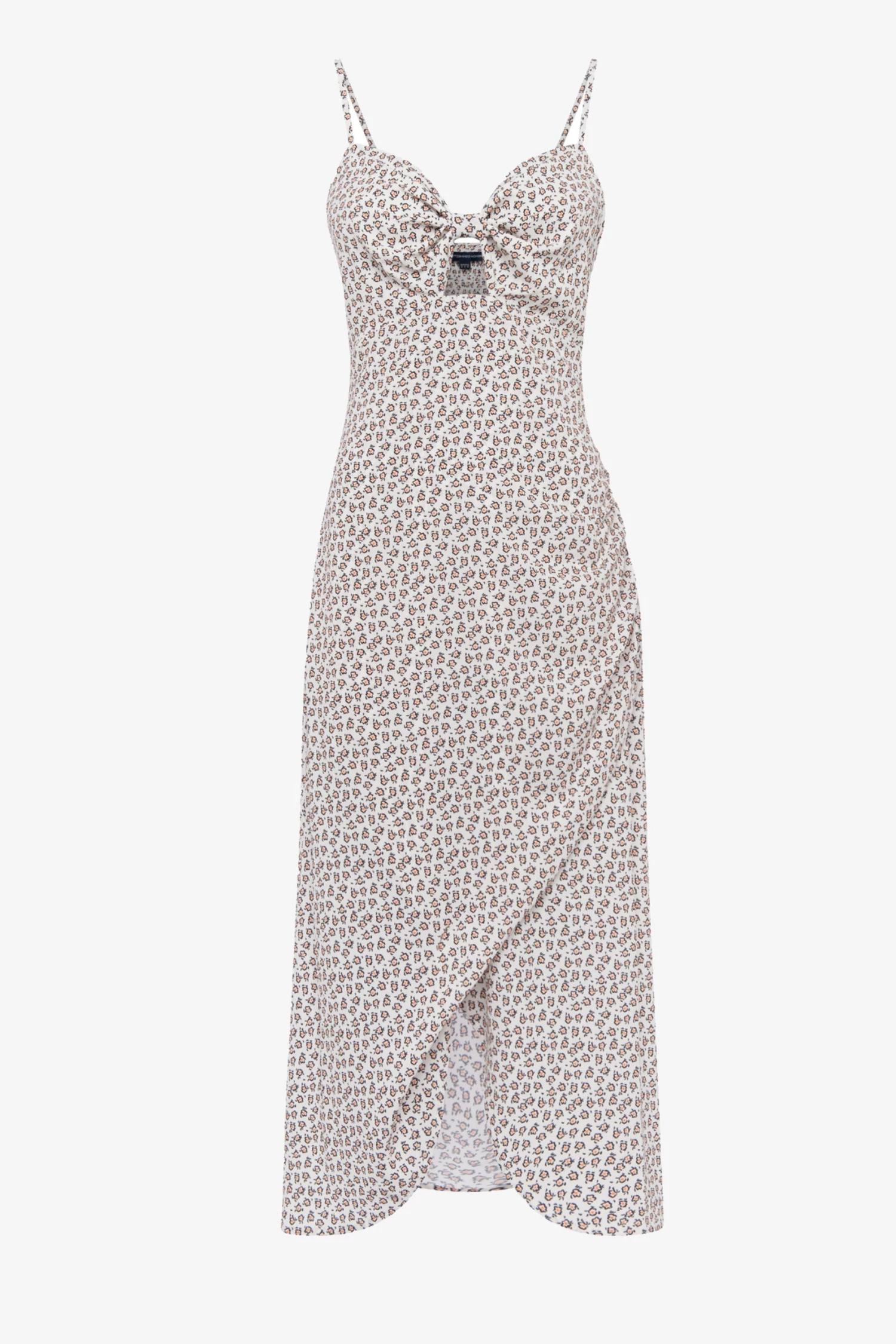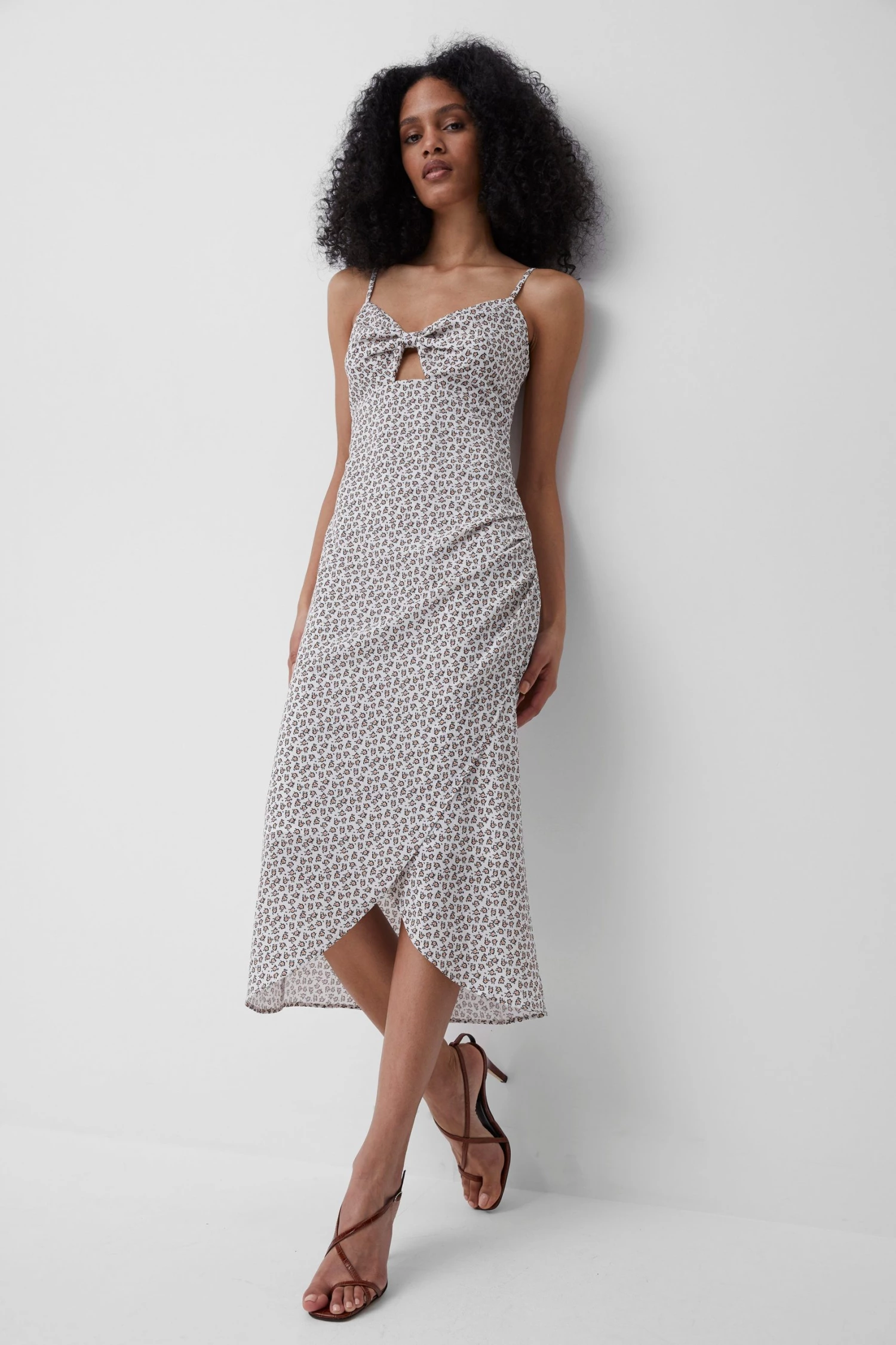 A bold cut-out and alluring tie accents set the Aura Ditsy Dress apart. Designed in a midi length with wrap skirt and ruched detailing.