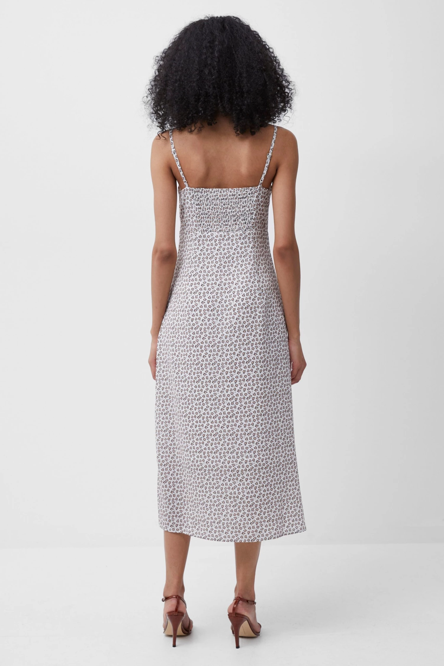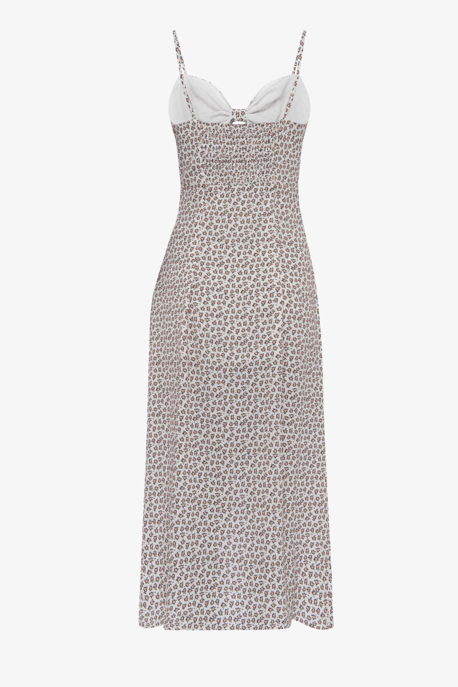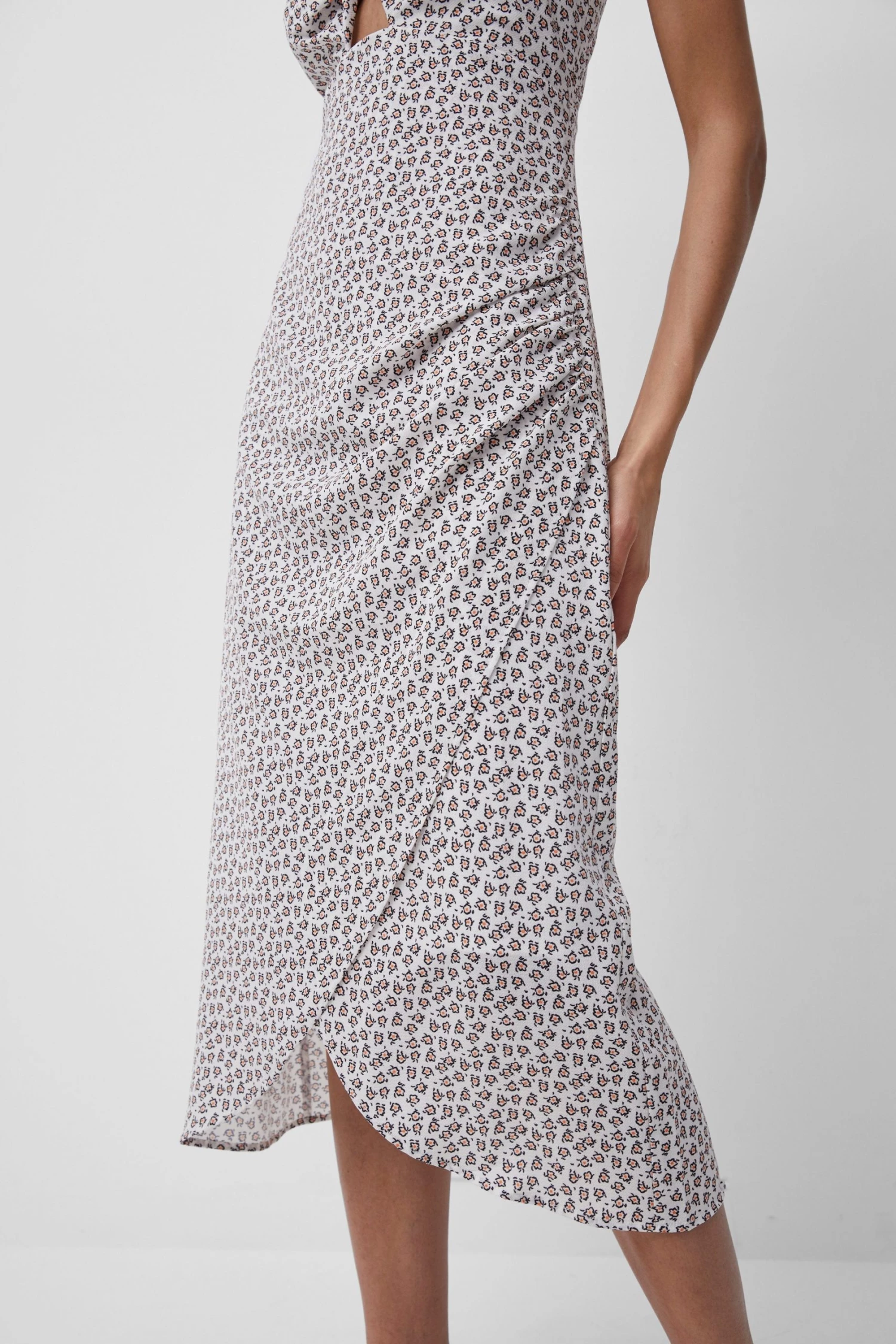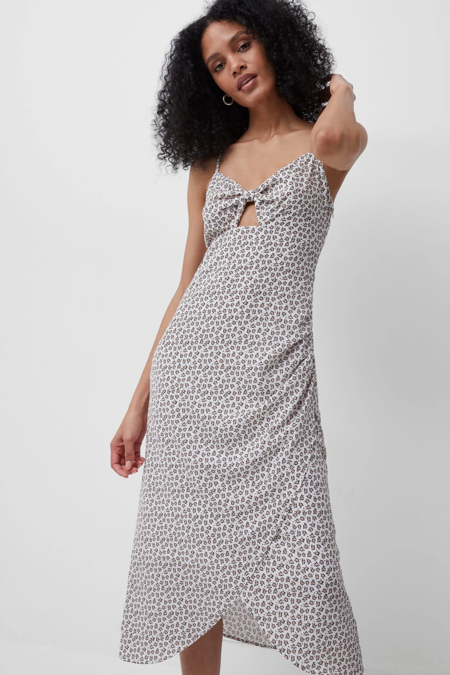 A bold cut-out and alluring tie accents set the Aura Ditsy Dress apart. Designed in a midi length with wrap skirt and ruched detailing.