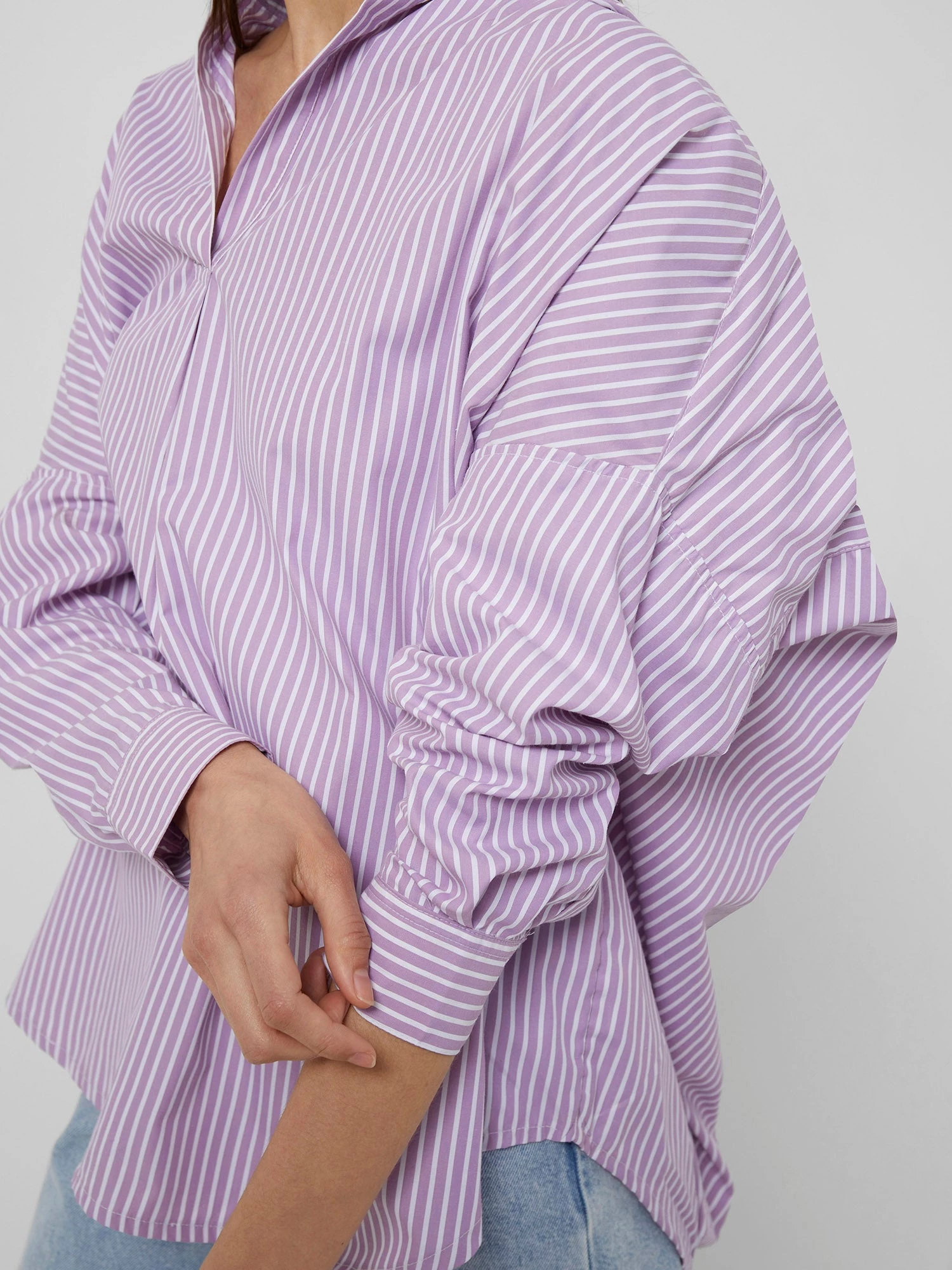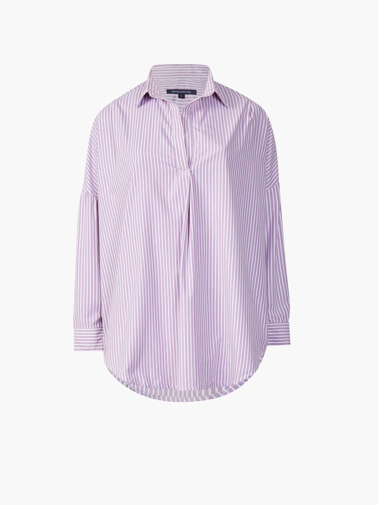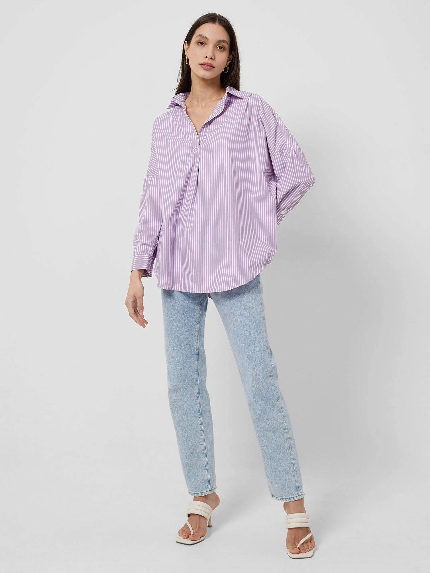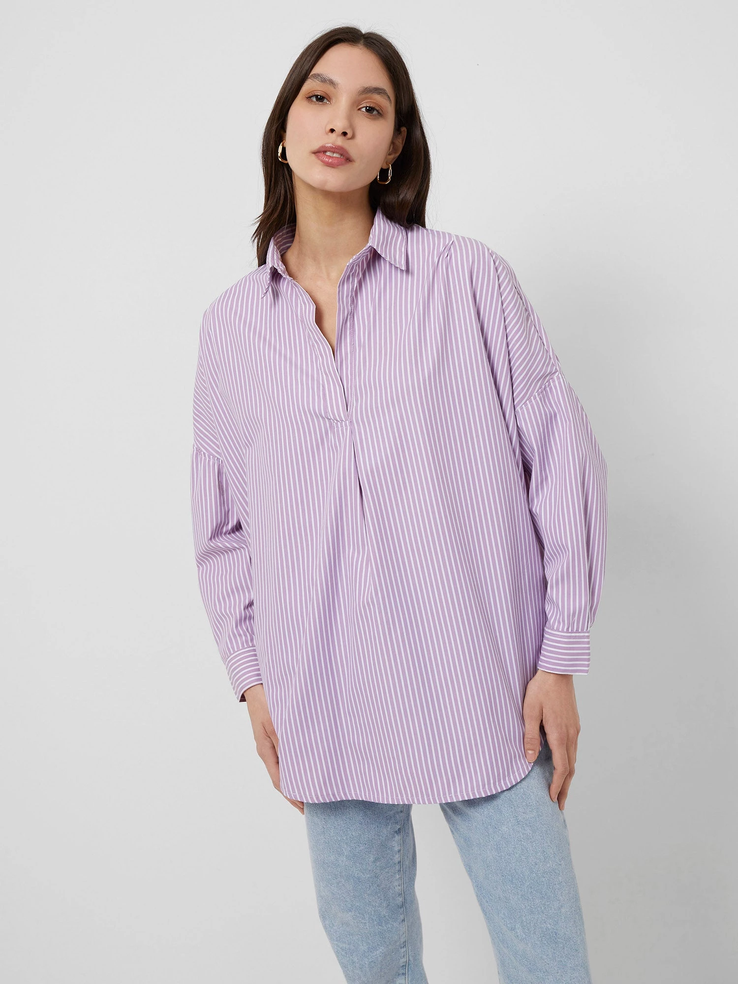 Go back to the office in the Bega Striped Dip-Hem Shirt. This sophisticated style has an oversized silhouette and mock placket.