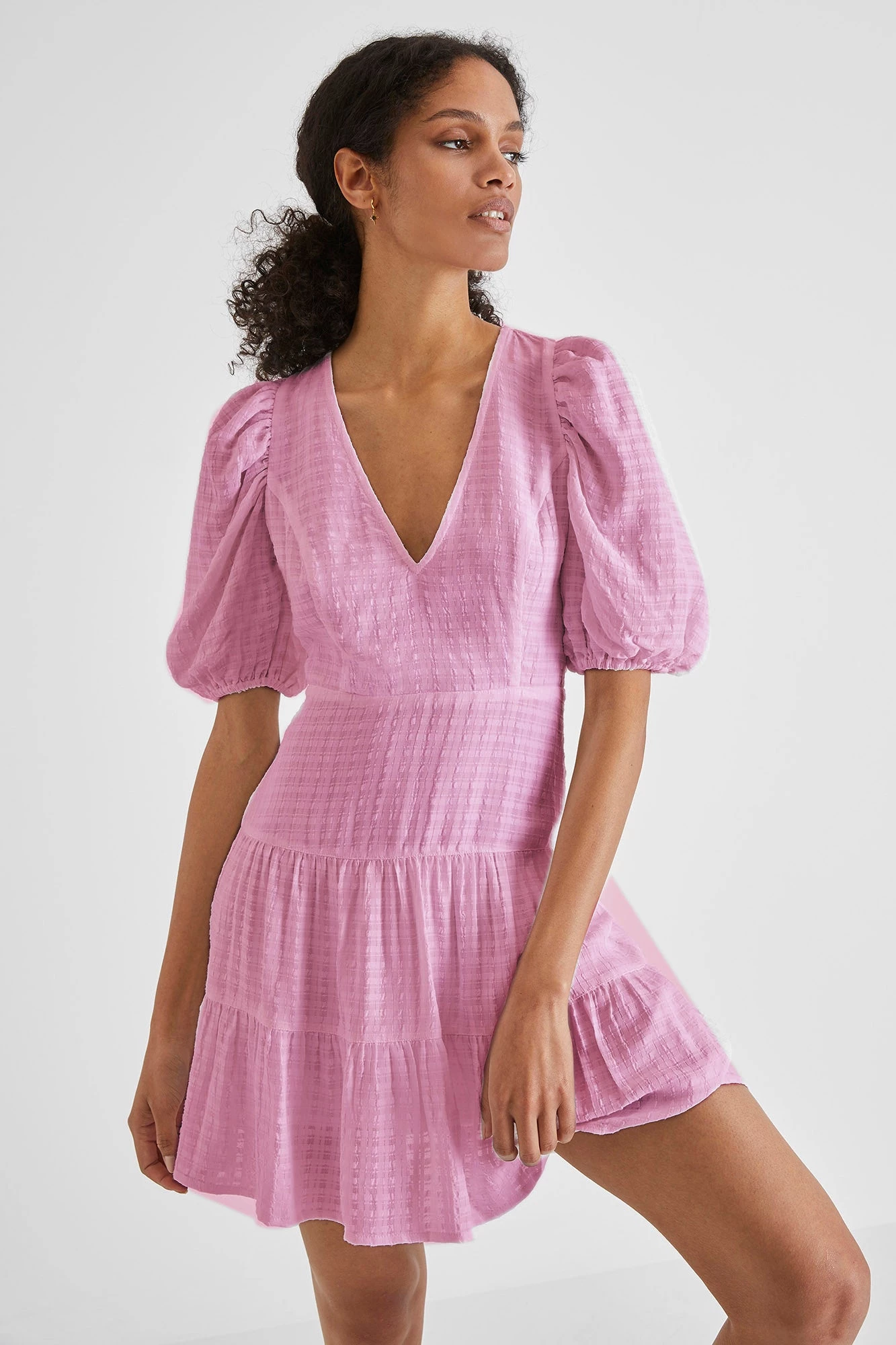 A sure-fire mood-lifter, our Birch Gingham Tiered Dress is destined for summer memories. Featuring puffed-up sleeves, daring V-neckline and airy fit finished at mini length.