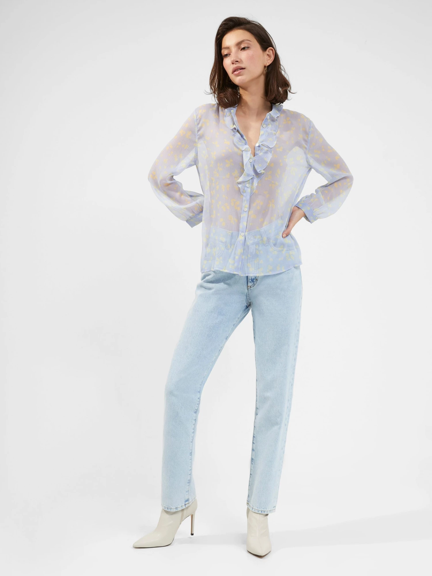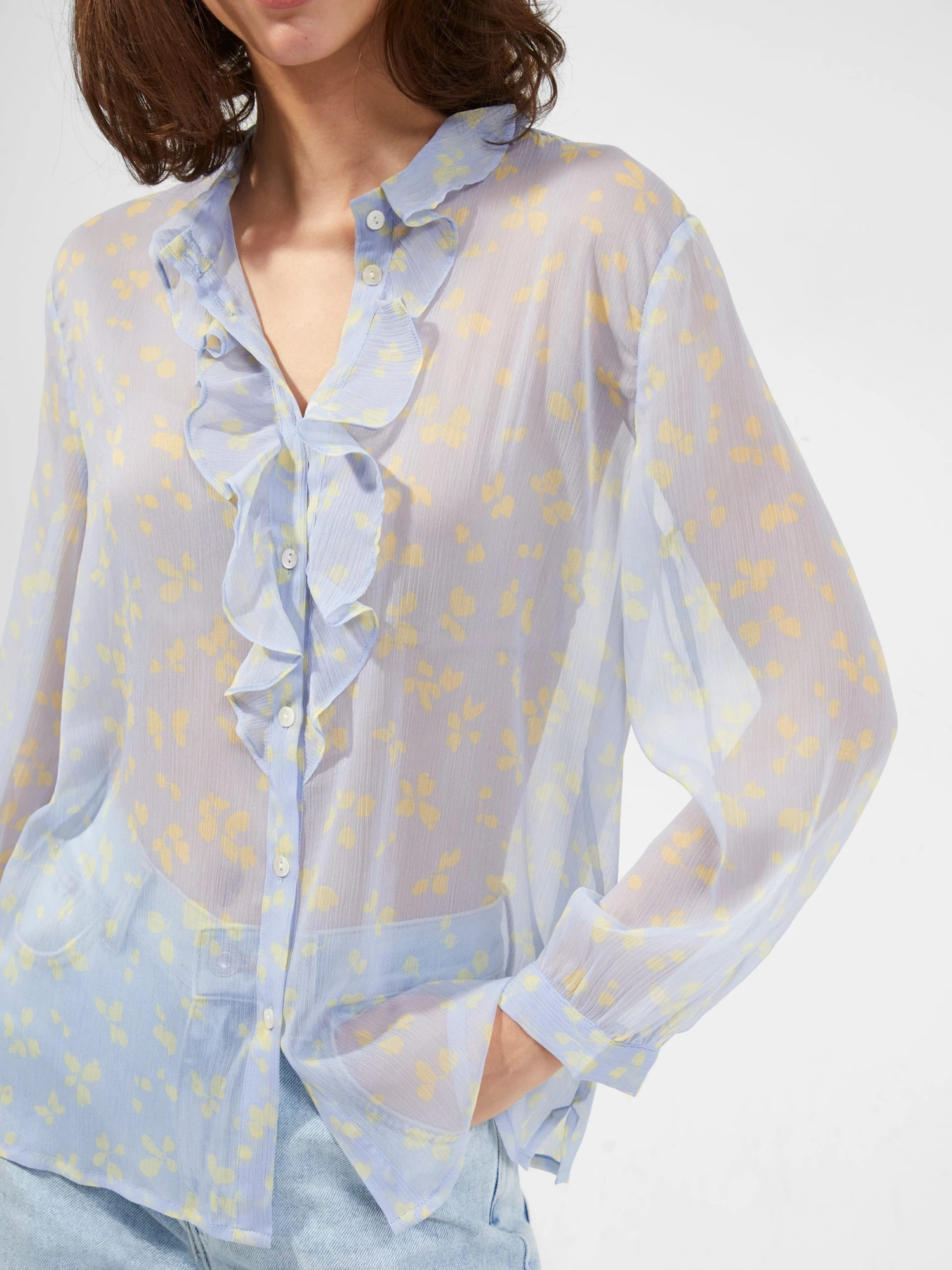 It’s about sheer fantasy with the Bonita Ruffle-Front Shirt. The draped style has a softly hued floral print and ruffled trim.
