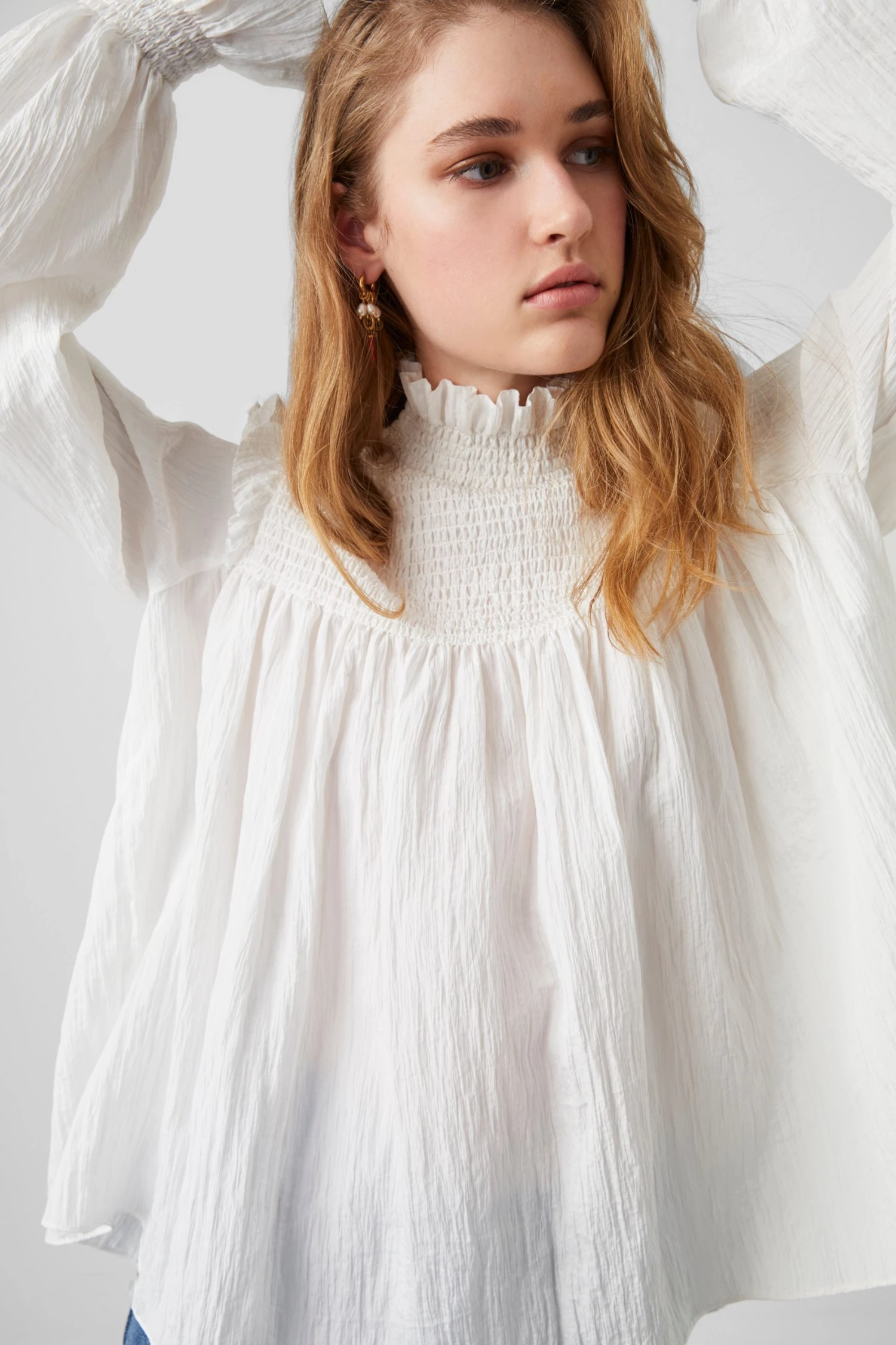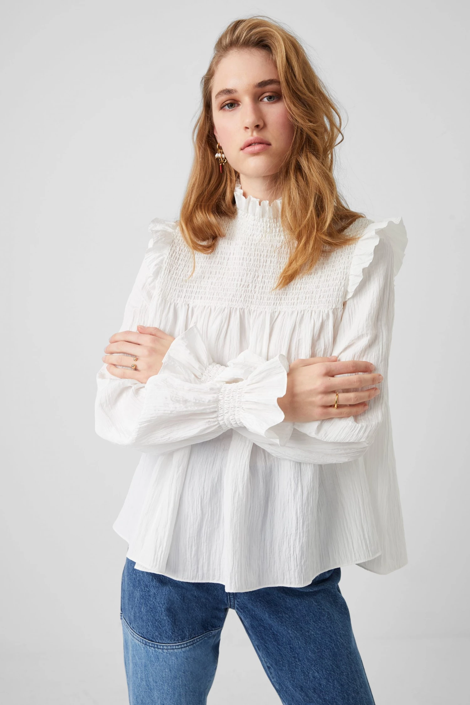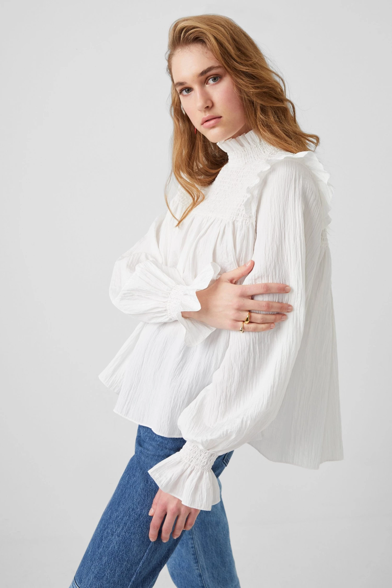 Channel the ever-essential prairie girl look with the Boza Crinkle Smocked Top. In a crisp, crinkle-effect fabric, it’s decorated with ruffled accents and a smocked panel.