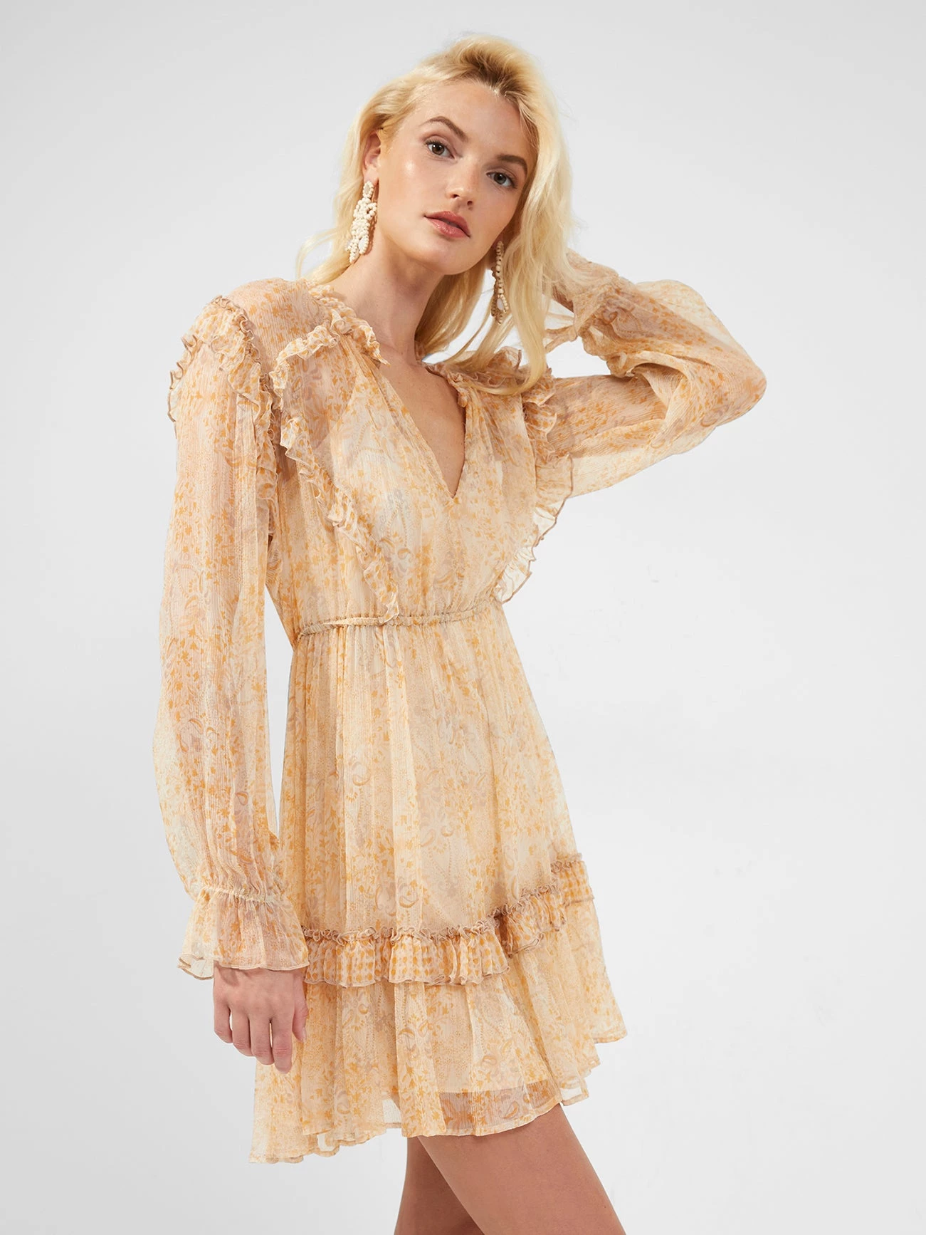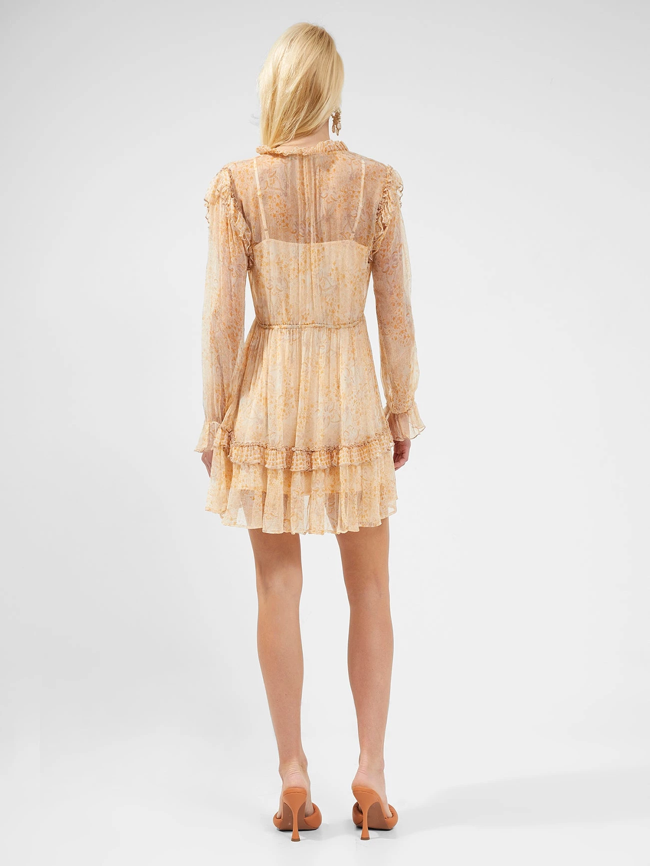 The Callie Crinkle Ruffle Mini Dress has spring written all over its silhouette. The ultra-lightweight profile floats in the breeze and reveals a semi-sheer, floral design.