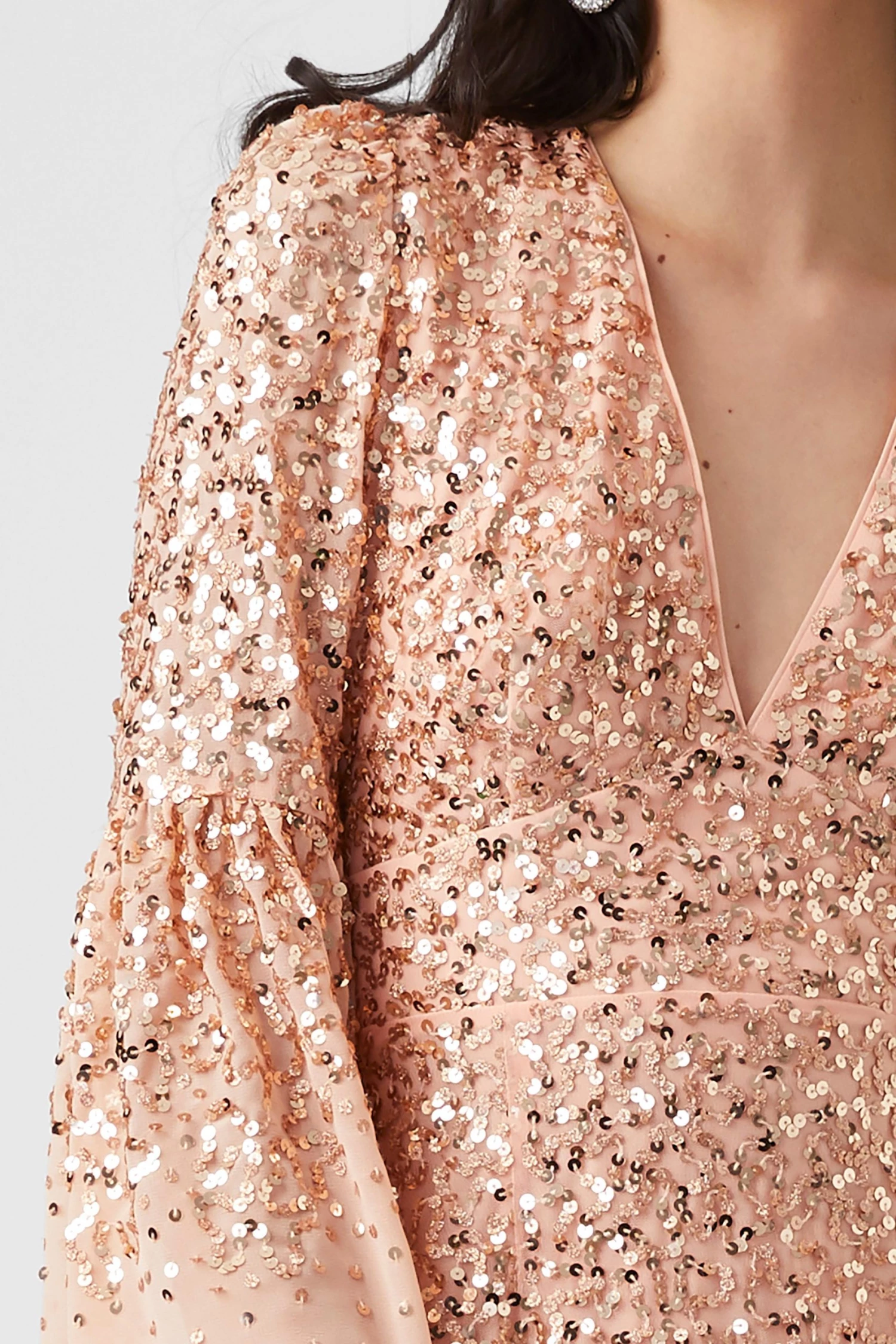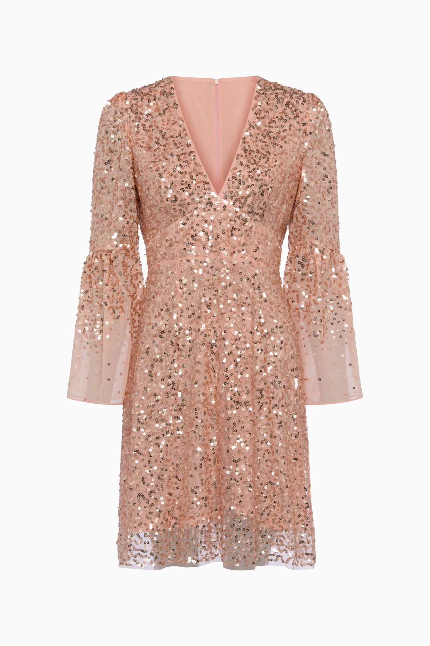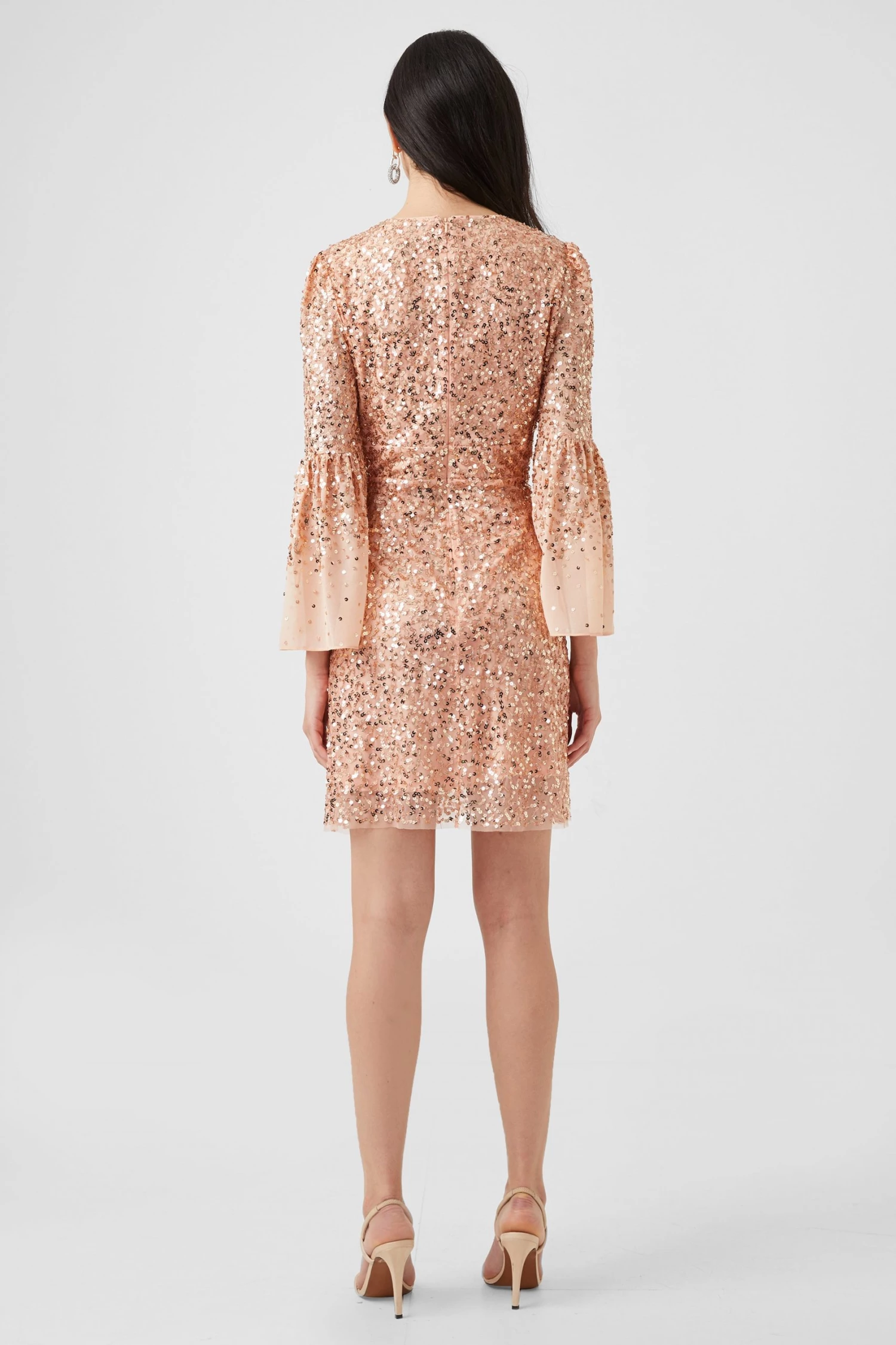 Dazzle everyone around with irresistible beauty (and sparkly sequins) when wearing the Celliene Sequin Mini Dress. It’s designed with fluted sleeves, V-neckline and lightweight fabric.
