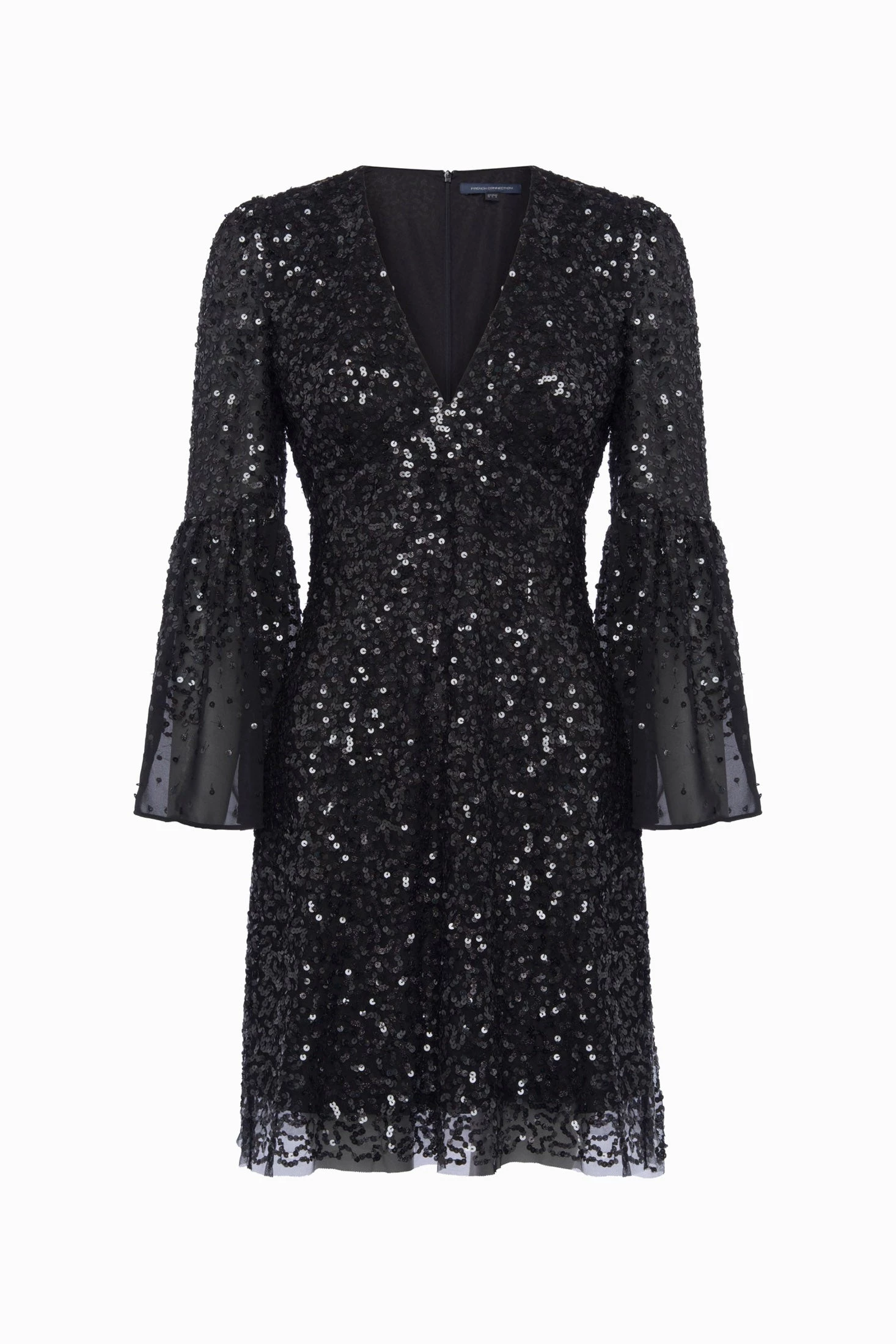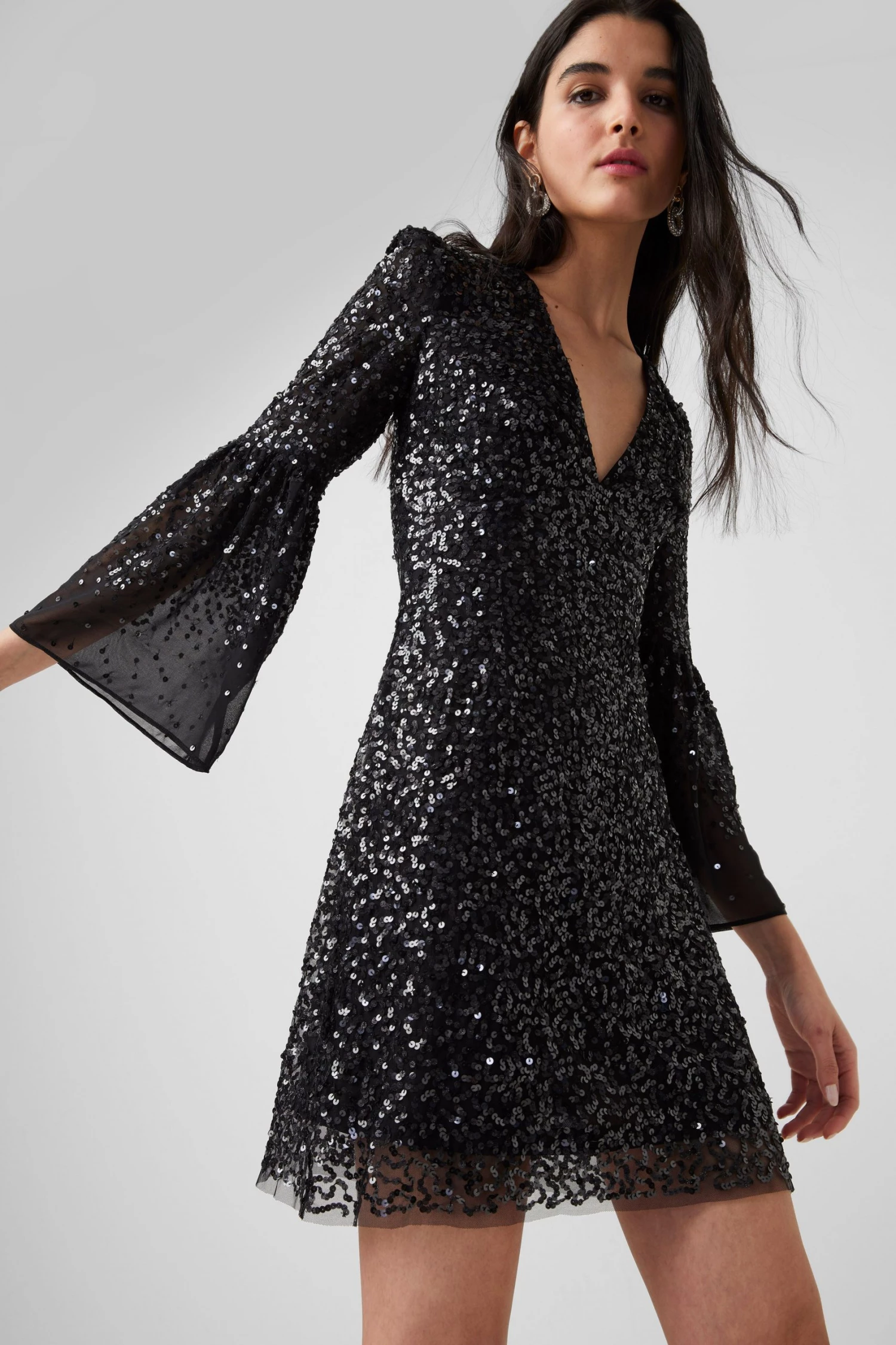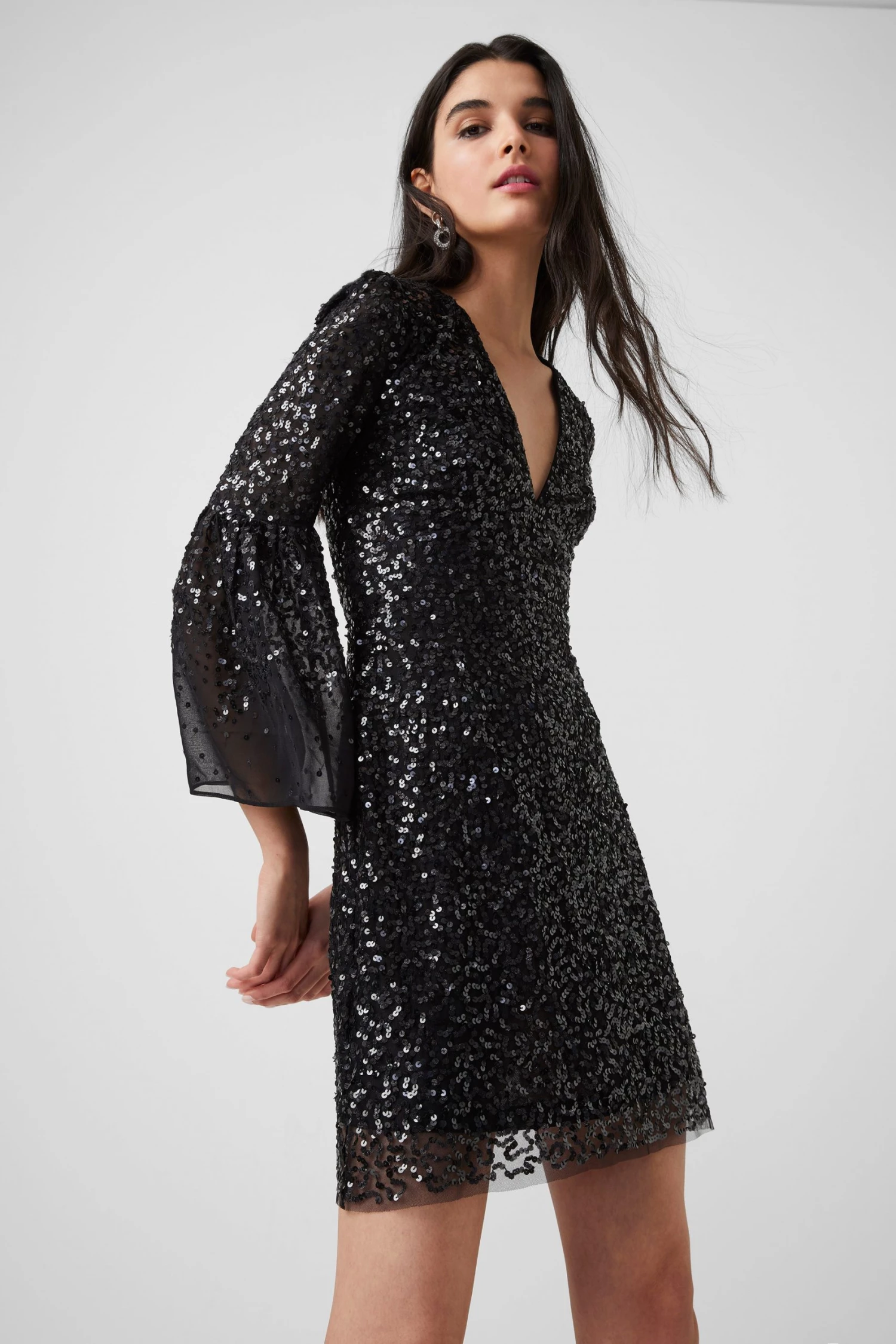 Dazzle everyone around with irresistible beauty (and sparkly sequins) when wearing the Celliene Sequin Mini Dress. It’s designed with fluted sleeves, V-neckline and lightweight fabric.