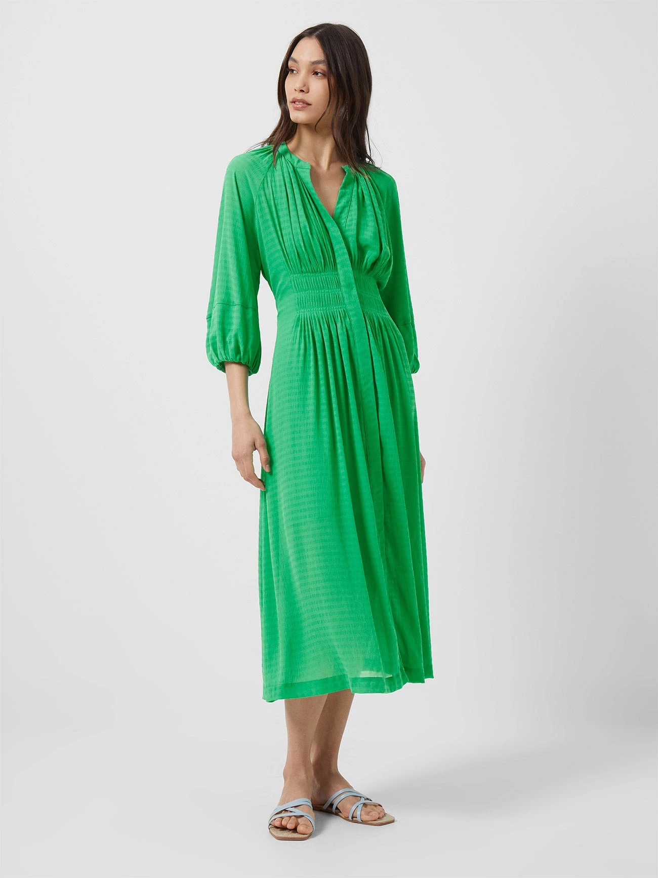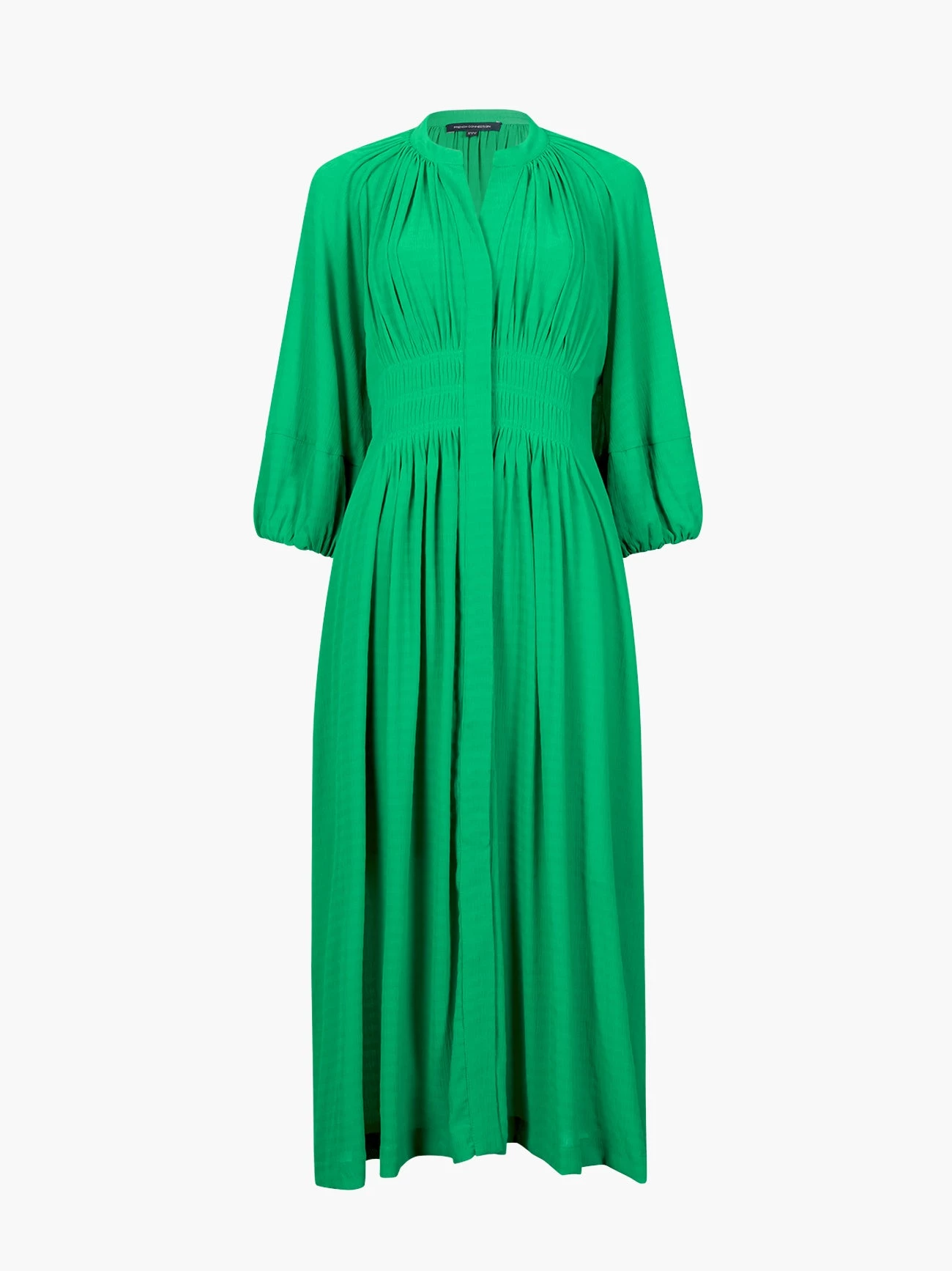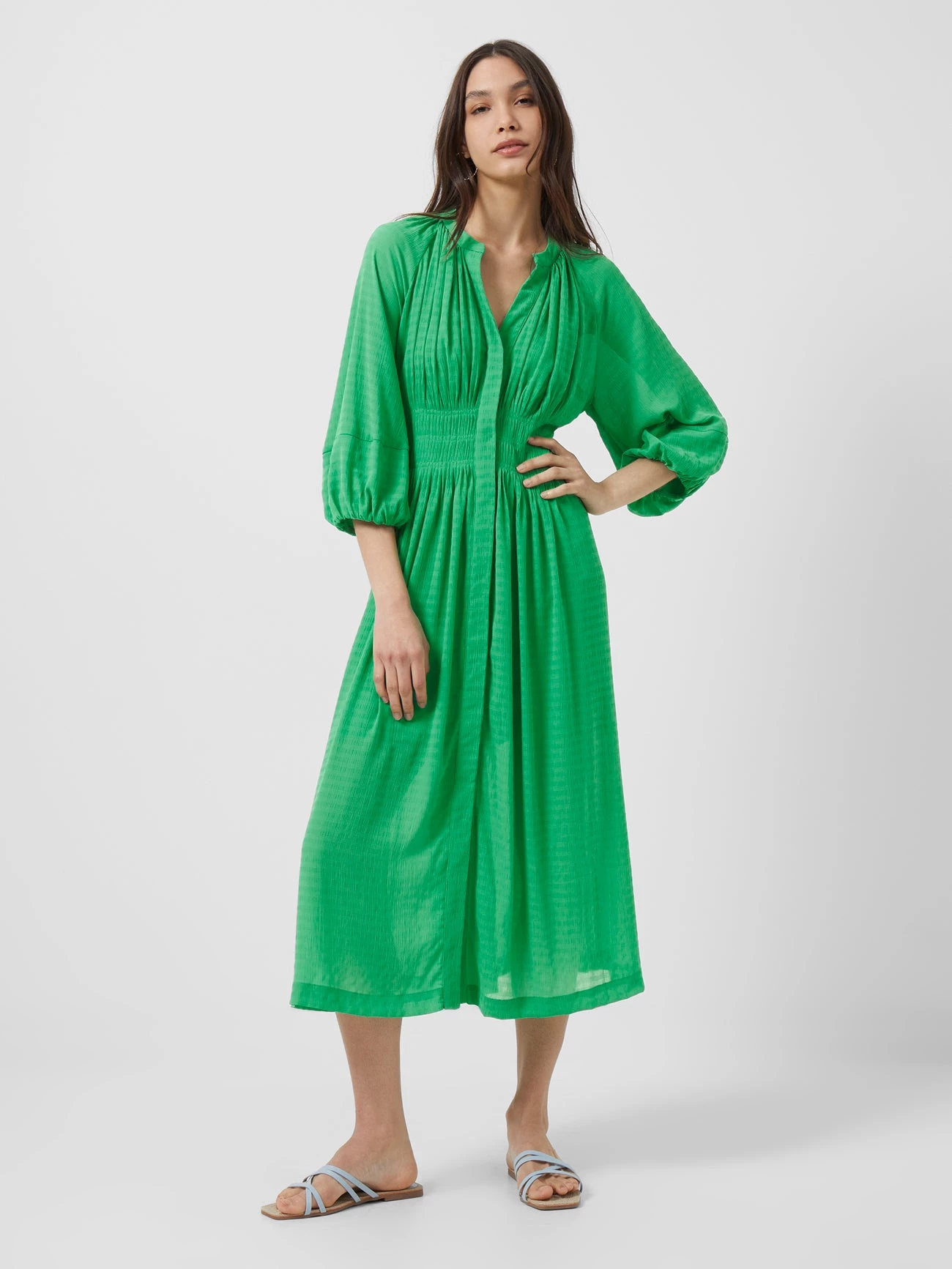The Cora Pleated Midi Dress makes for a bold, bright and beautiful addition to your wardrobe. This midi number conceals its front button fastening to allow for the flattering pleated design to shine uninterrupted, teamed with voluminous half sleeves, v-neckline and sheer hem.