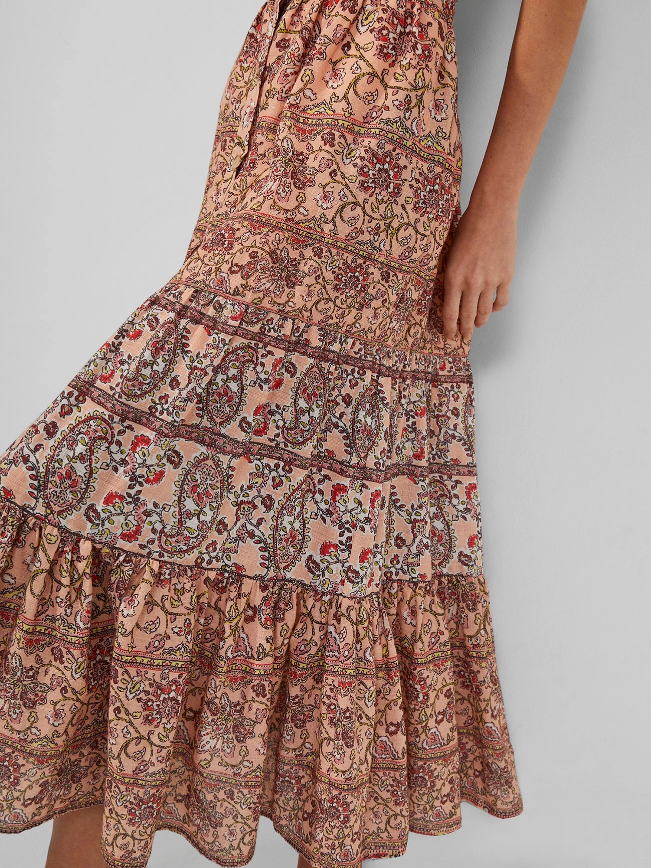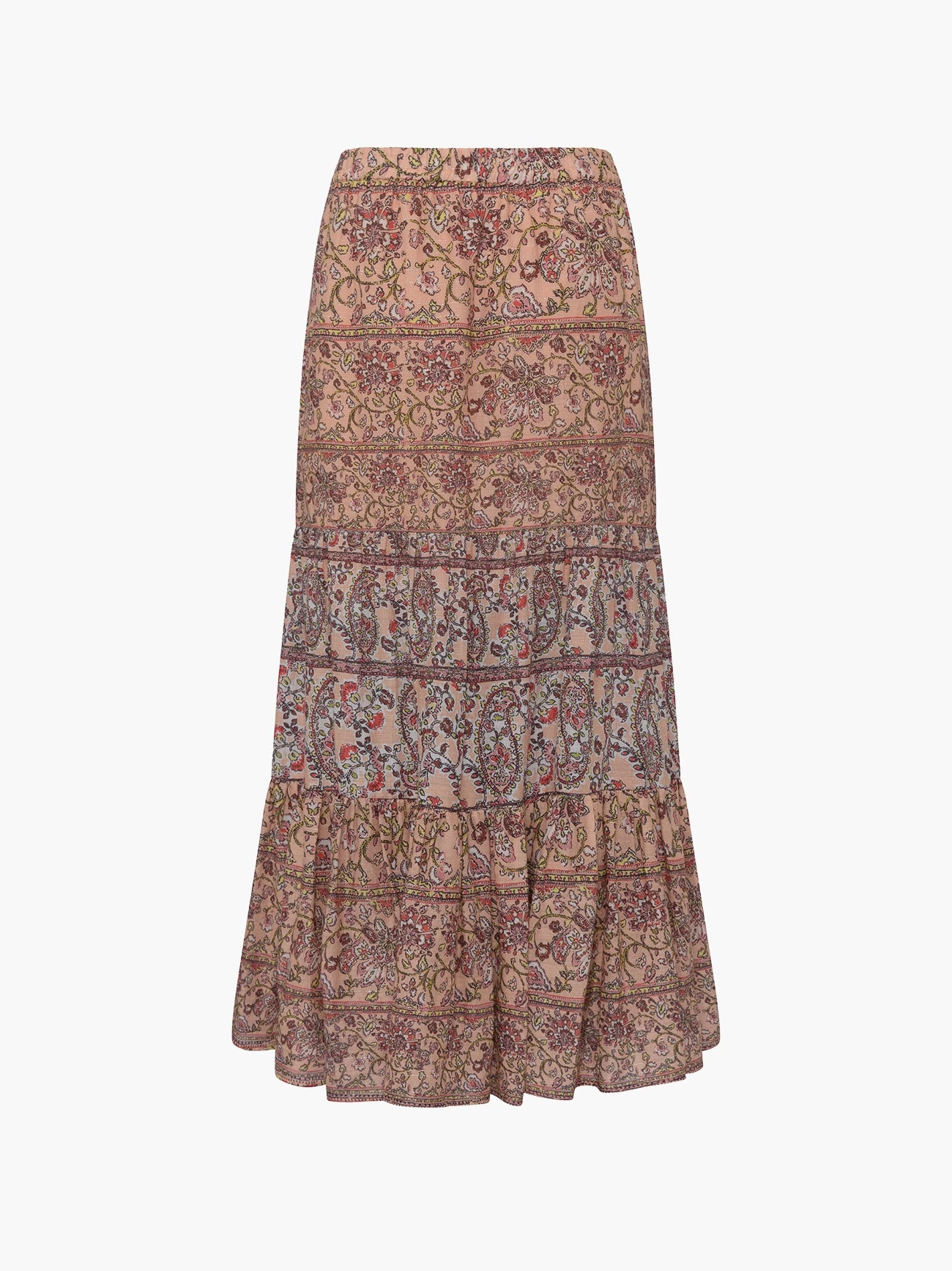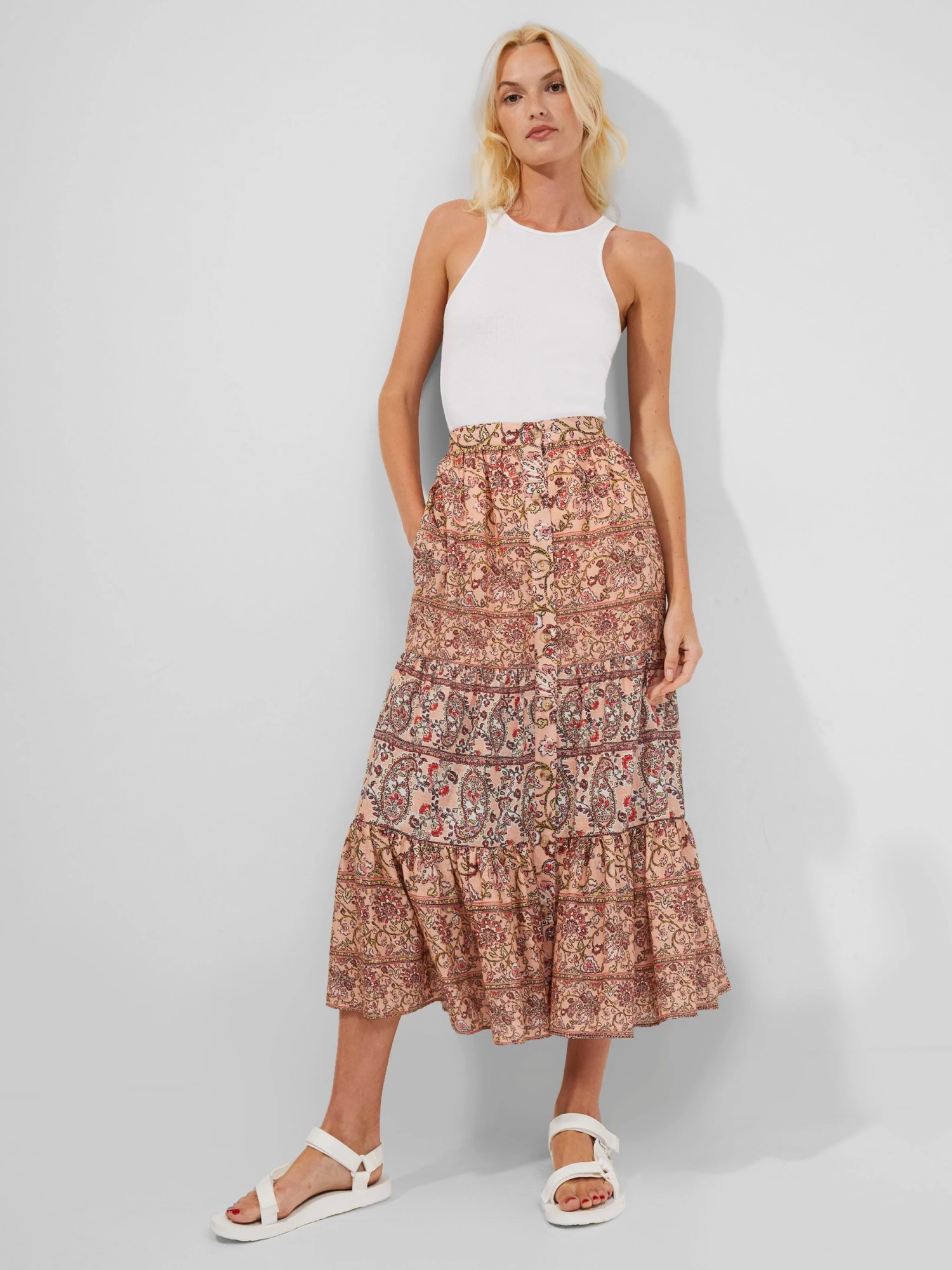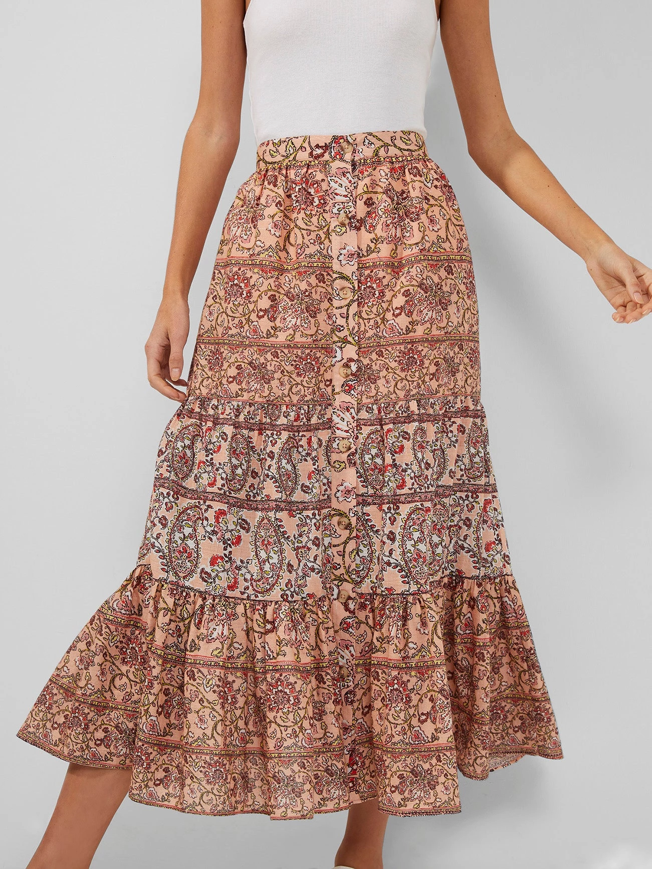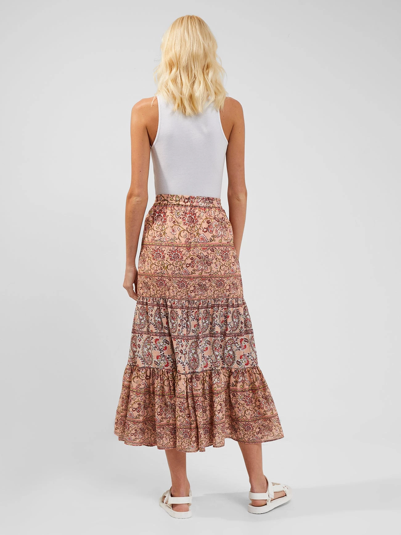 Unleash your inner bohemian with the help of our Cornalia Aurora Peasant Midi Skirt. Gently tiered, it has sparkling threads woven through its colourful profile.