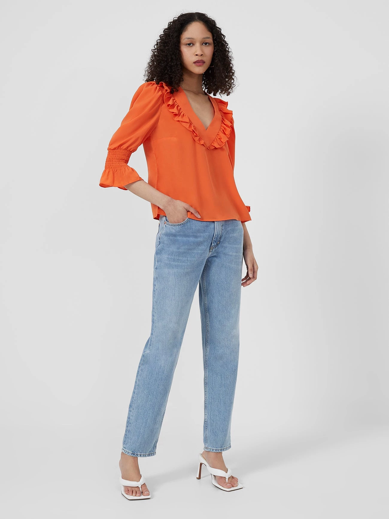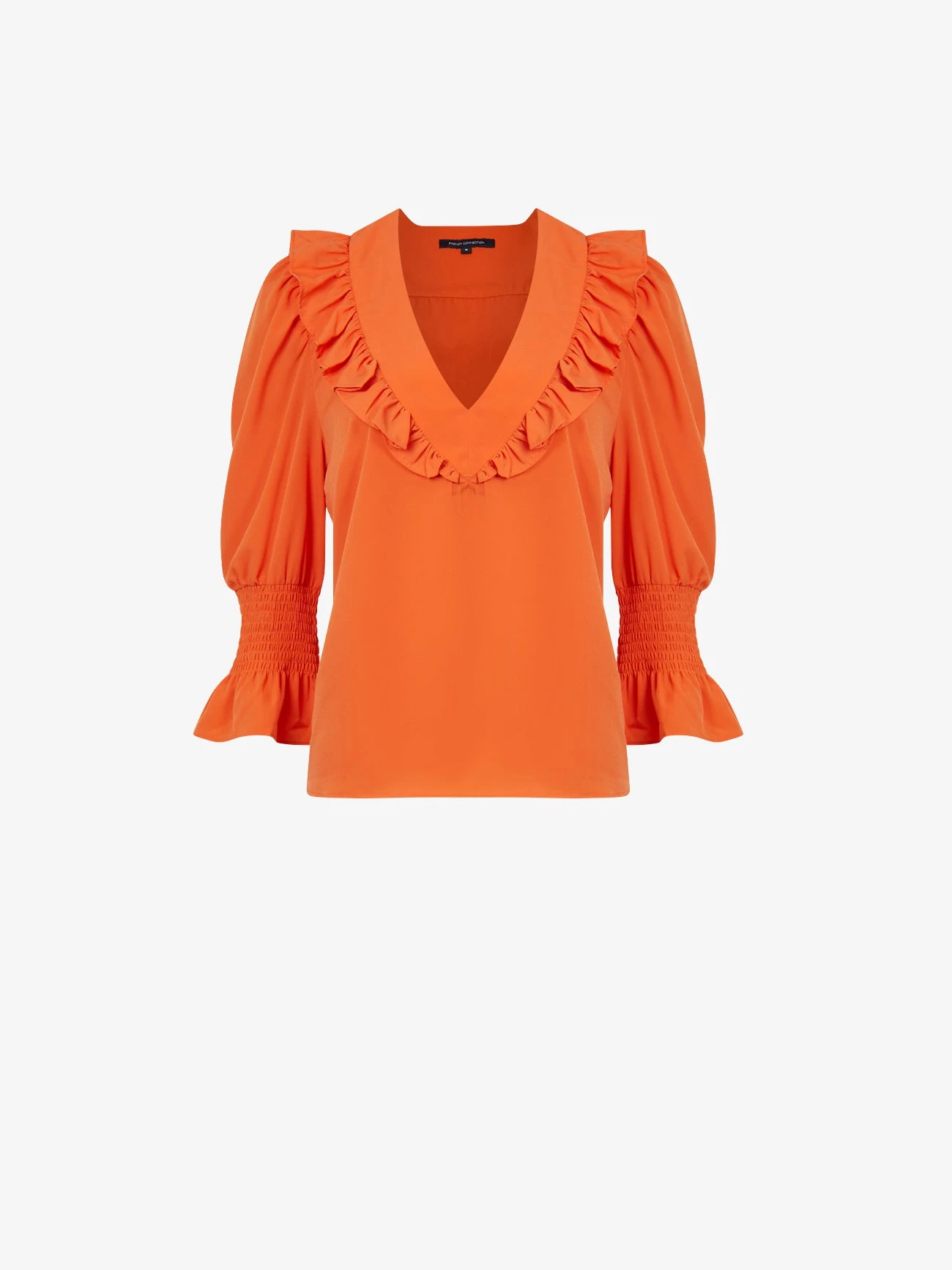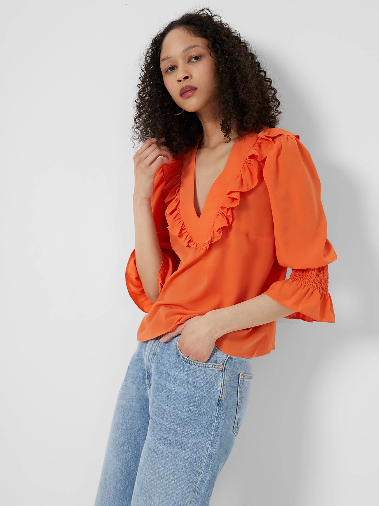 Add spring to your style with the delightful Crepe Light Ruffle Blouse. From day to dinner, this blouse flaunts lively ruffle trims to complement the v-neckline, and 3/4 length sleeves.
