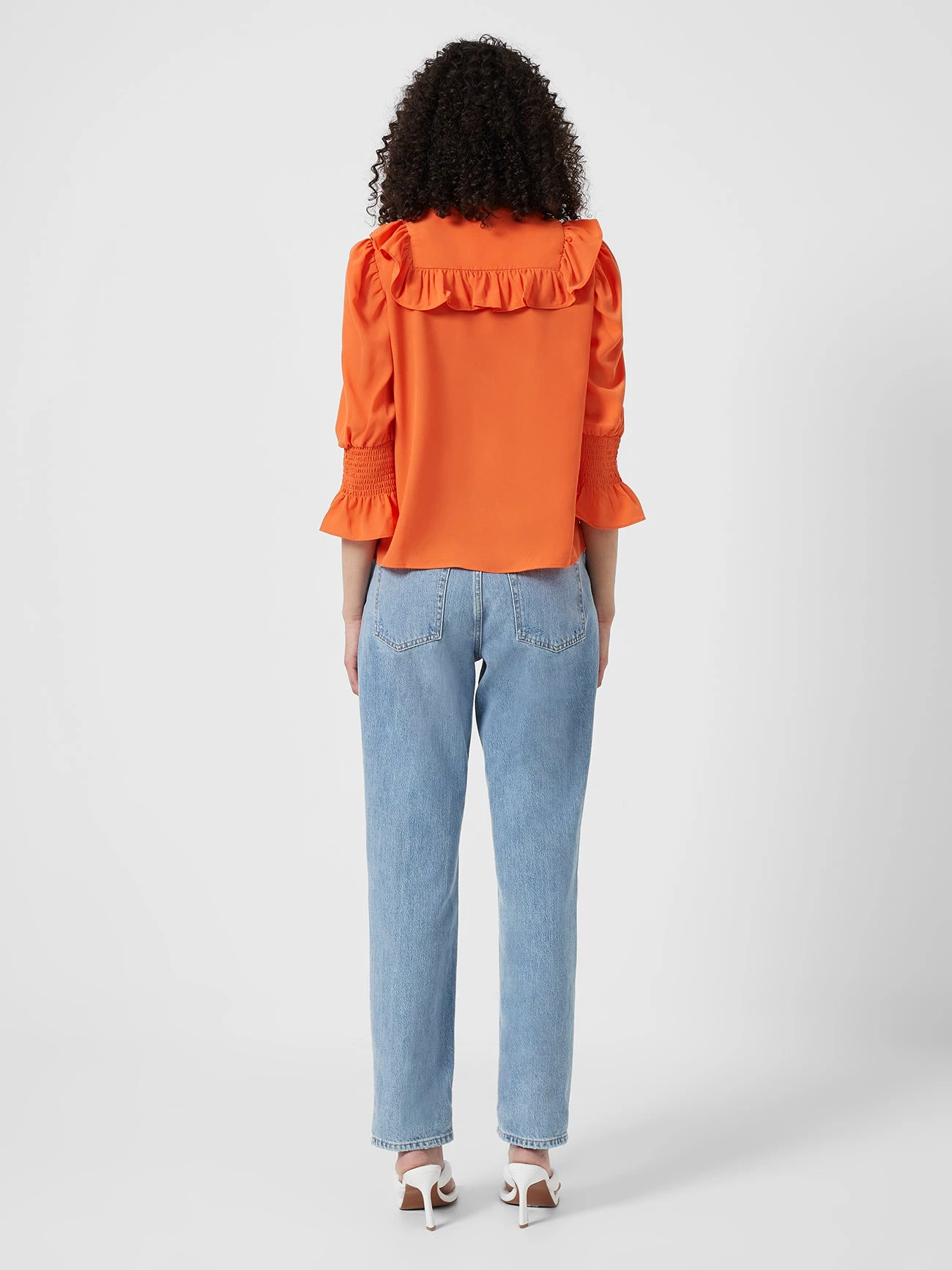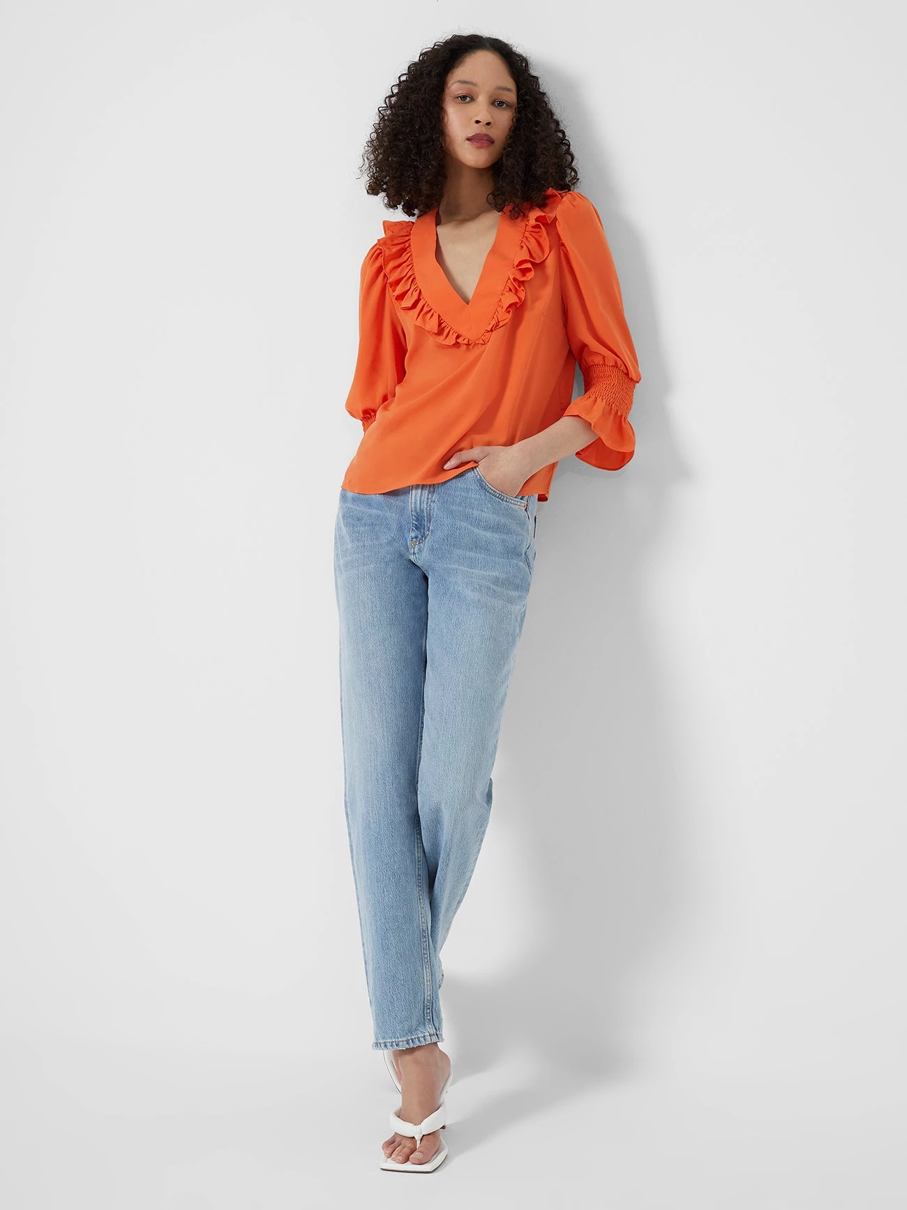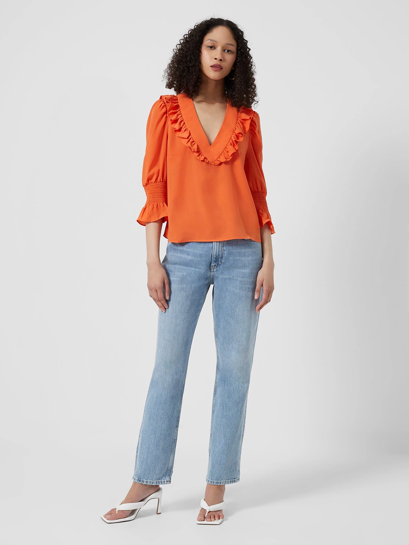 Add spring to your style with the delightful Crepe Light Ruffle Blouse. From day to dinner, this blouse flaunts lively ruffle trims to complement the v-neckline, and 3/4 length sleeves.
