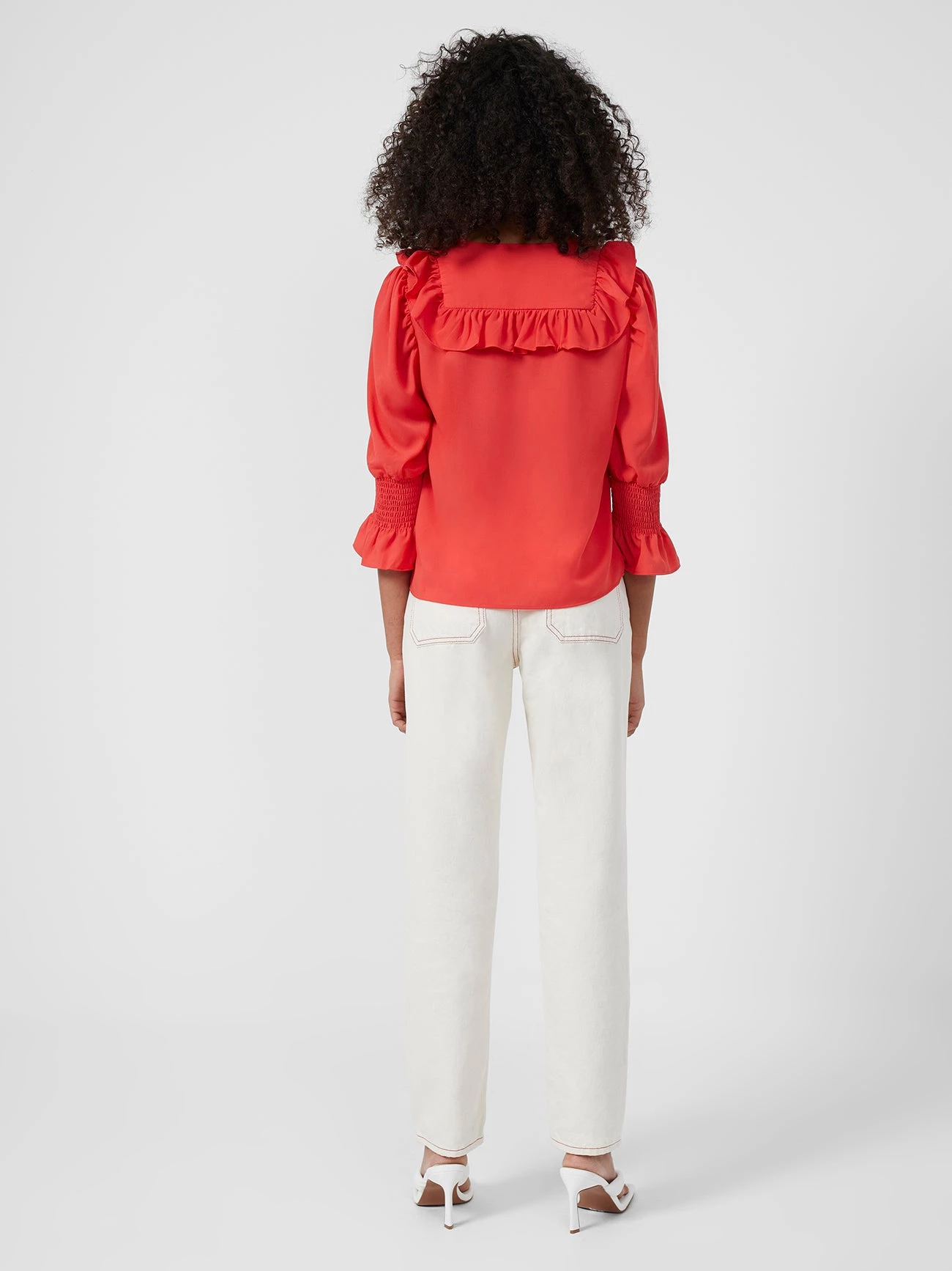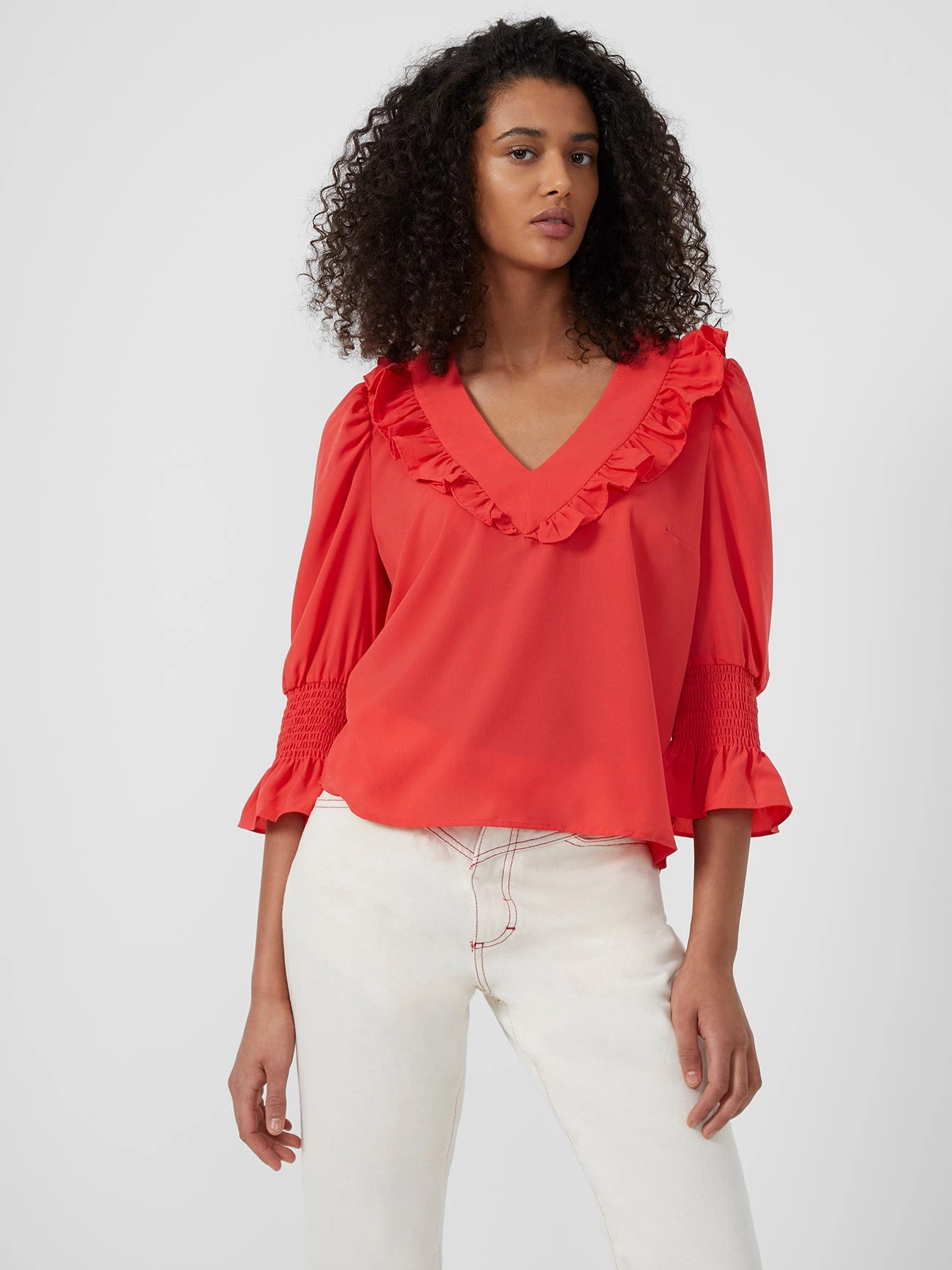 Add spring to your style with the delightful Crepe Light Ruffle Blouse. From day to dinner, this blouse flaunts lively ruffle trims to complement the v-neckline, and 3/4 length sleeves.