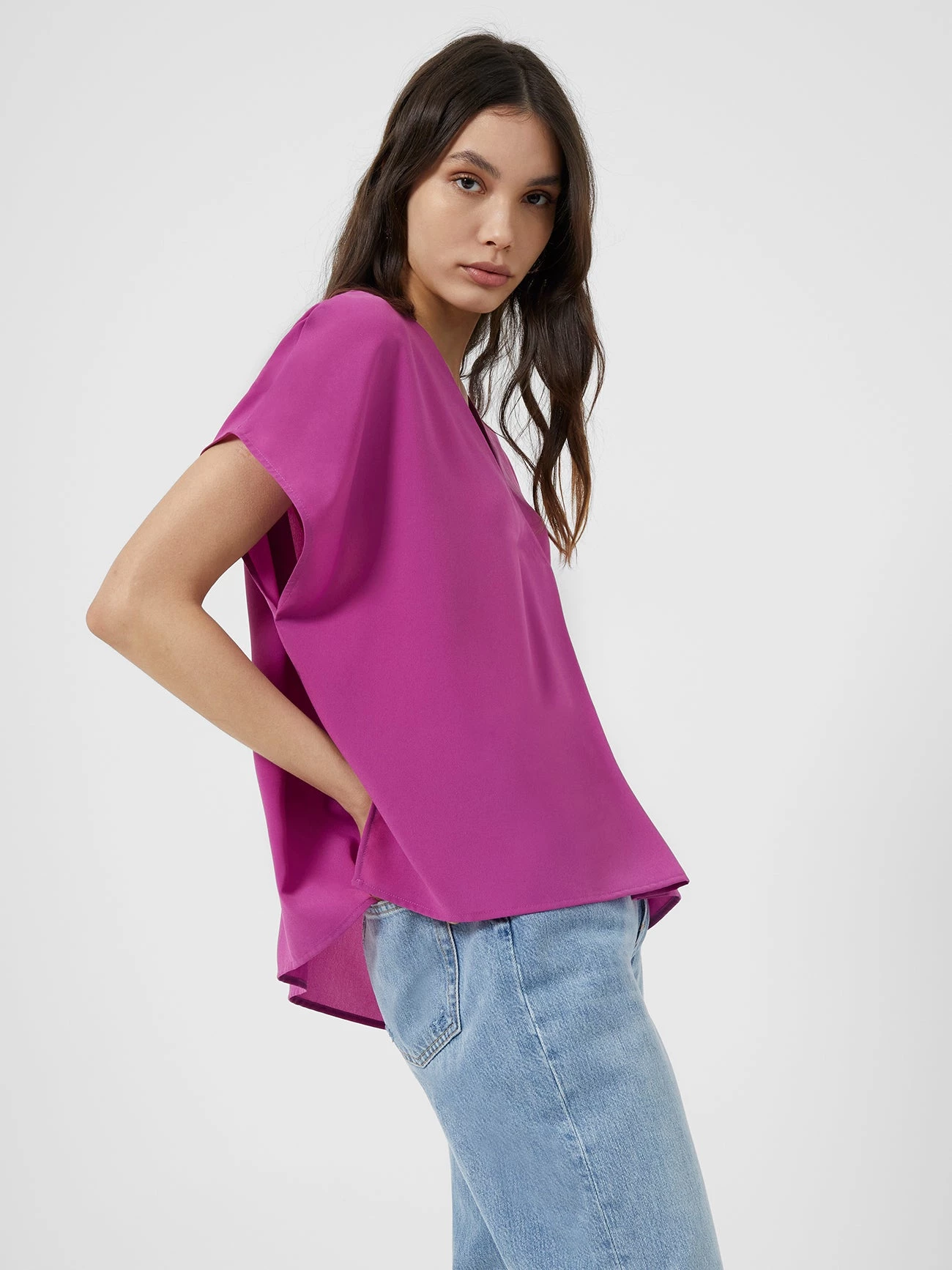 The Crepe Light V-neck Top is destined to become your new go-to basic. It features a relaxed fit, V-neckline and unique fold design.