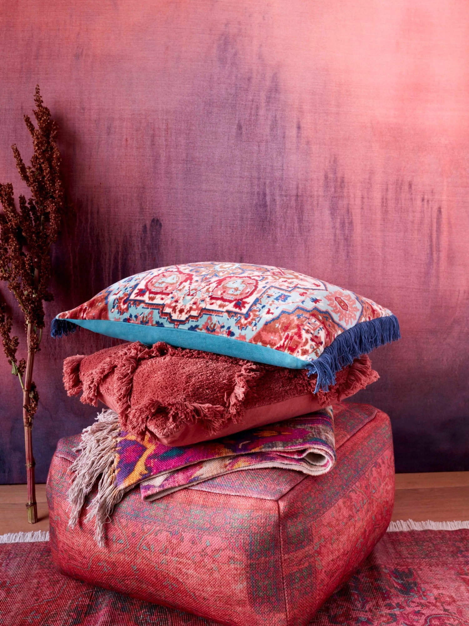 Designed in rich crimson tones with a deliberate love-worn appearance, the Crimson Cassis Pouffe boasts a delicate vintage-inspired floral pattern, printed onto a piece made entirely from recycled plastic bottles. Use yours to add softness to wooden flooring, and curate a coordinated aesthetic with the matching Cassis cushion.
