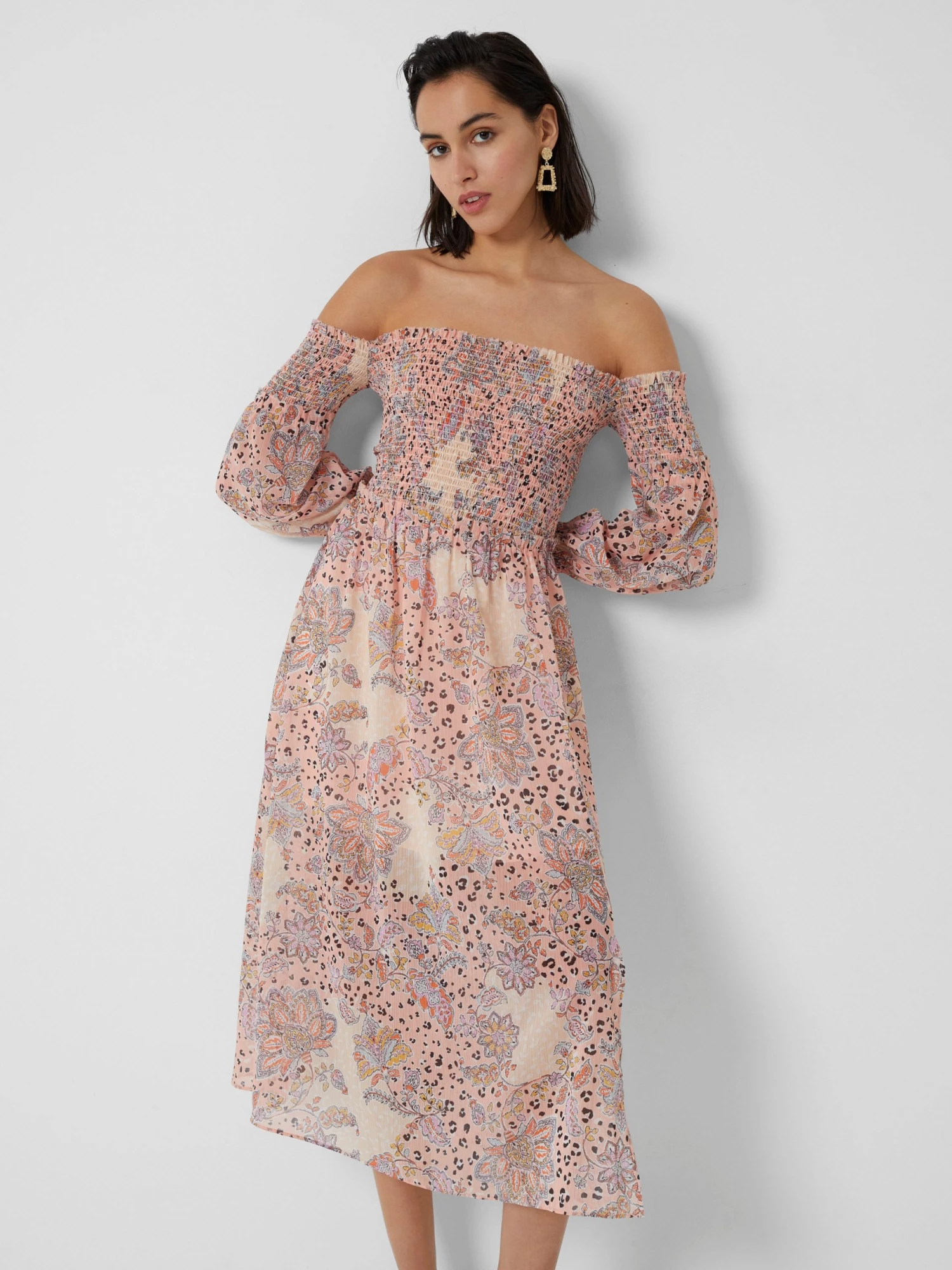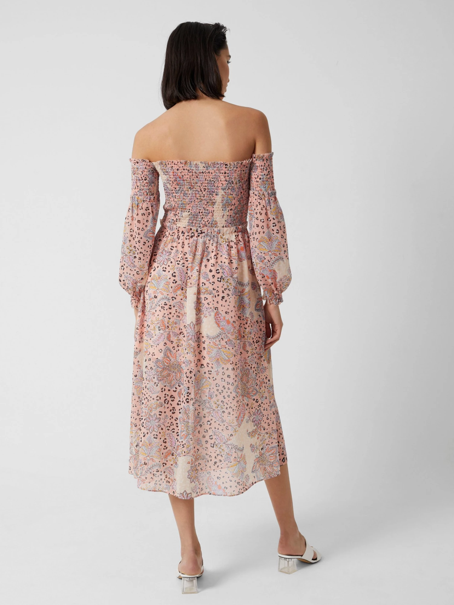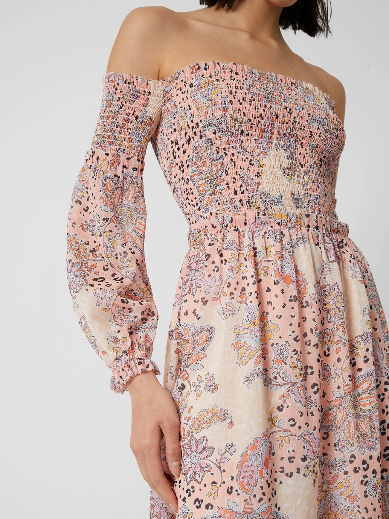 Let your shoulders catch sunrays in the Demetra Recycled Hallie Crinkle Dress. With an off-the shoulder neckline, paisley prints and smocked details it’s just perfect.