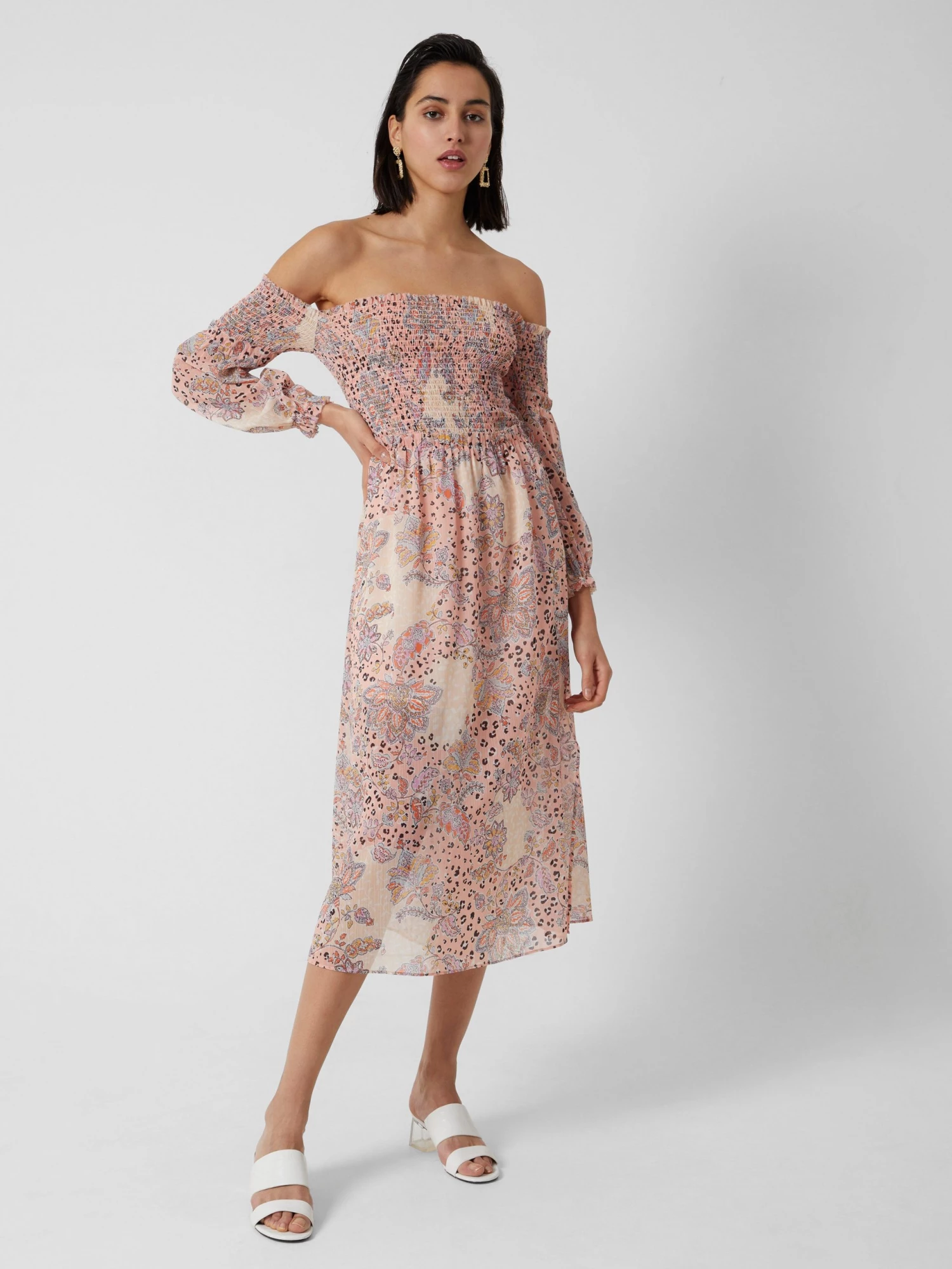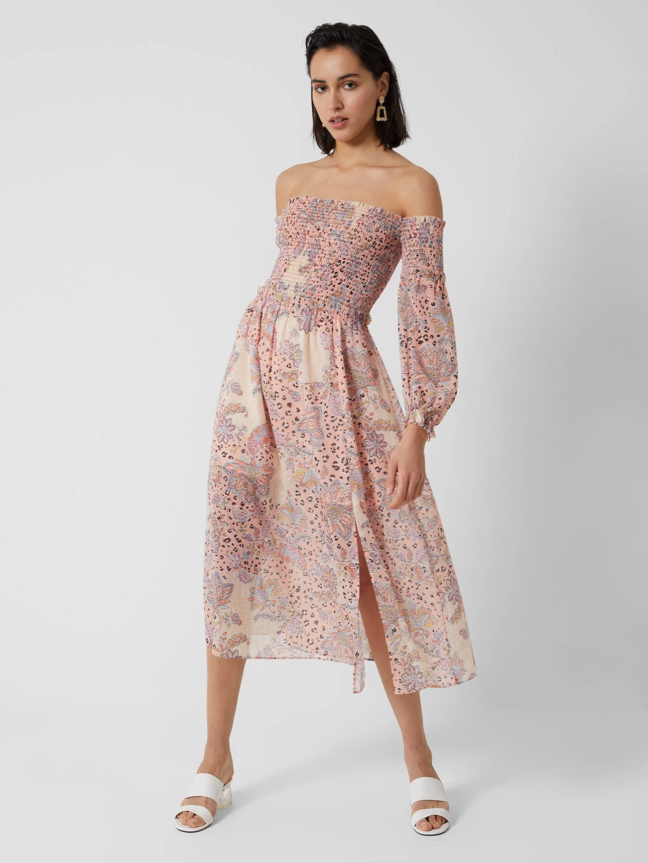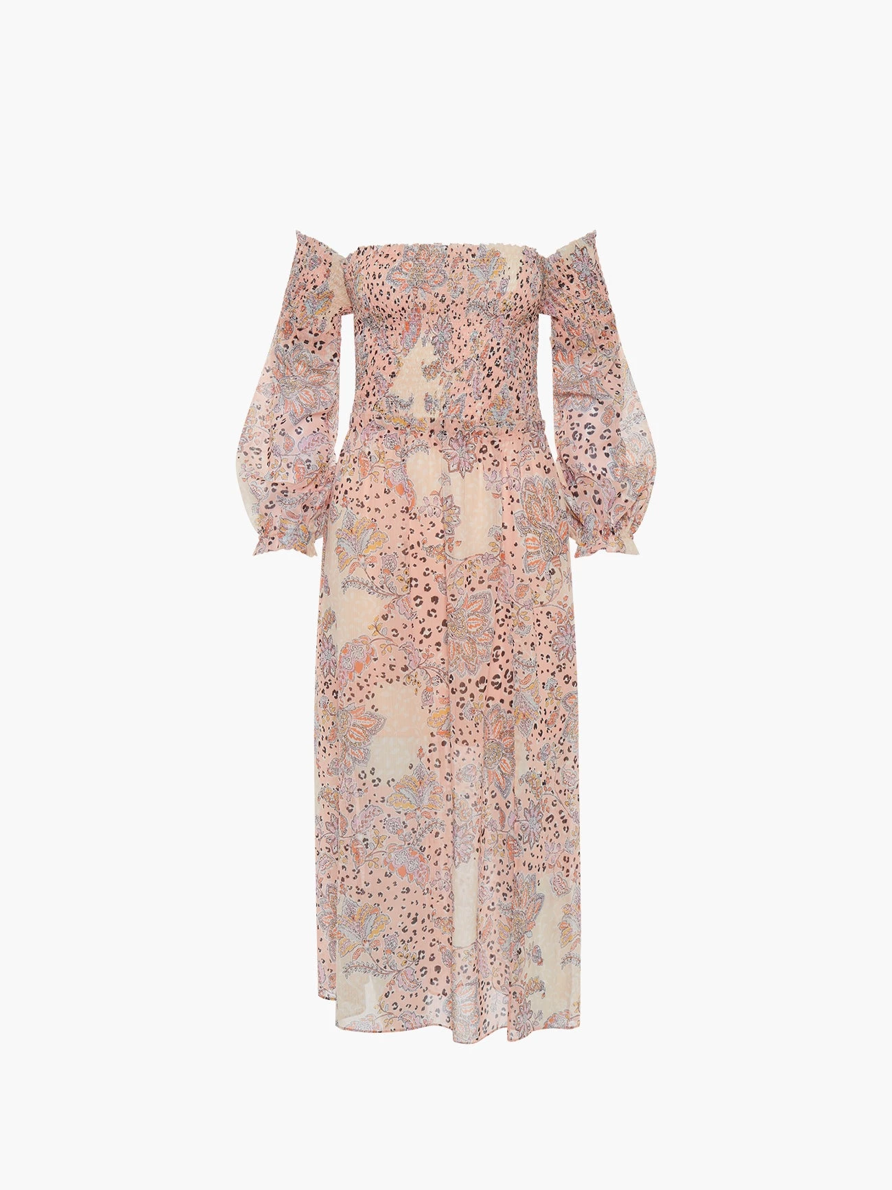 Let your shoulders catch sunrays in the Demetra Recycled Hallie Crinkle Dress. With an off-the shoulder neckline, paisley prints and smocked details it’s just perfect.