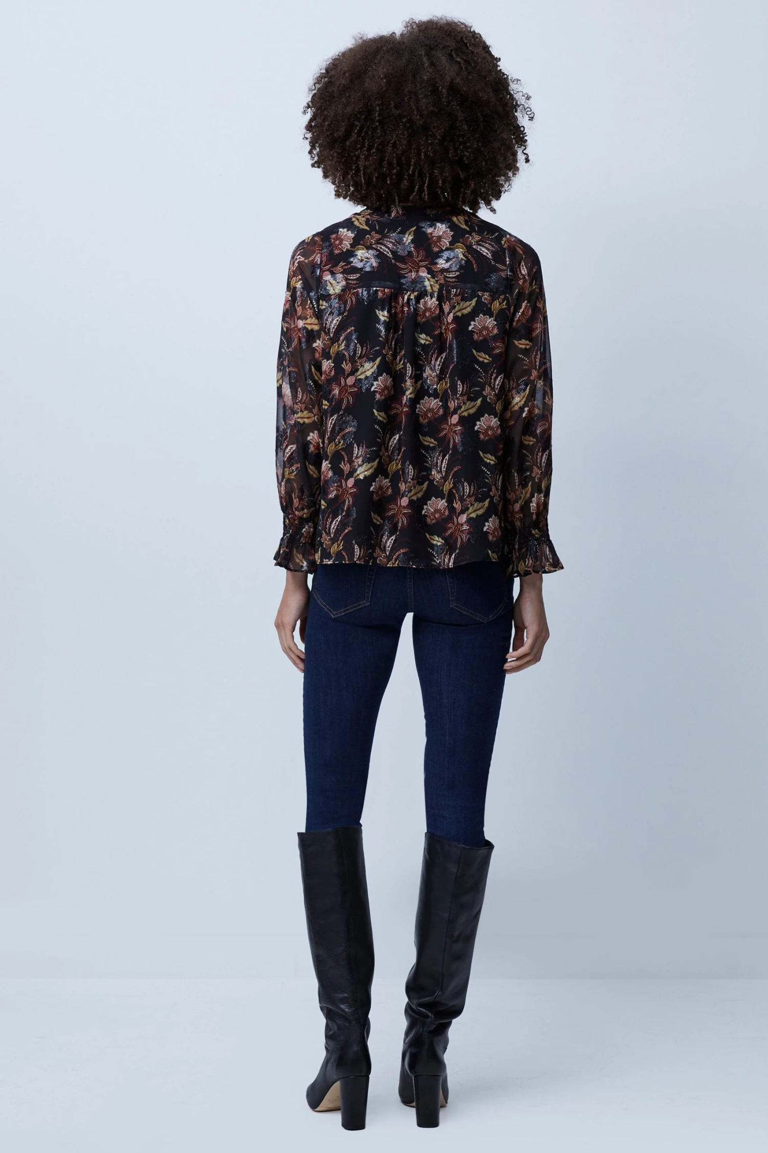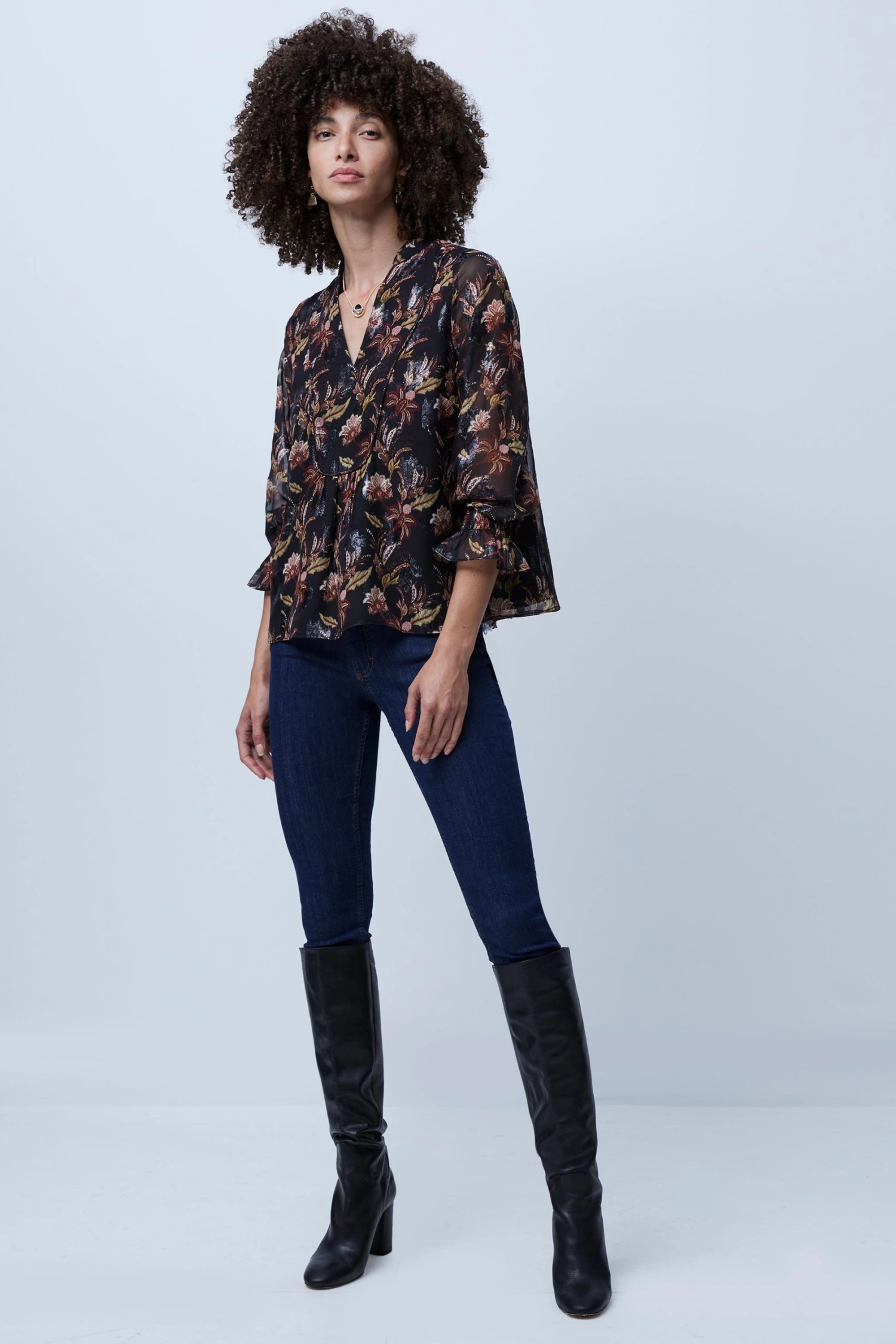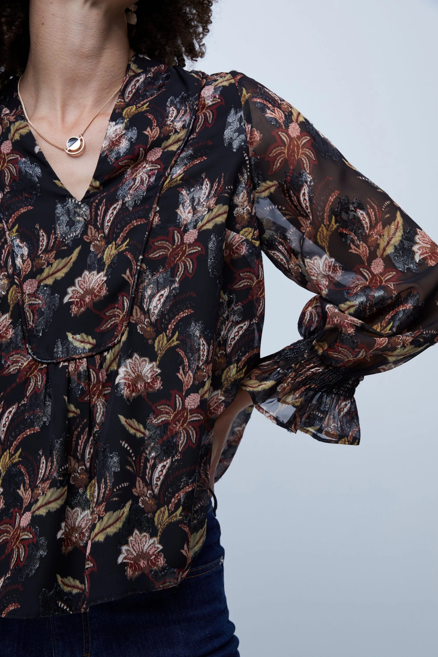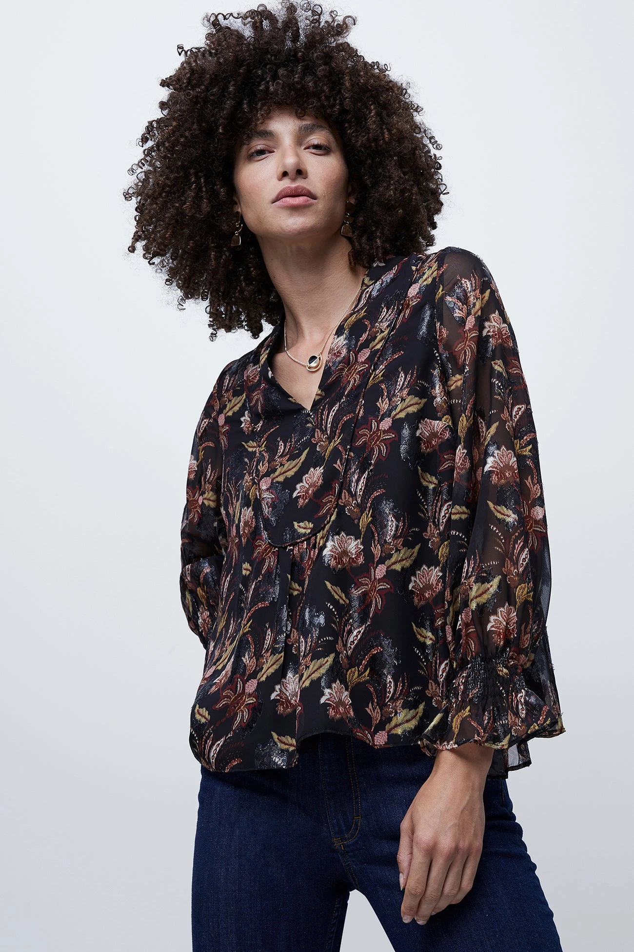 Add elegant embroidery and winter-ready rich jewel tones to your wardrobe with the Desta Fil De Coupe Smock Top. Created with a flattering v neckline, long sleeves and a relaxed, draped fit, the blouse instantly steps up your smart-casual aesthetic. Compliment the wintry florals and elegant detailing with simple separates and leather accessories for a refined ensemble.