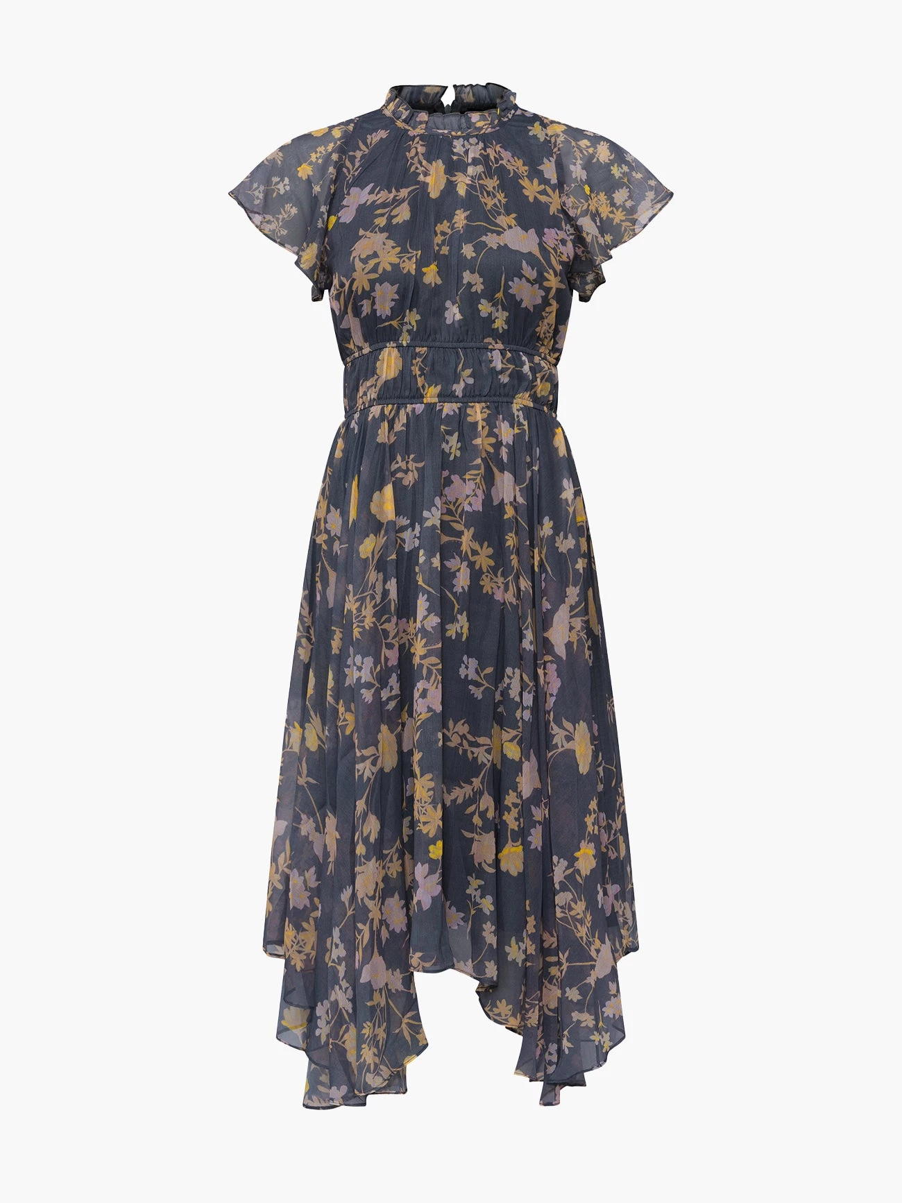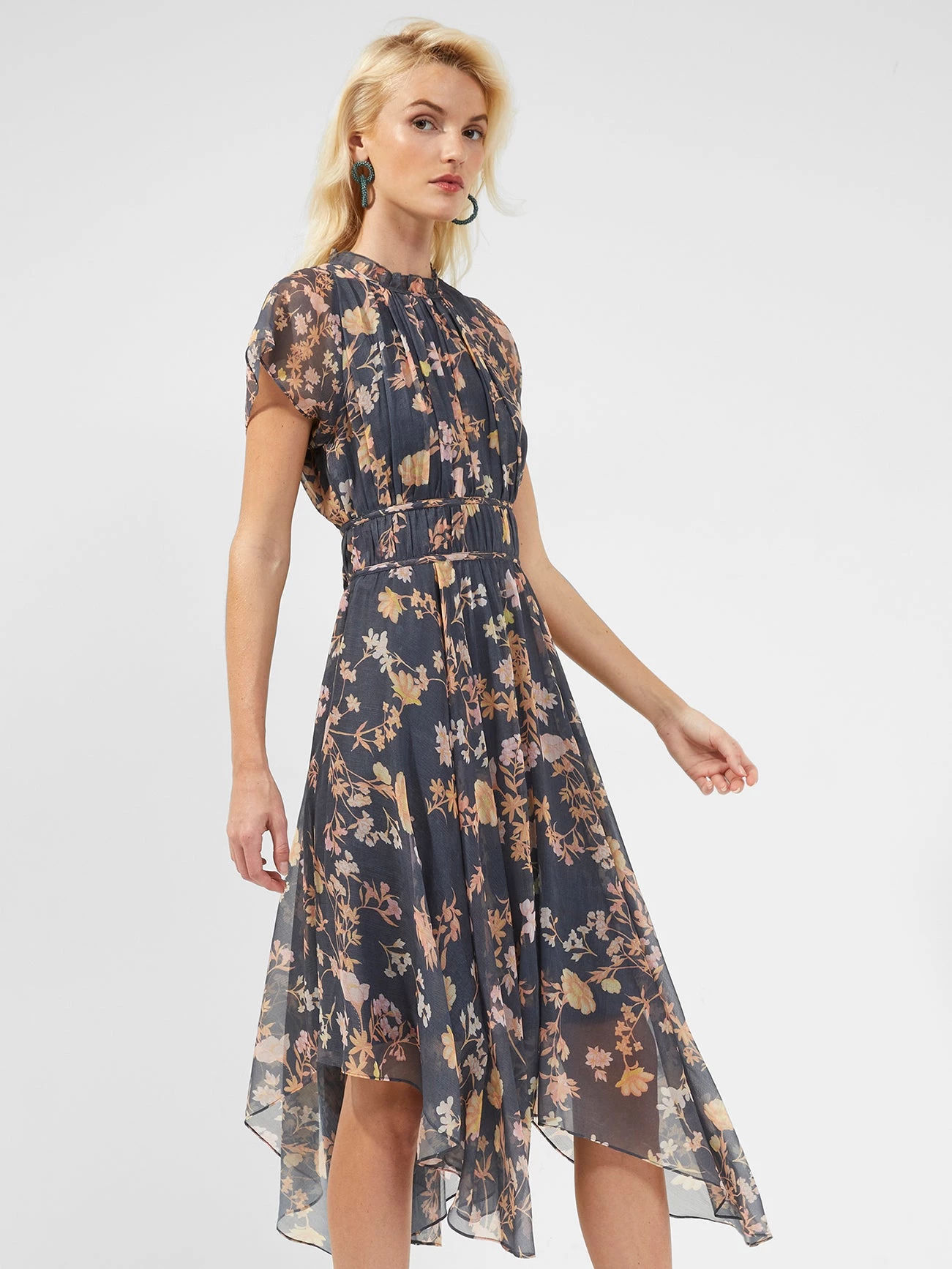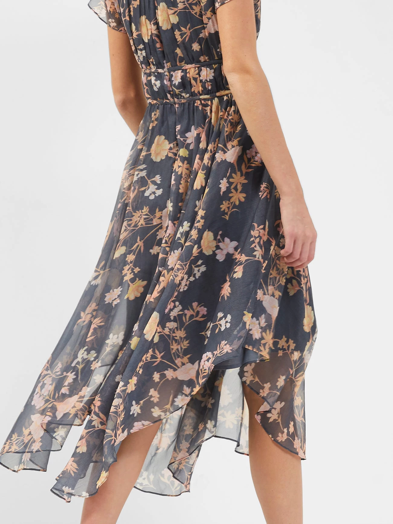 Envelop yourself in a sheer veil of beauty with the Diana Recycled Crinkle Flowing Dress. Designed with an asymmetric scarf hem and floral print.