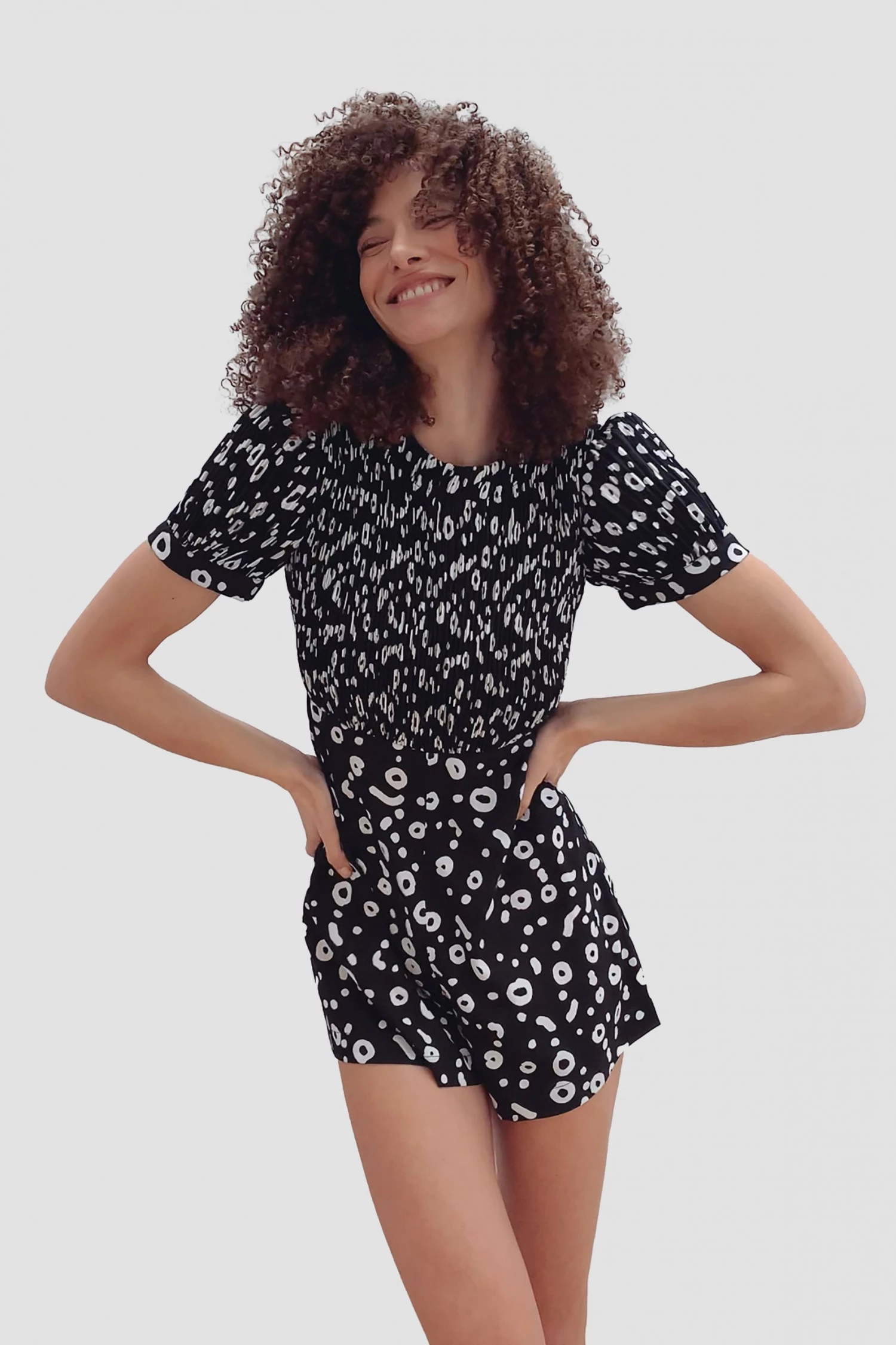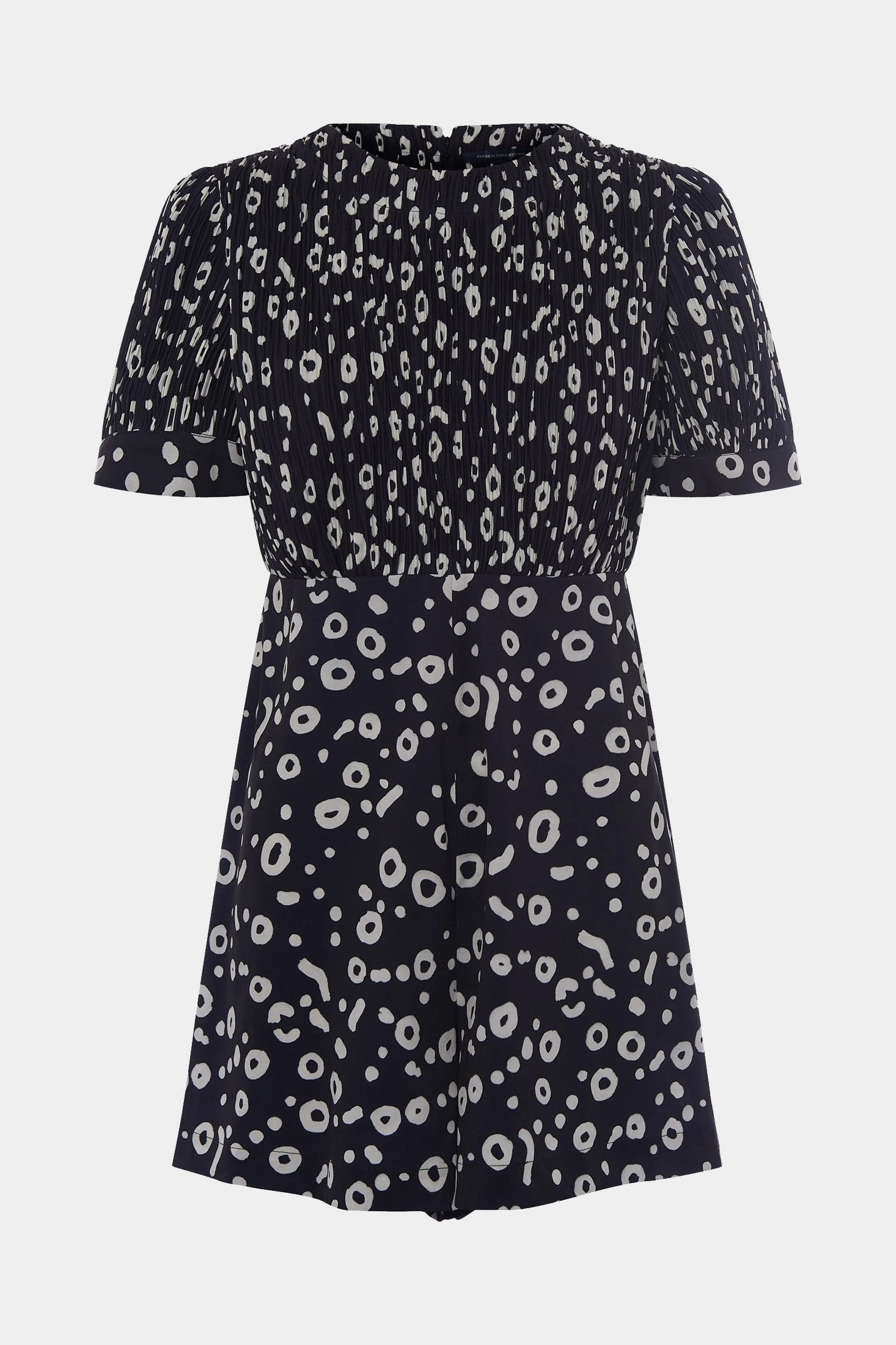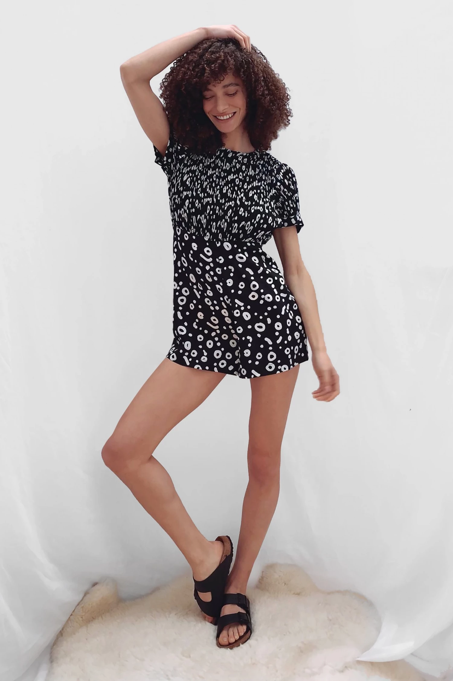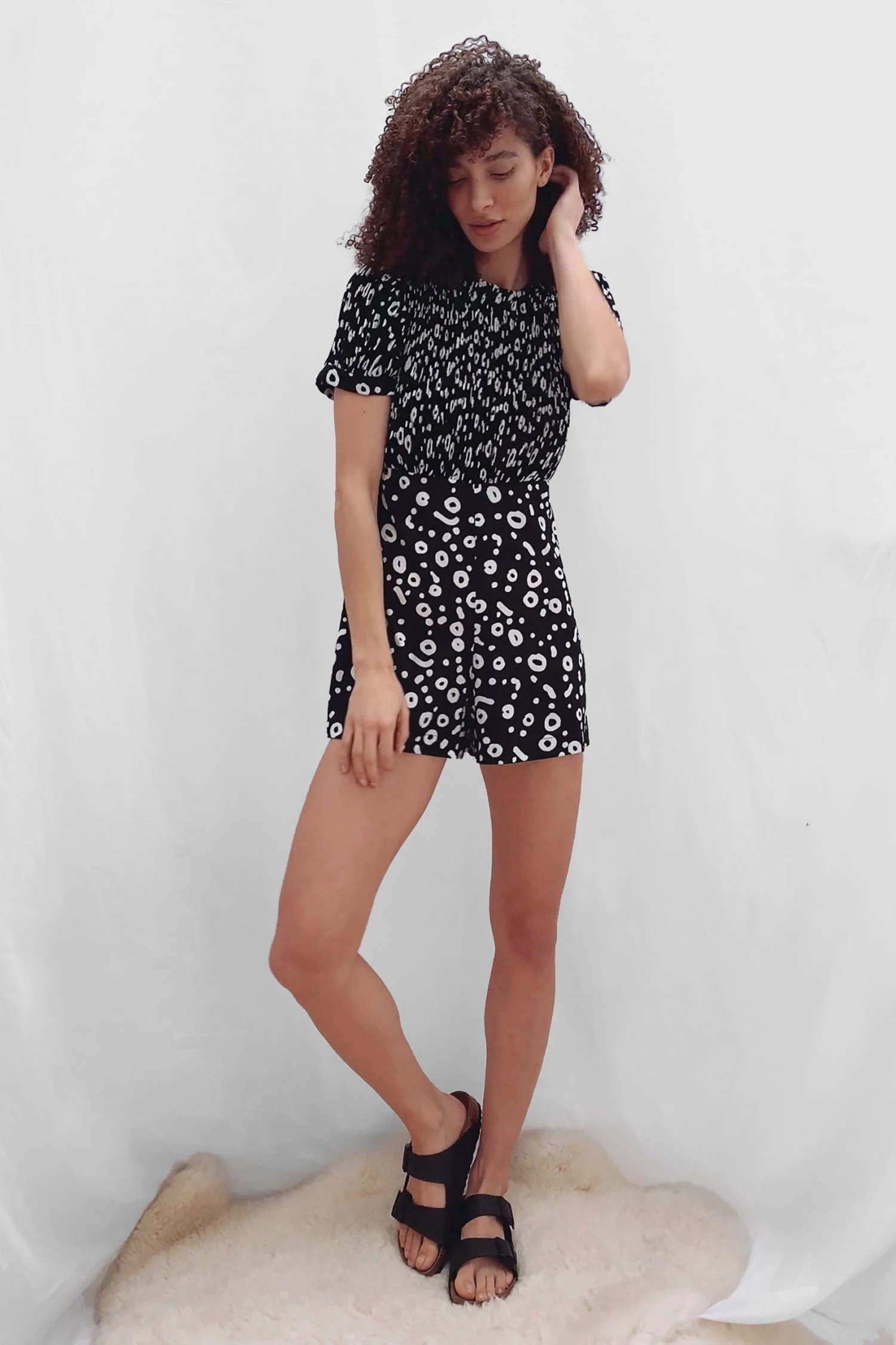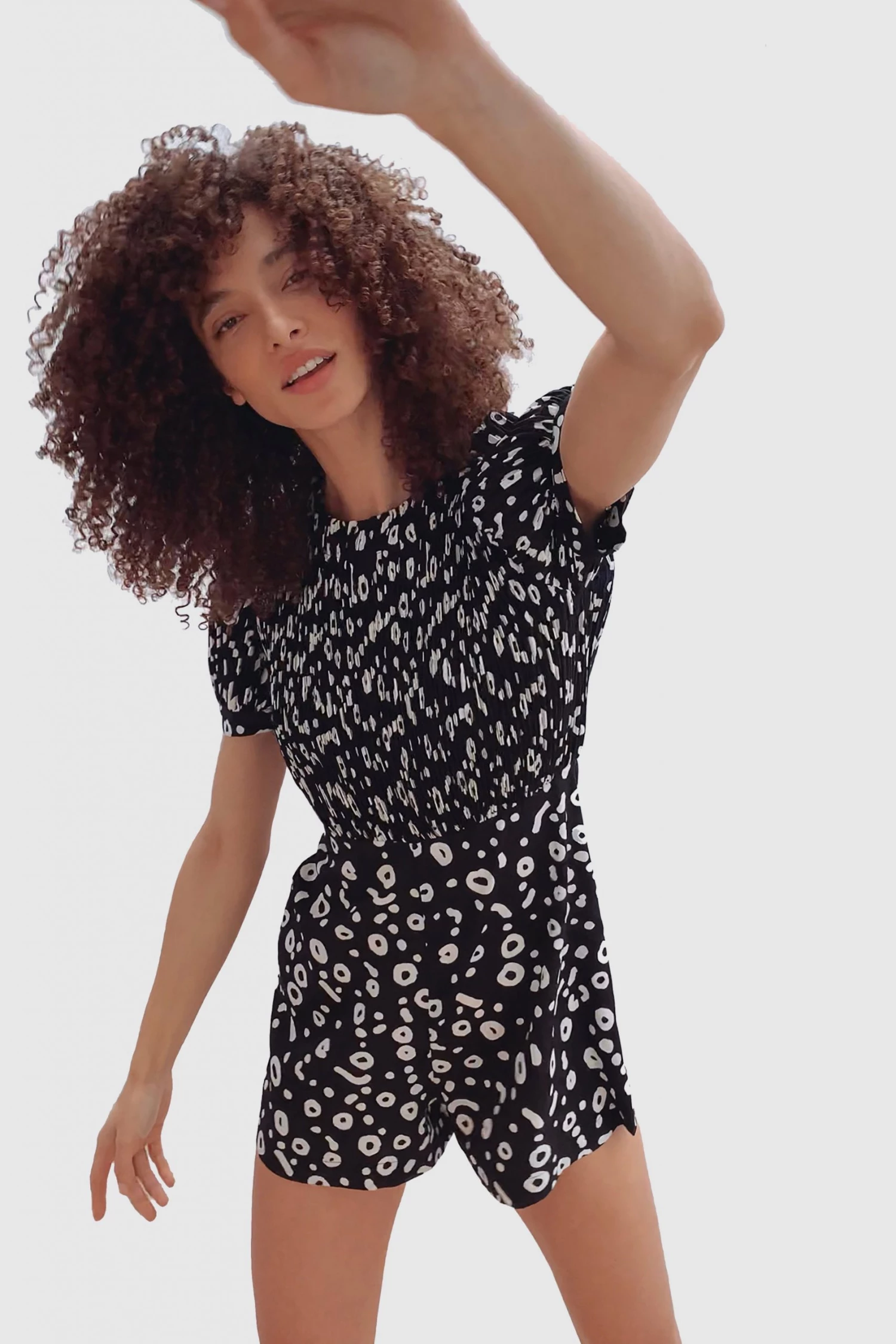 It’s always play time when you’re dressed in our Doe Crepe Playsuit. Featuring a contrasting geometric print, it’s finished with short sleeves and subtle smocking.