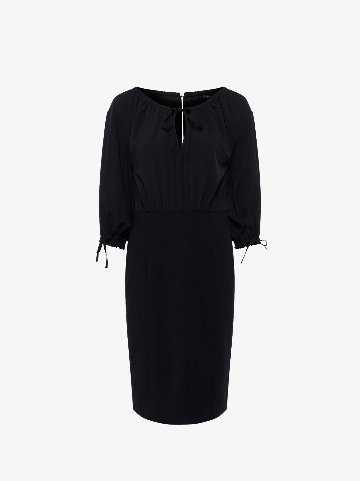 So sleek yet effortless at the same time. The Courtney Crepe Mix Fitted Mini Dress has a draped bodice with tie accents counterbalanced by a fitted skirt.