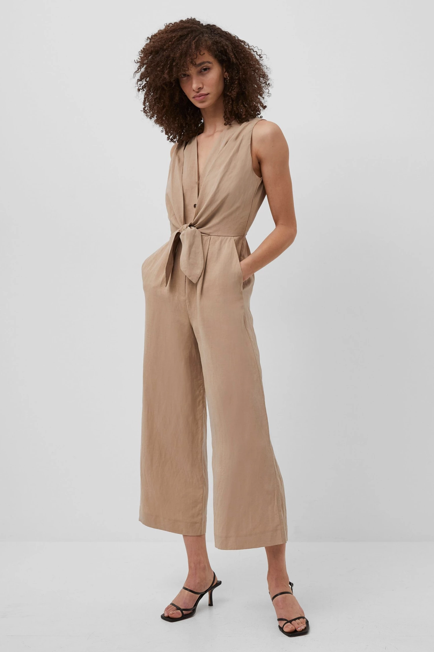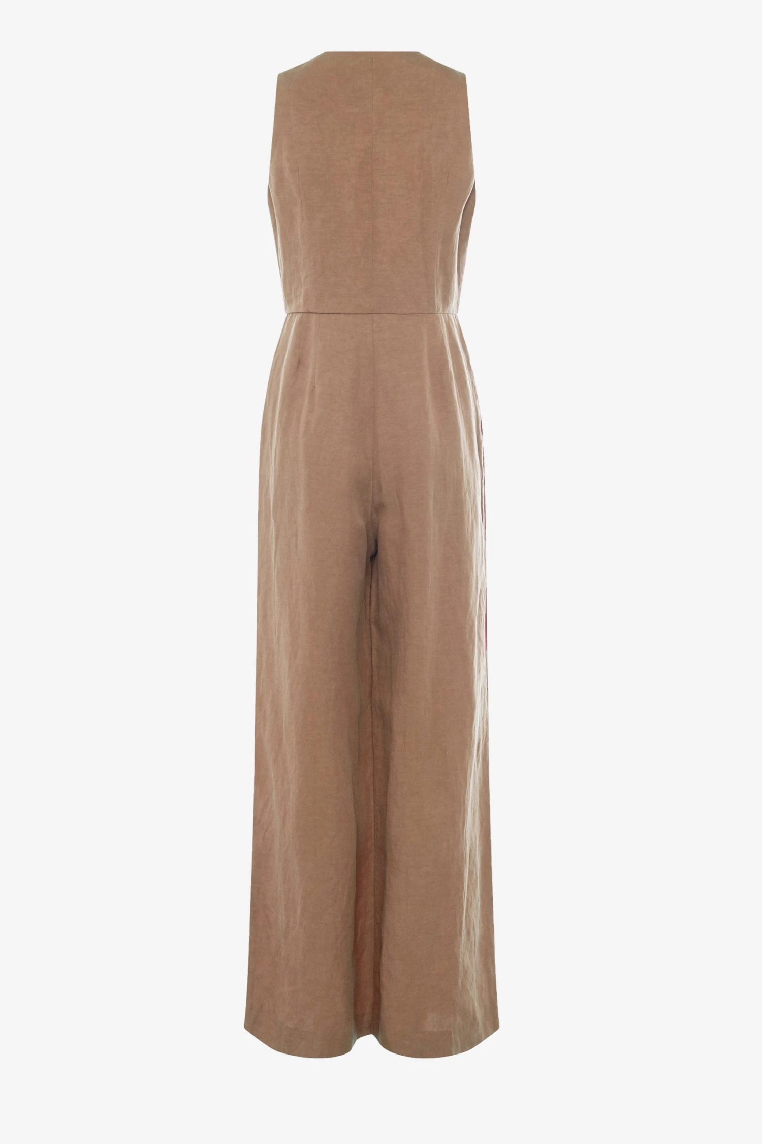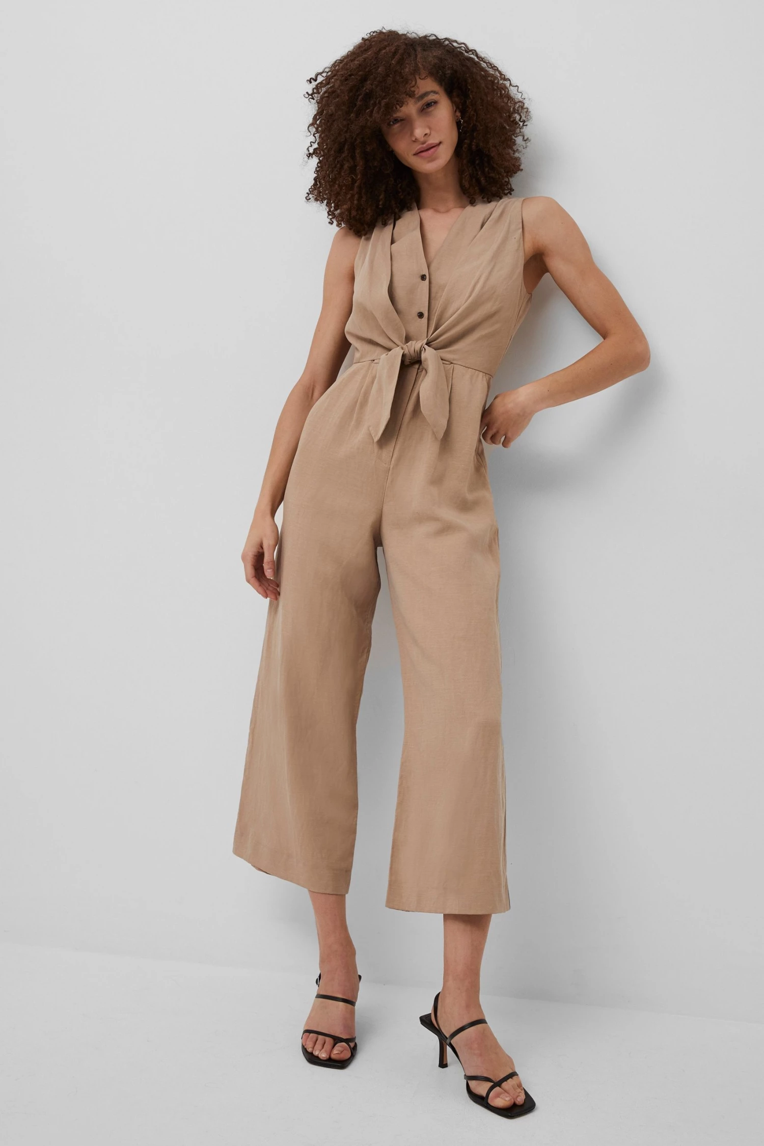 Lightweight and effortless, the Ecre Linen Tie Waist Jumpsuit is an essential piece for warm-weather styling. Featuring a sleeveless shape, V neckline and cropped wide fit.