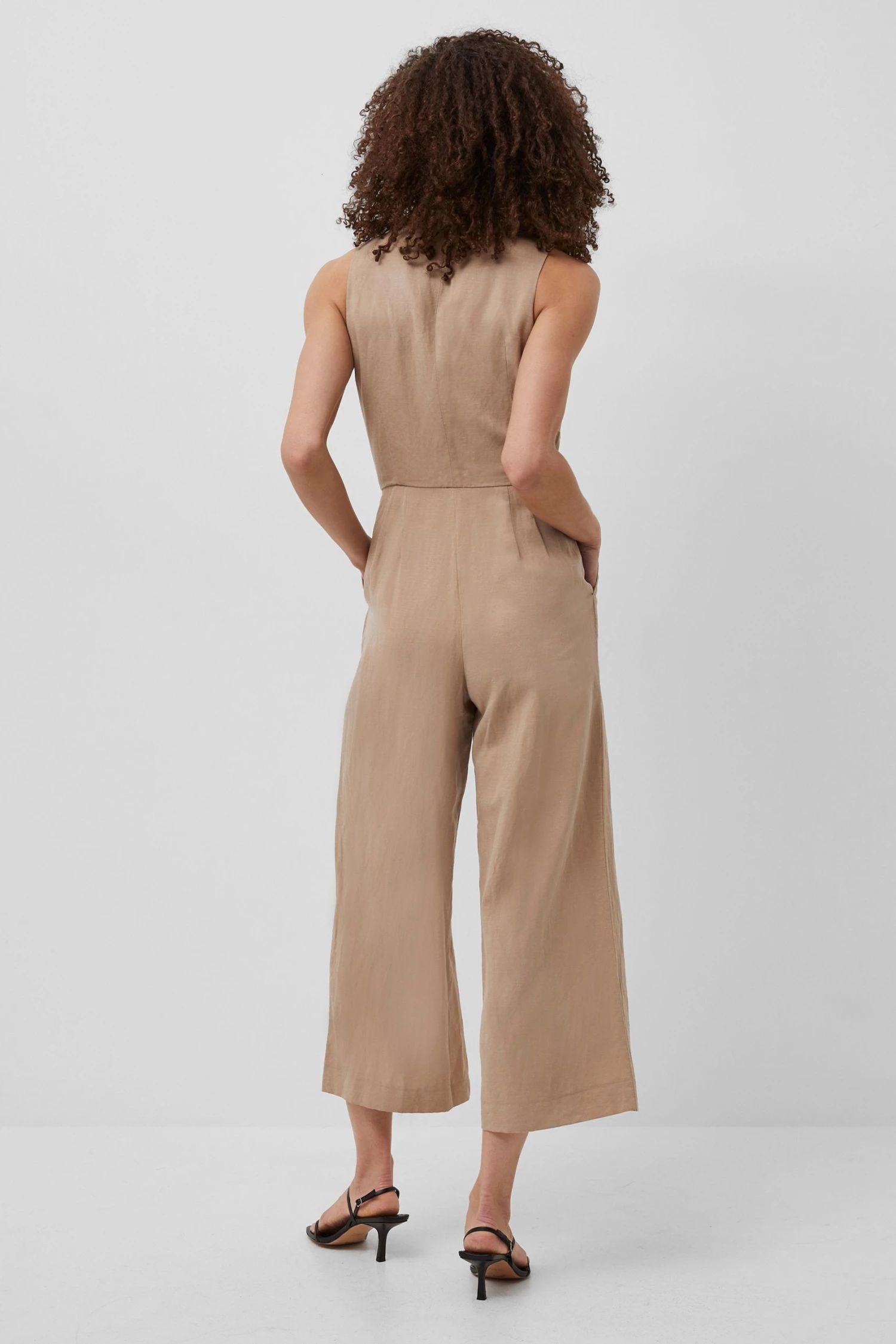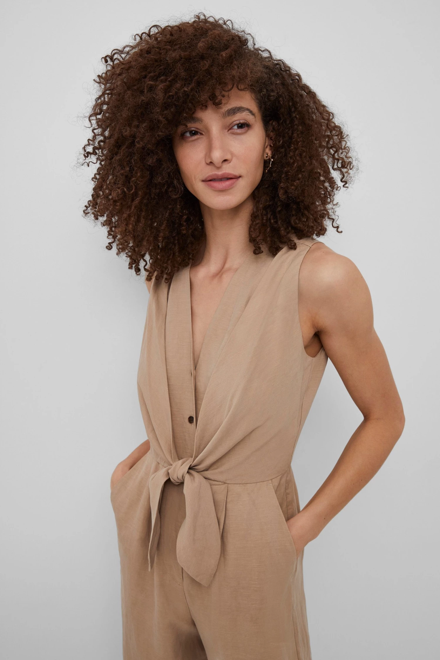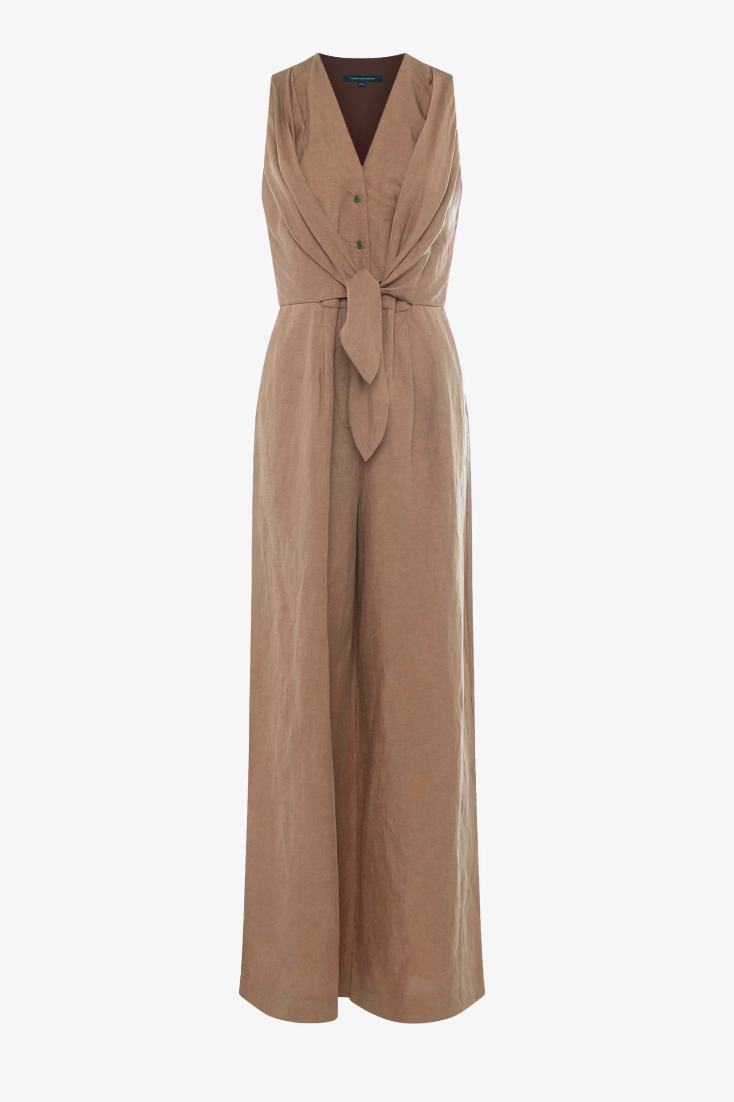 Lightweight and effortless, the Ecre Linen Tie Waist Jumpsuit is an essential piece for warm-weather styling. Featuring a sleeveless shape, V neckline and cropped wide fit.