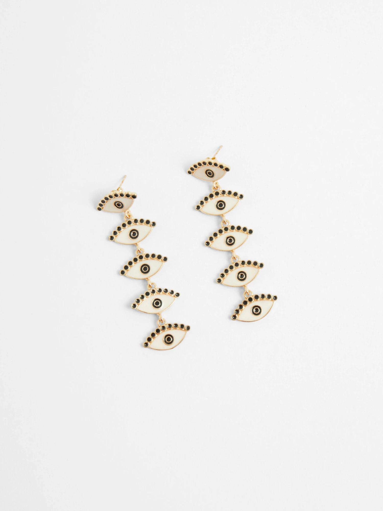 Awaken your third eye with the Eye Eye Earrings. This hypnotic pair is constructed from five gold-tone eyes hanging on a sleek chain.