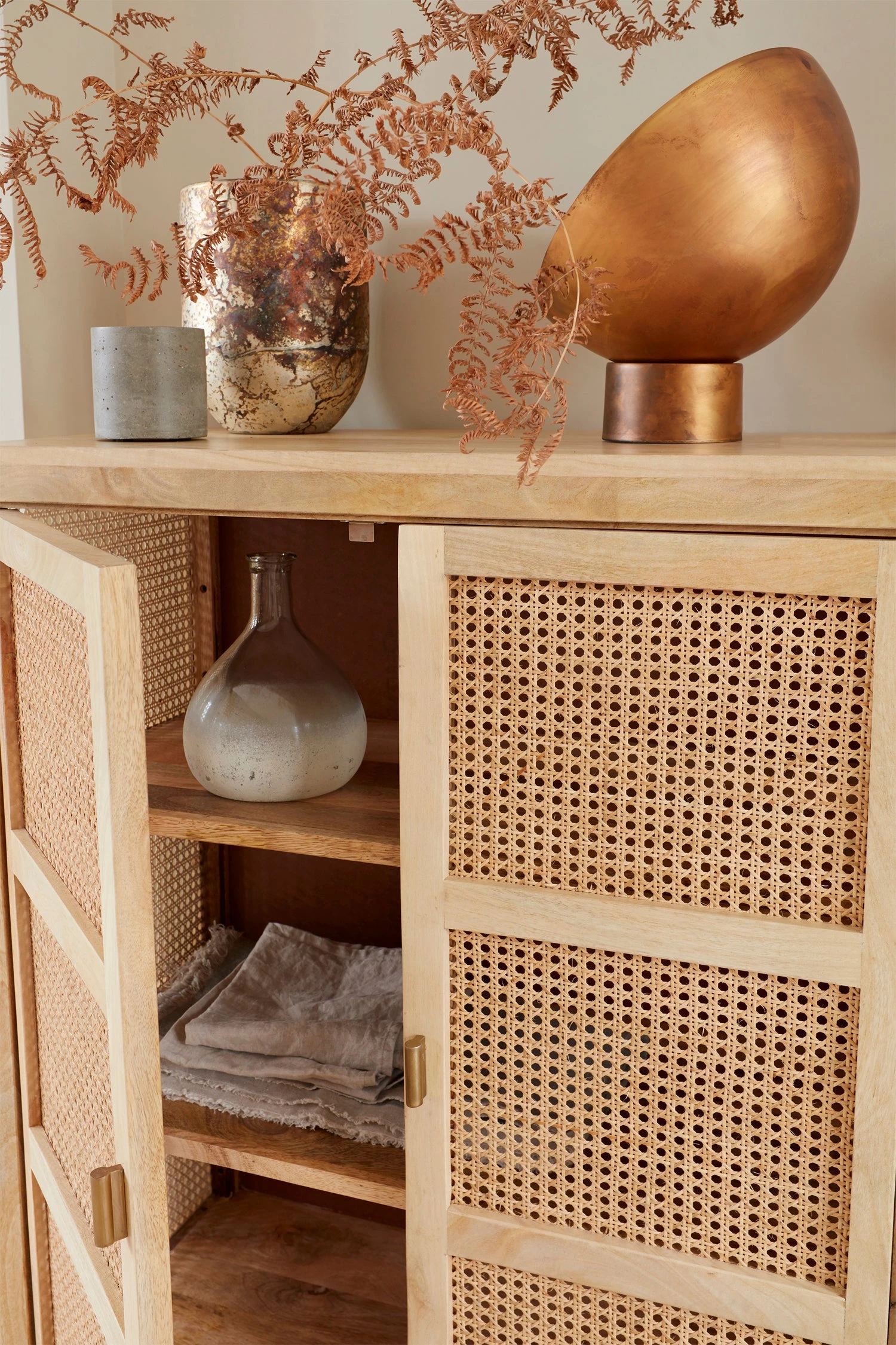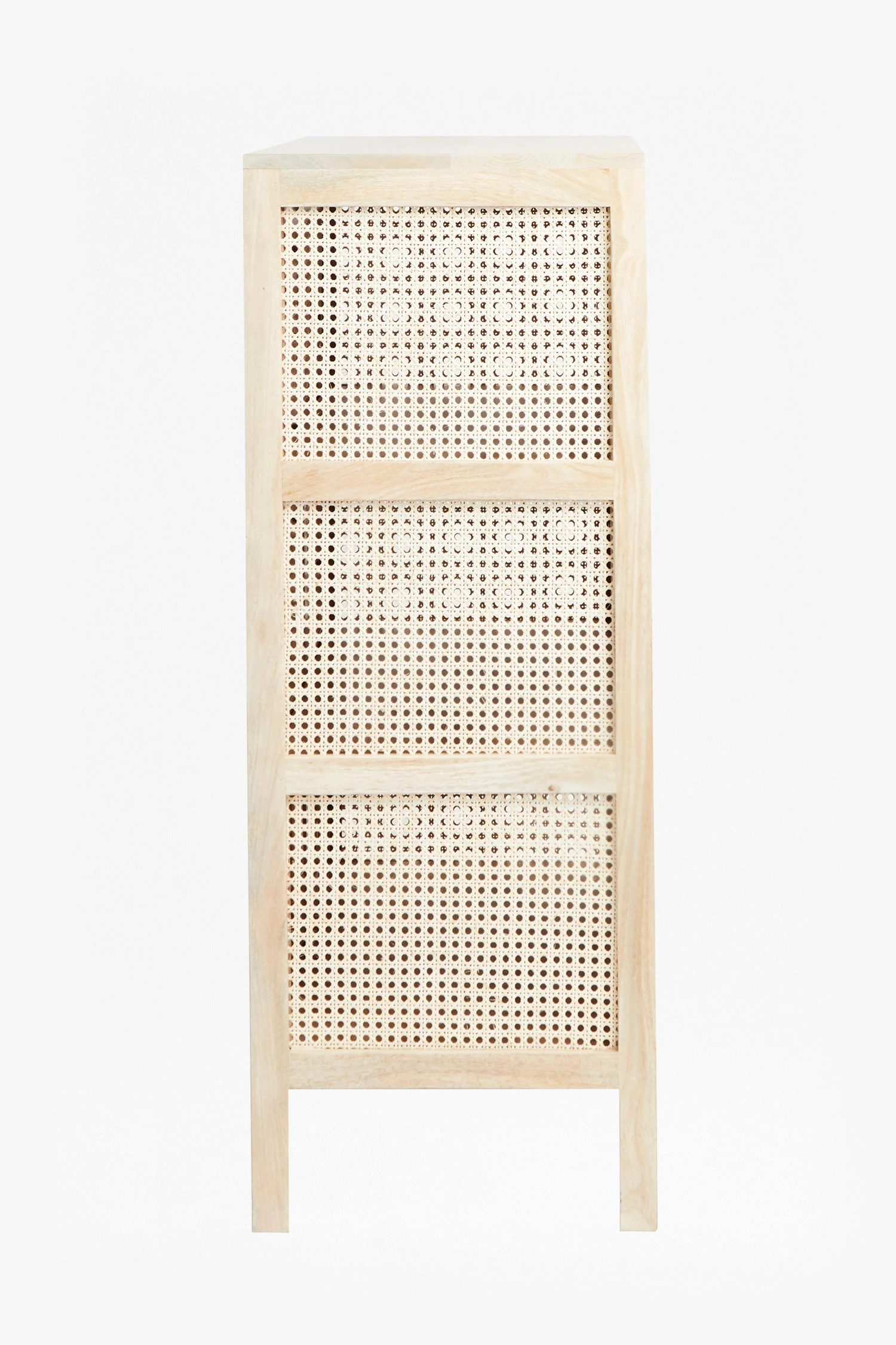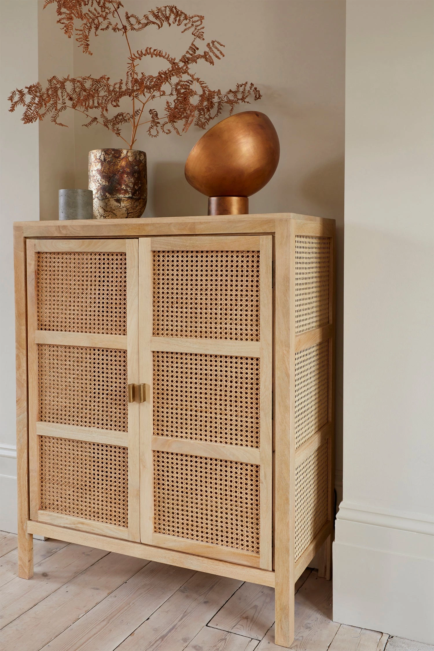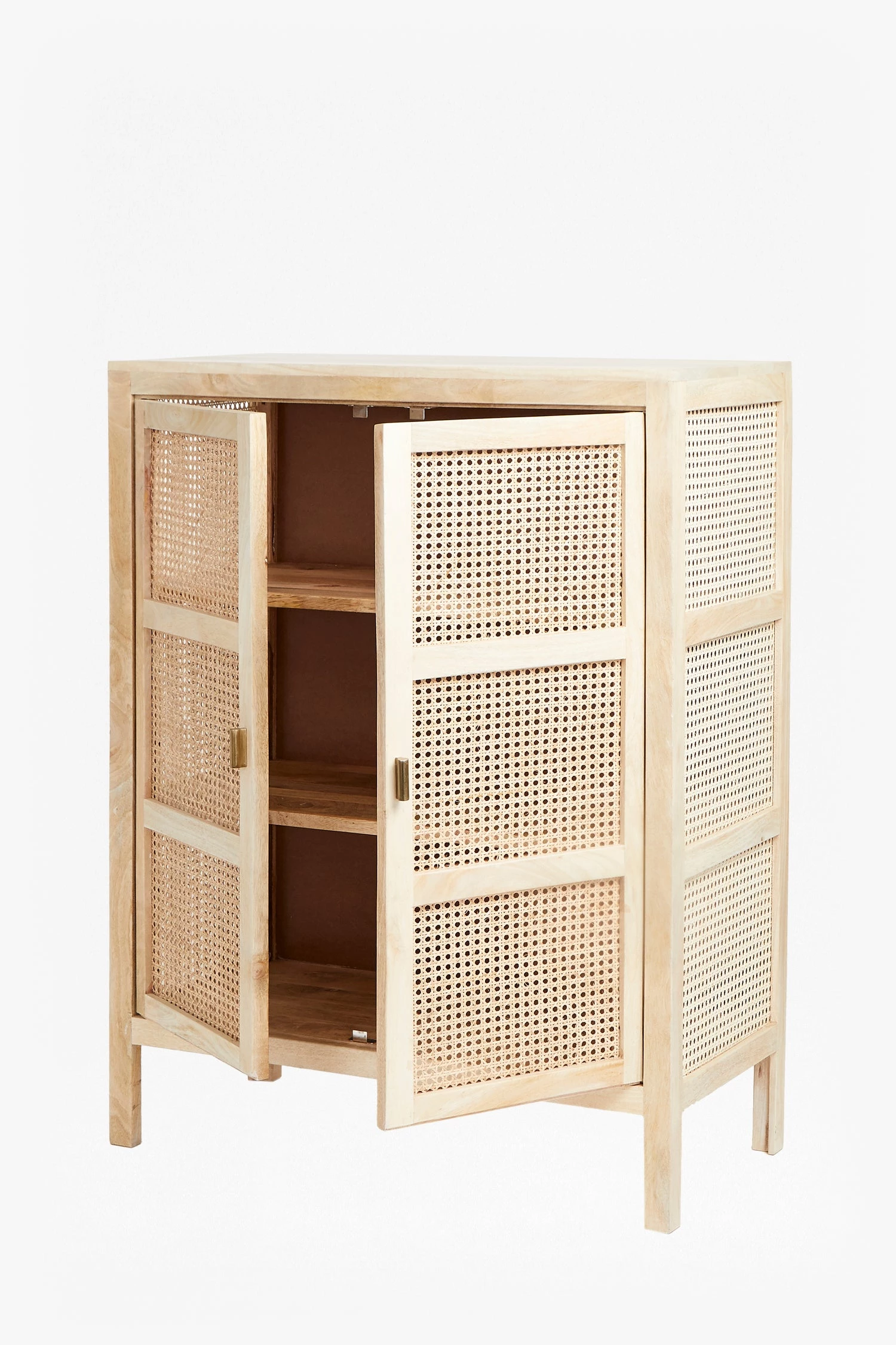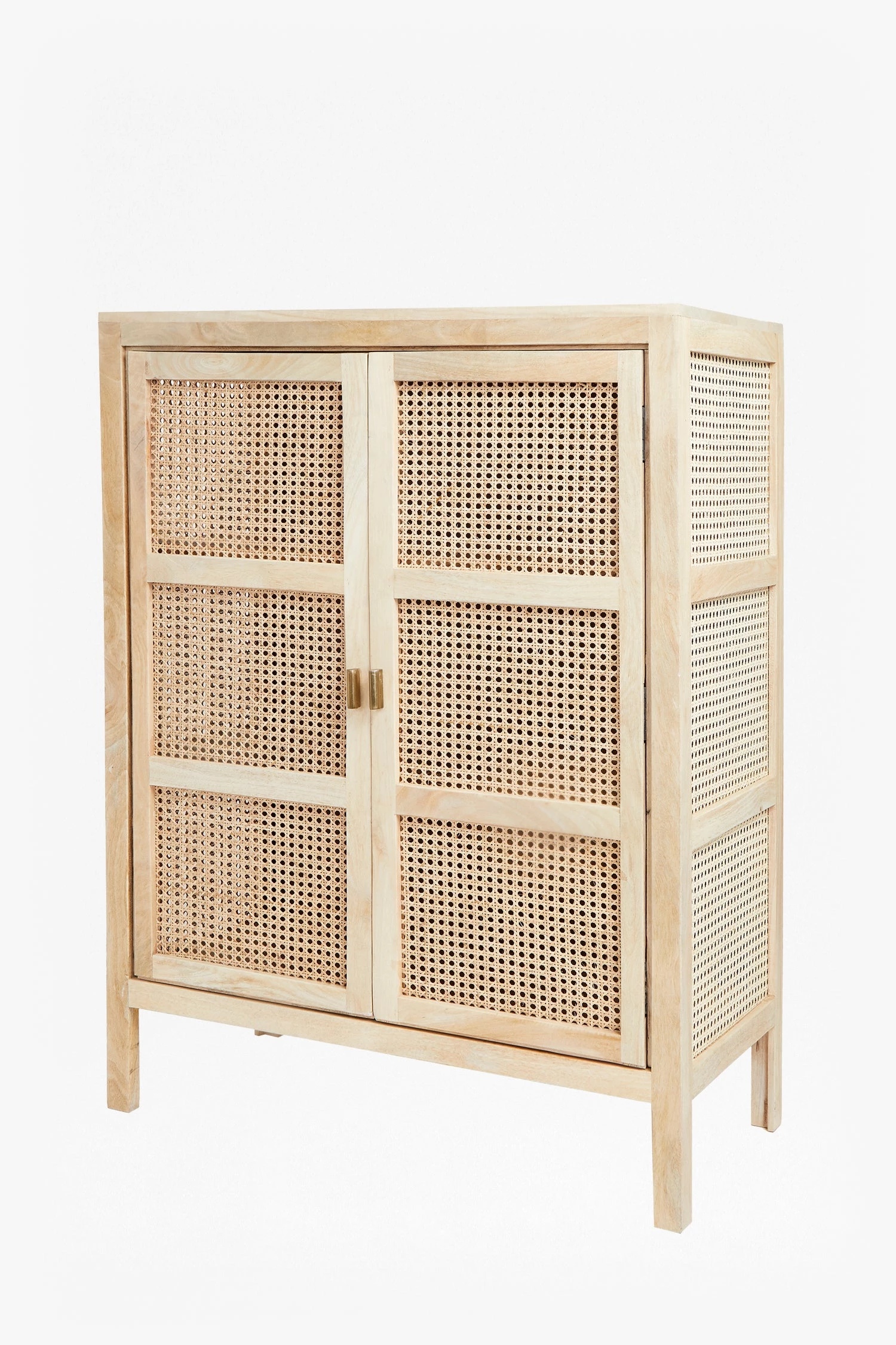 Combining for an impactful look, the French Cane Cabinet is crafted from light natural cane and durable mango wood. Hand-woven cane catches the light beautifully and offers a ventilated storage space for all eventualities. The piece features two doors and three spacious inner shelves, perfect for everything from clothes to textiles, to fine china or electronics.