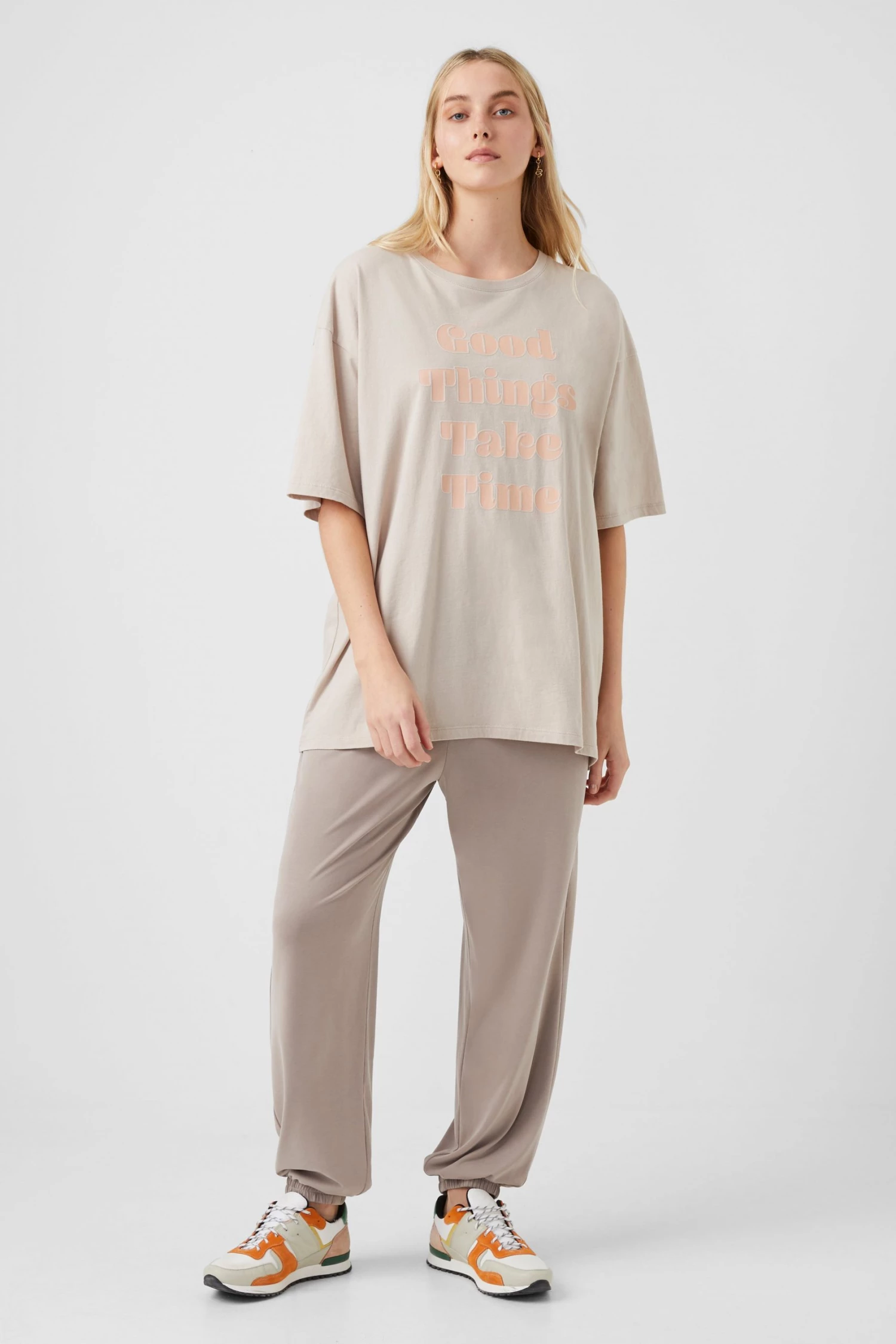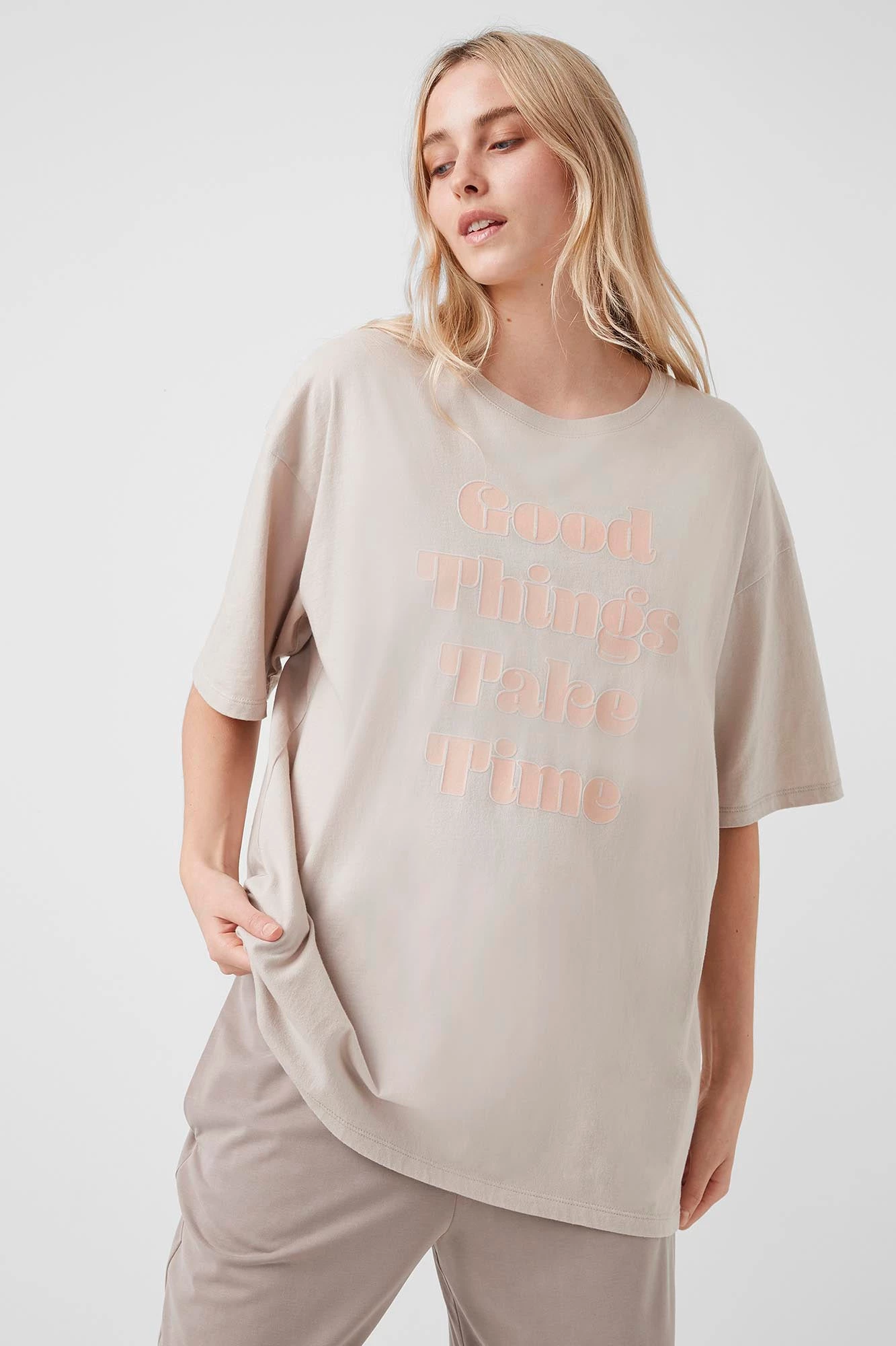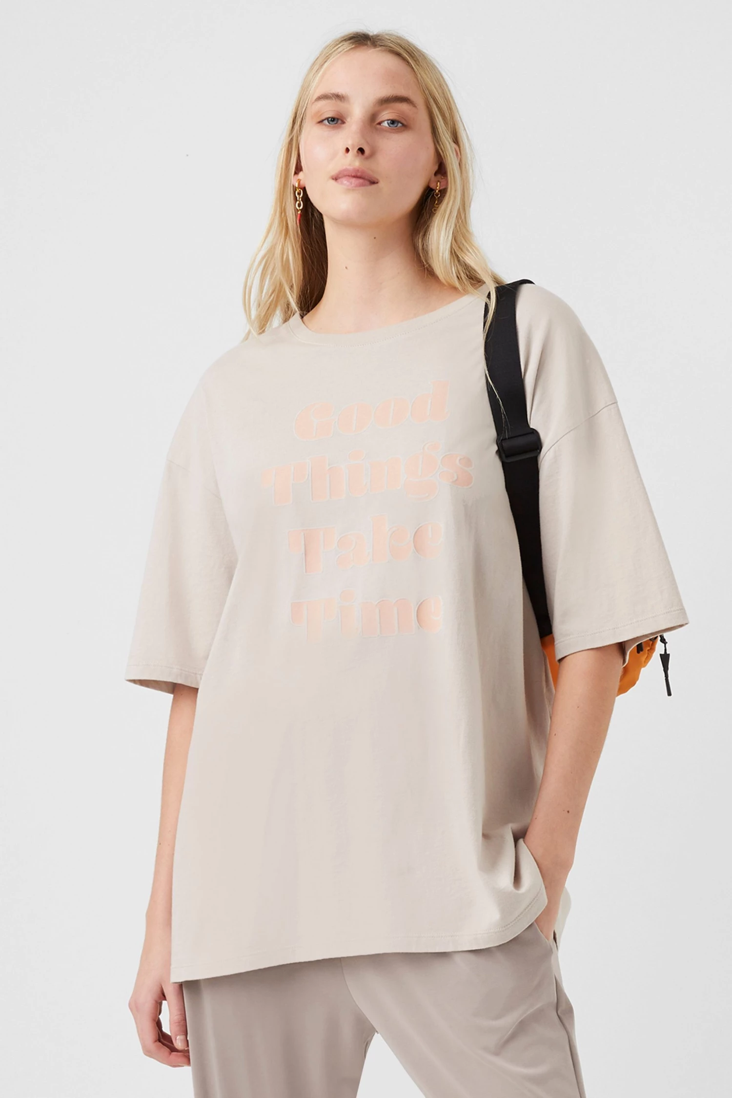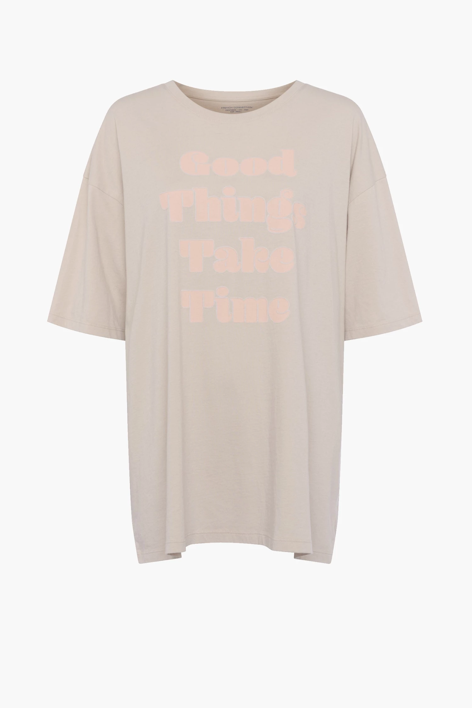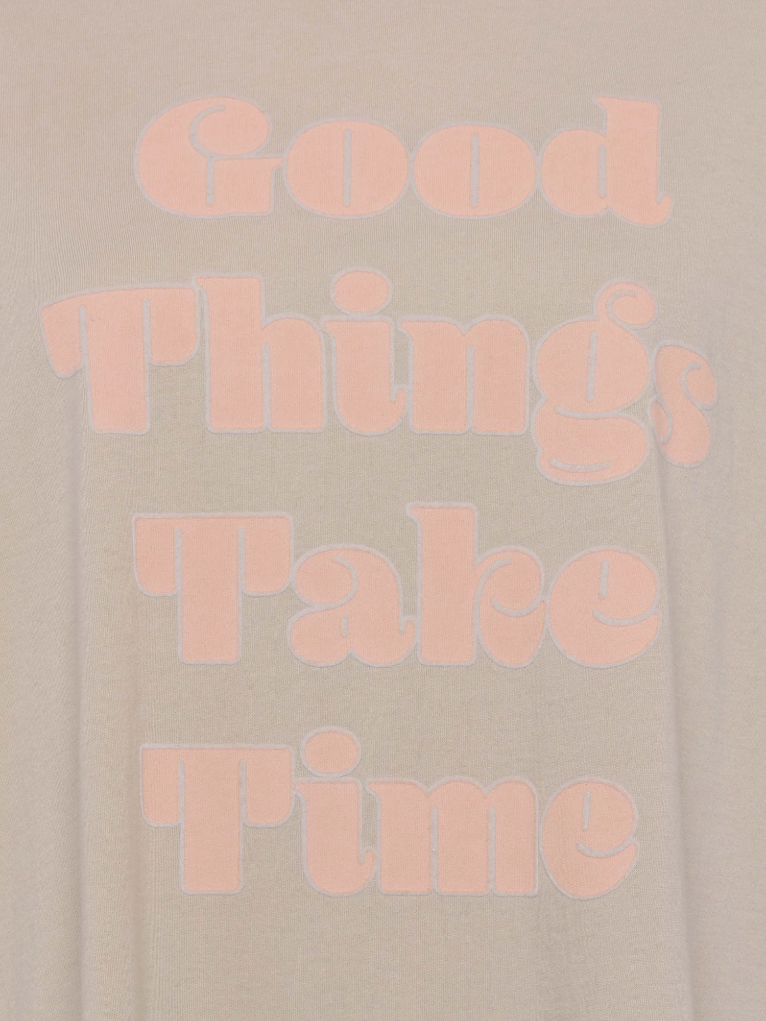 Master casual style with the Good Things Organic T-Shirt. In an oversized fit, it’s printed with a large text spelling ‘Good Things Take Time’.