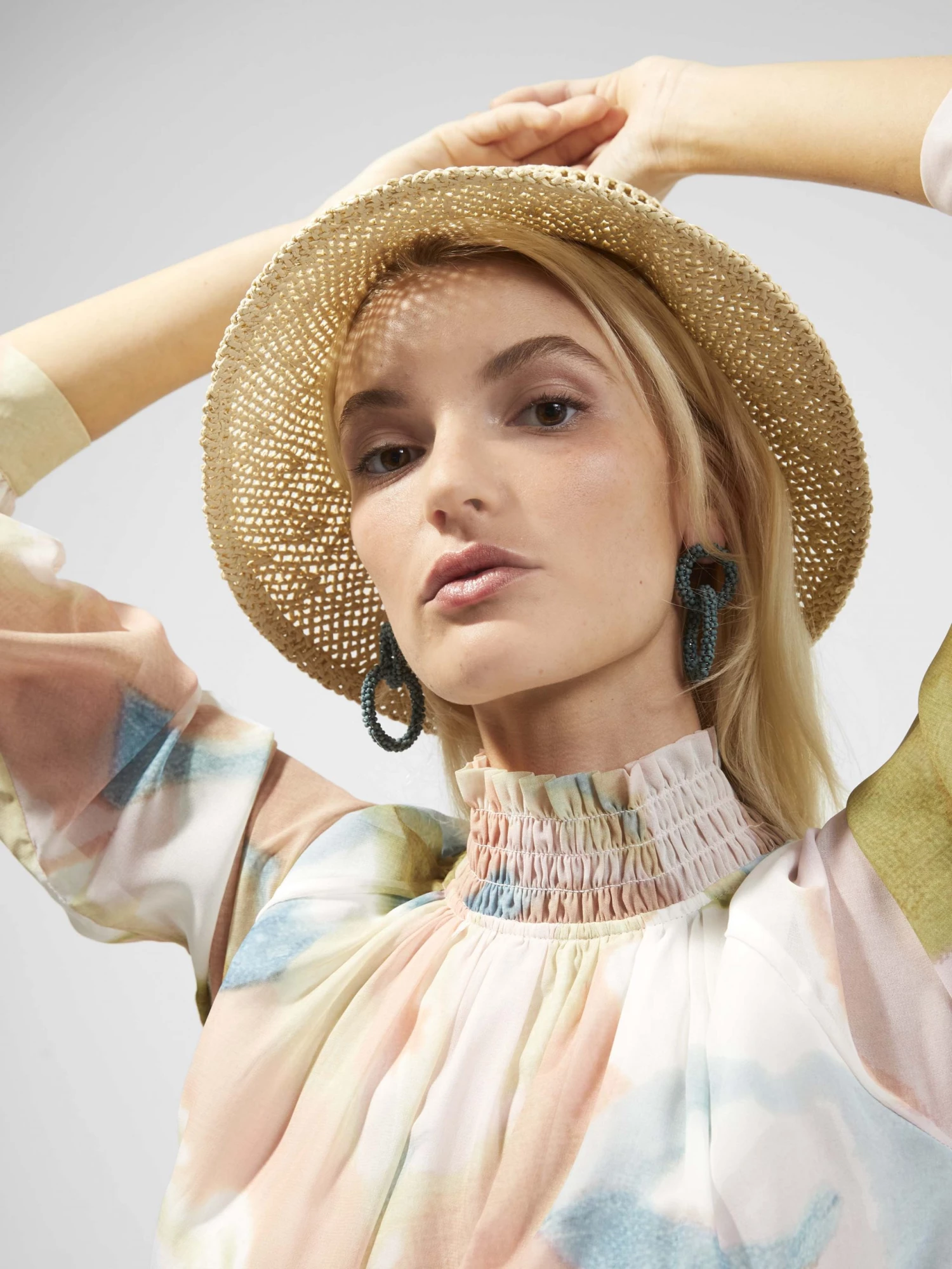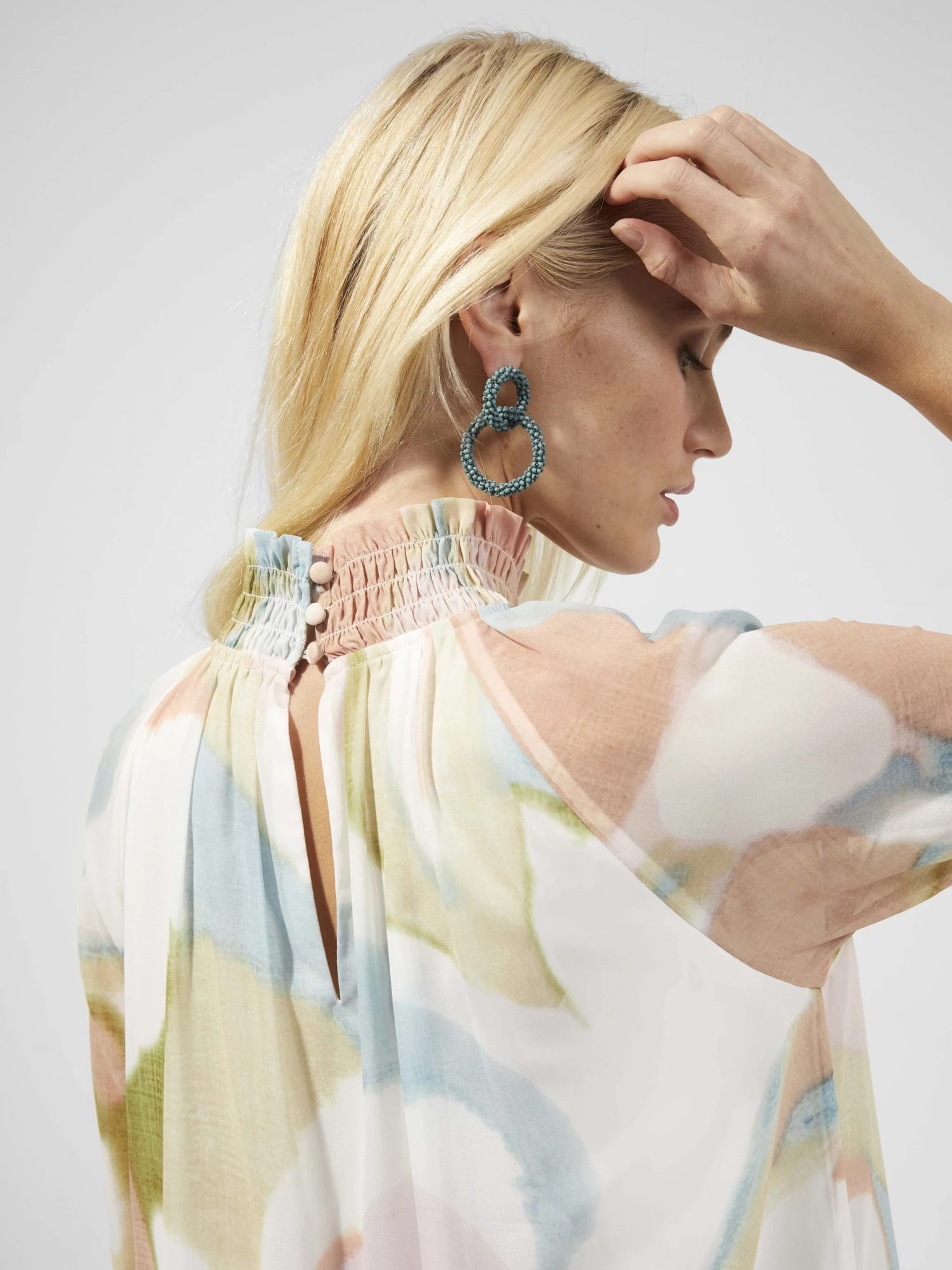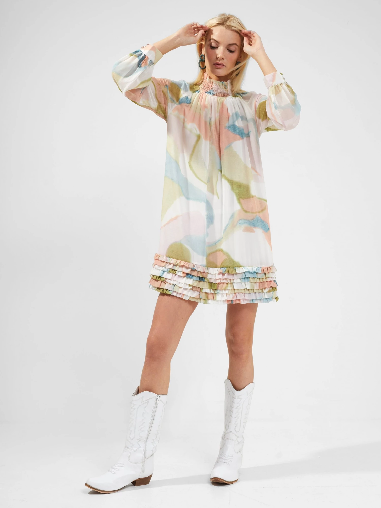 Abstract print alert. The Hattie Recycled Mini Dress has a cloud-like design with a high neckline and ruffled hem, perfect for channelling your feminine side.