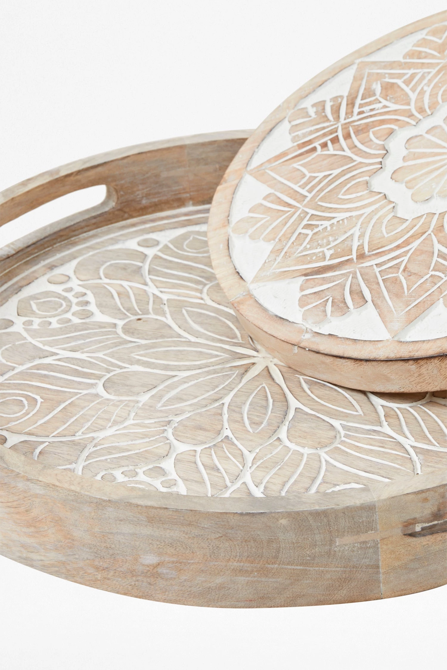 Defined by its artistic sunburst design, our mango wood tray is a unique piece that is decorative as well as functional. Whether you are using it as an ornament or for serving light snacks, this beautifully hand carved tray is the perfect rustic finishing touch. Featuring a pronounced lip for and 50mm recess for a versatile and practical finish.