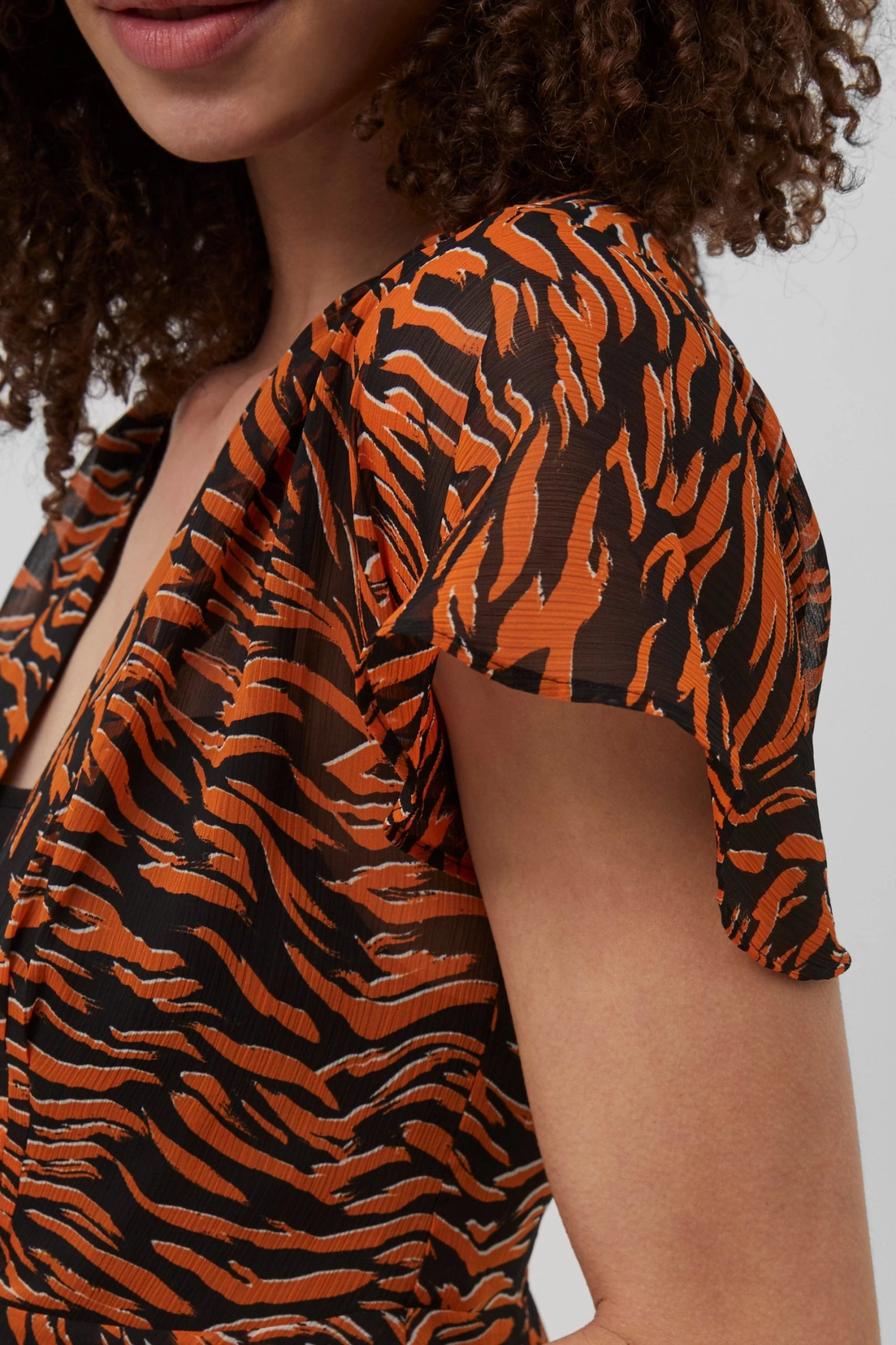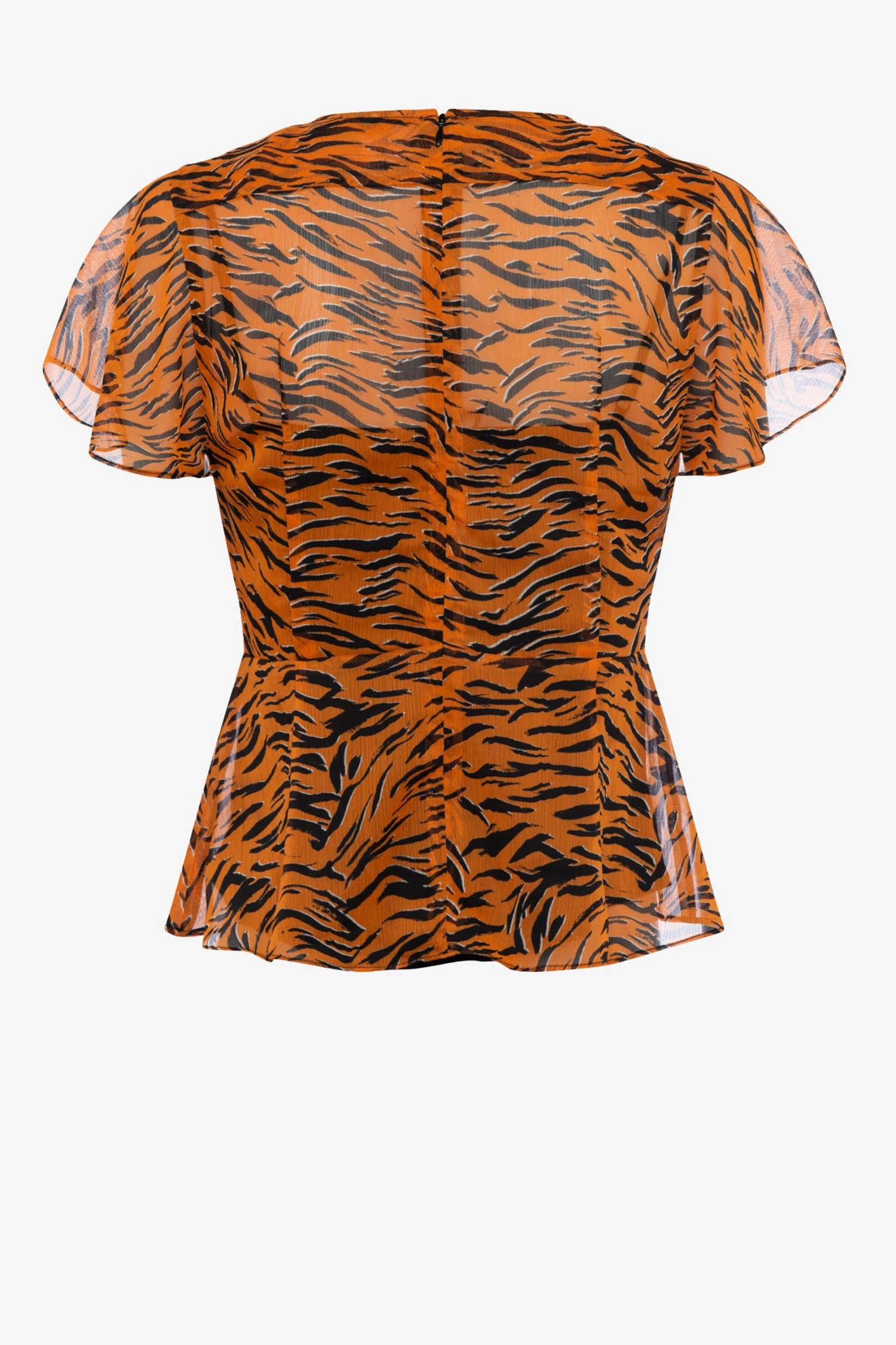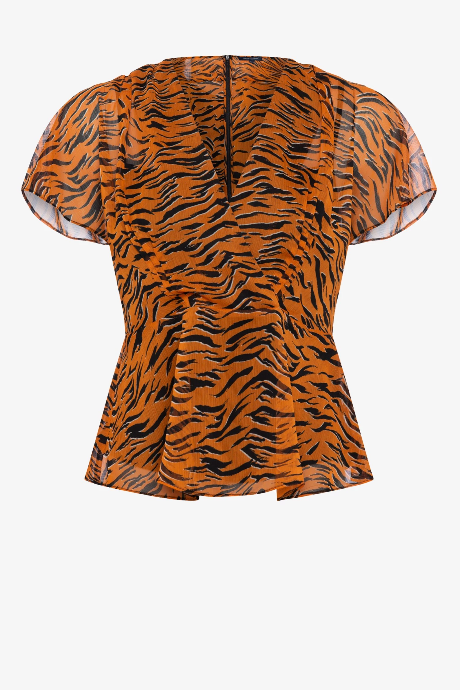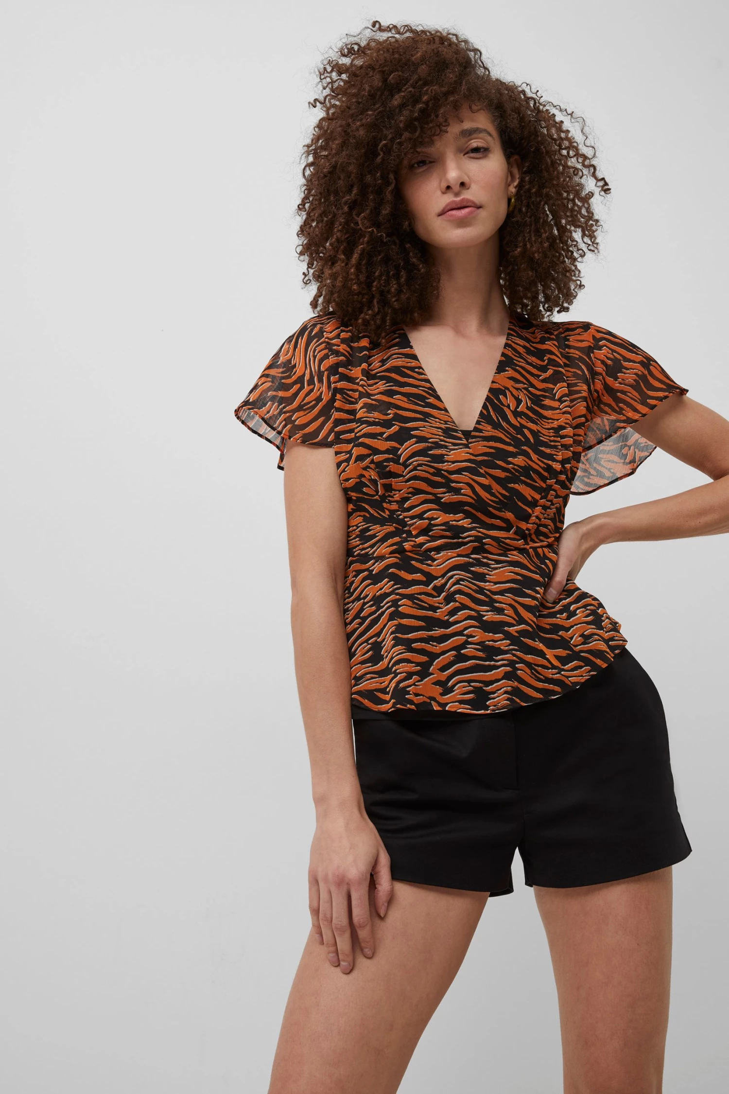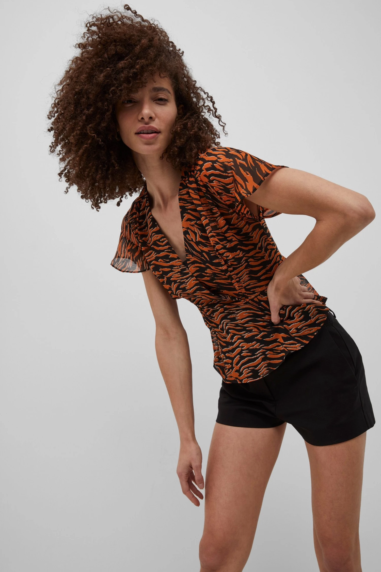 Forever flattering and ready for every occasion, the Iger Crinkle Mix Top pairs perfectly with jeans and heels for easy smart-casual style. Featuring a v neckline, short sleeves, subtle peplum fit and draped detailing, the top instantly creates an elegant hourglass silhouette. Eye-catching tiger print fabric completes the top’s timeless yet edgy aesthetic.