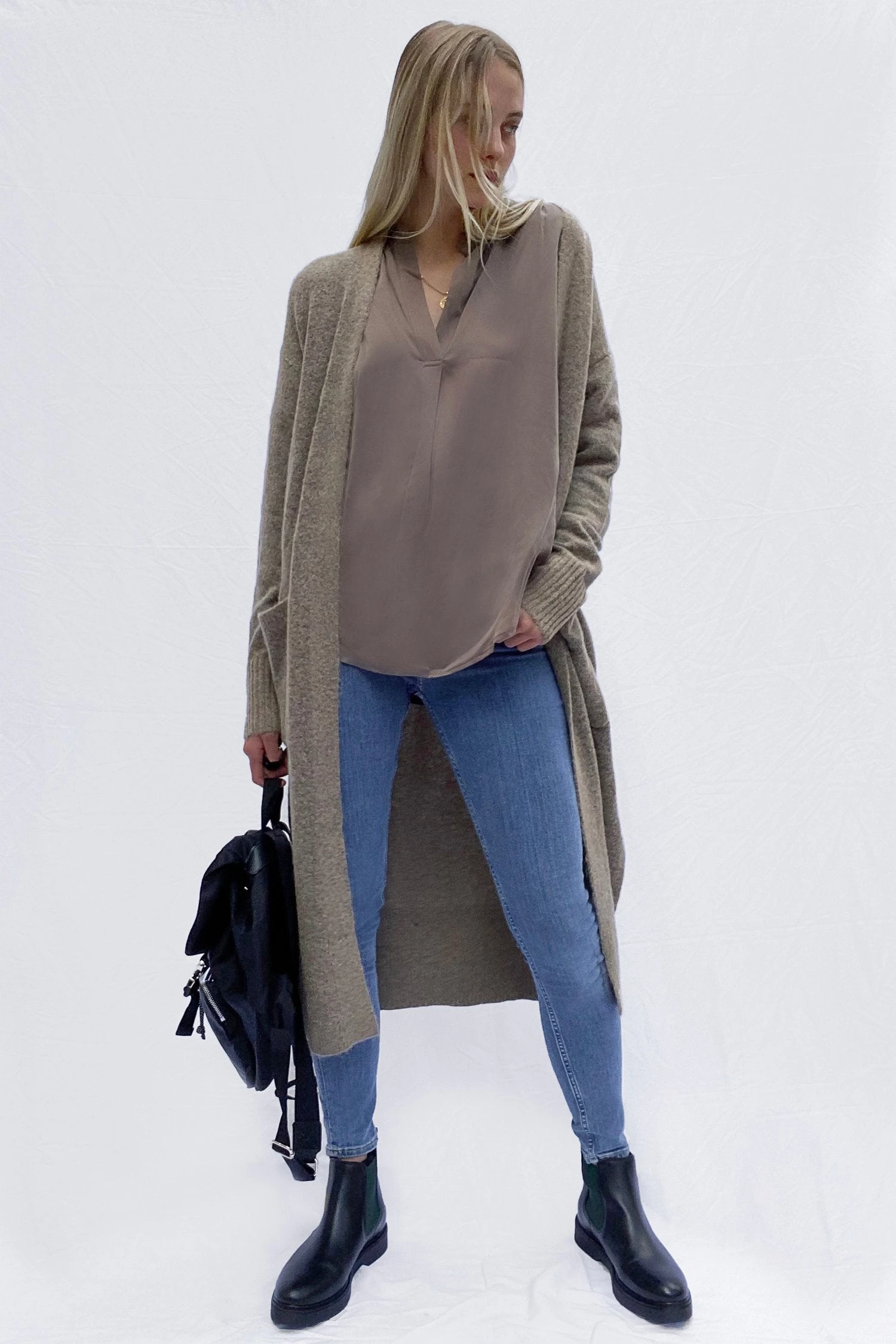 Build up the foundations of your wardrobe with the Jessa cardigan. Designed with a sophisticated longline fit to keep the cold at bay, the cardigan features a simple tie waist, two side pockets, and smooth knitted fabrication, creating a cool, calm, and effortlessly stylish layer.