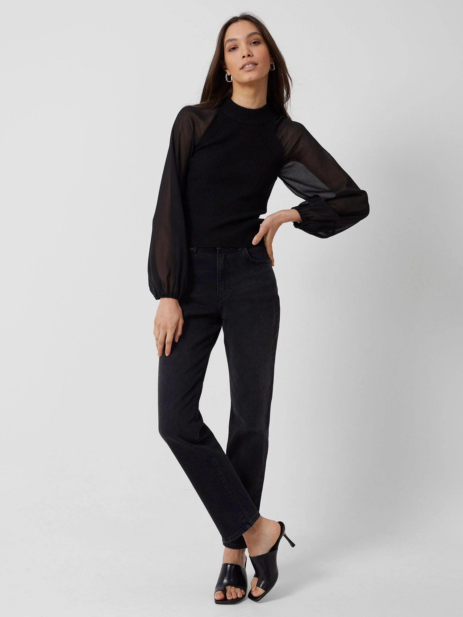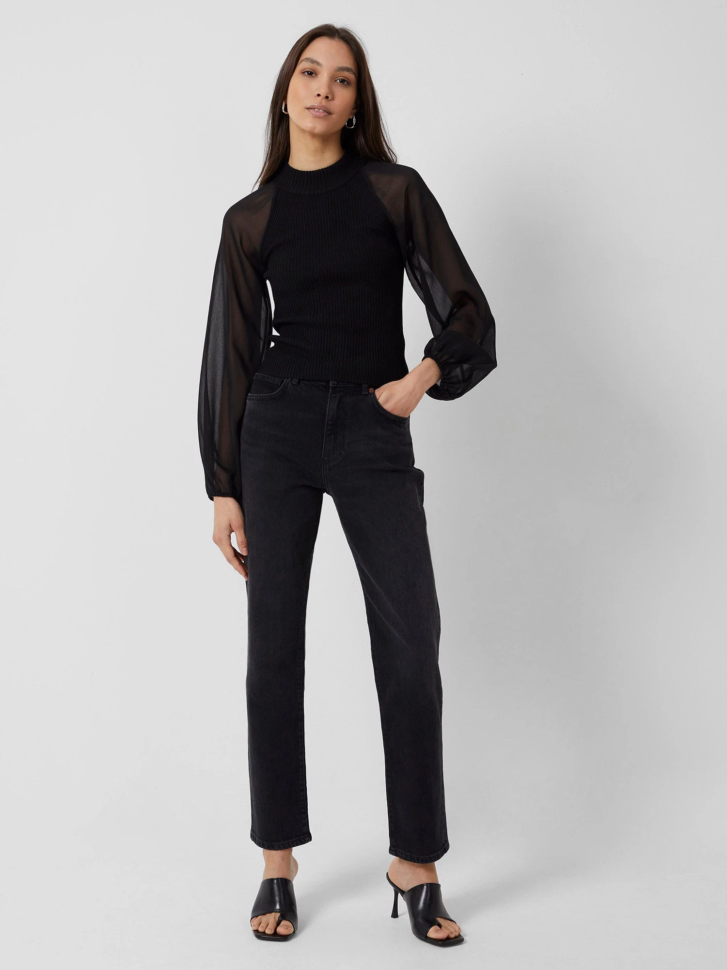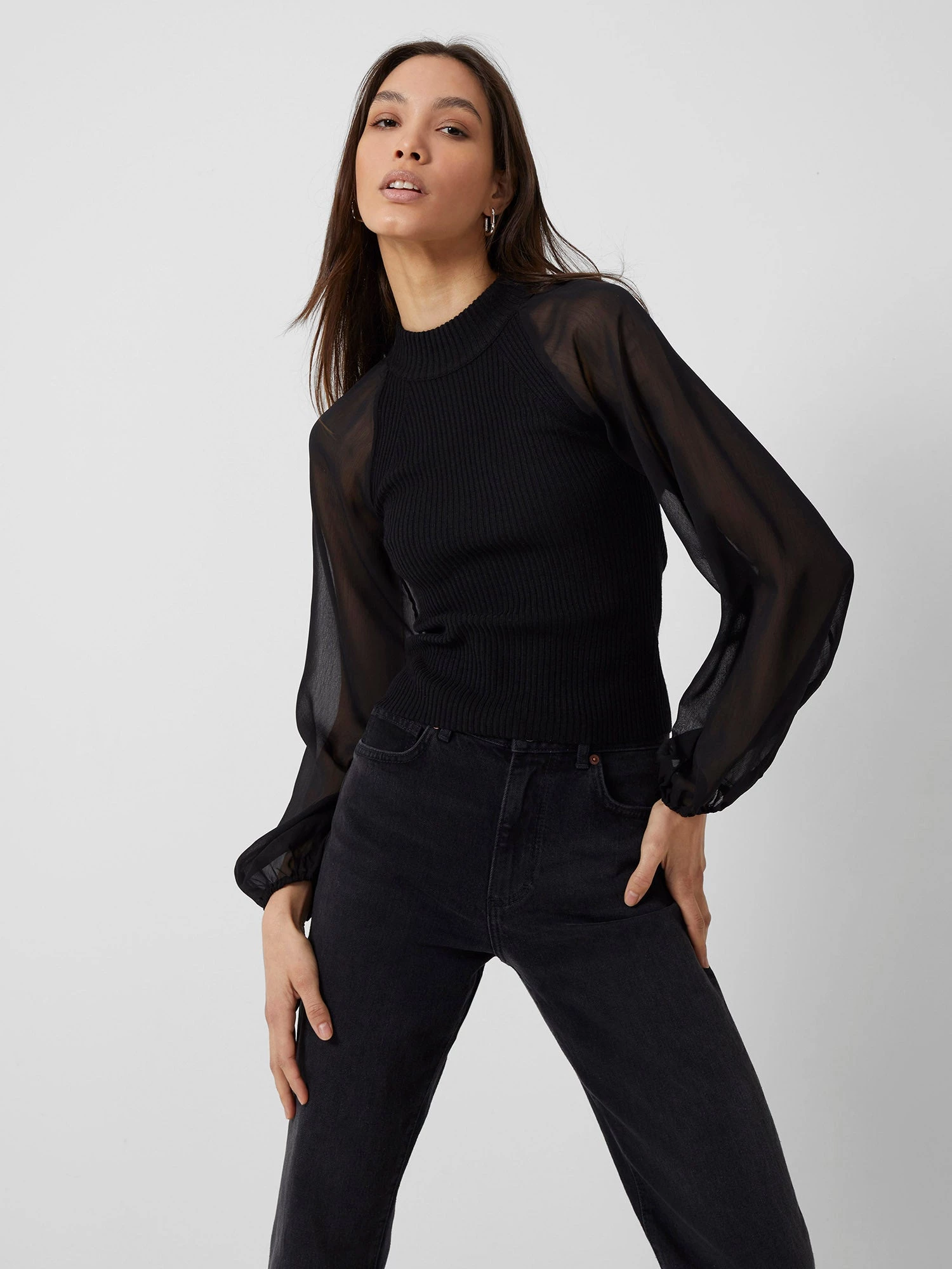- Long semi-sheer sleeves