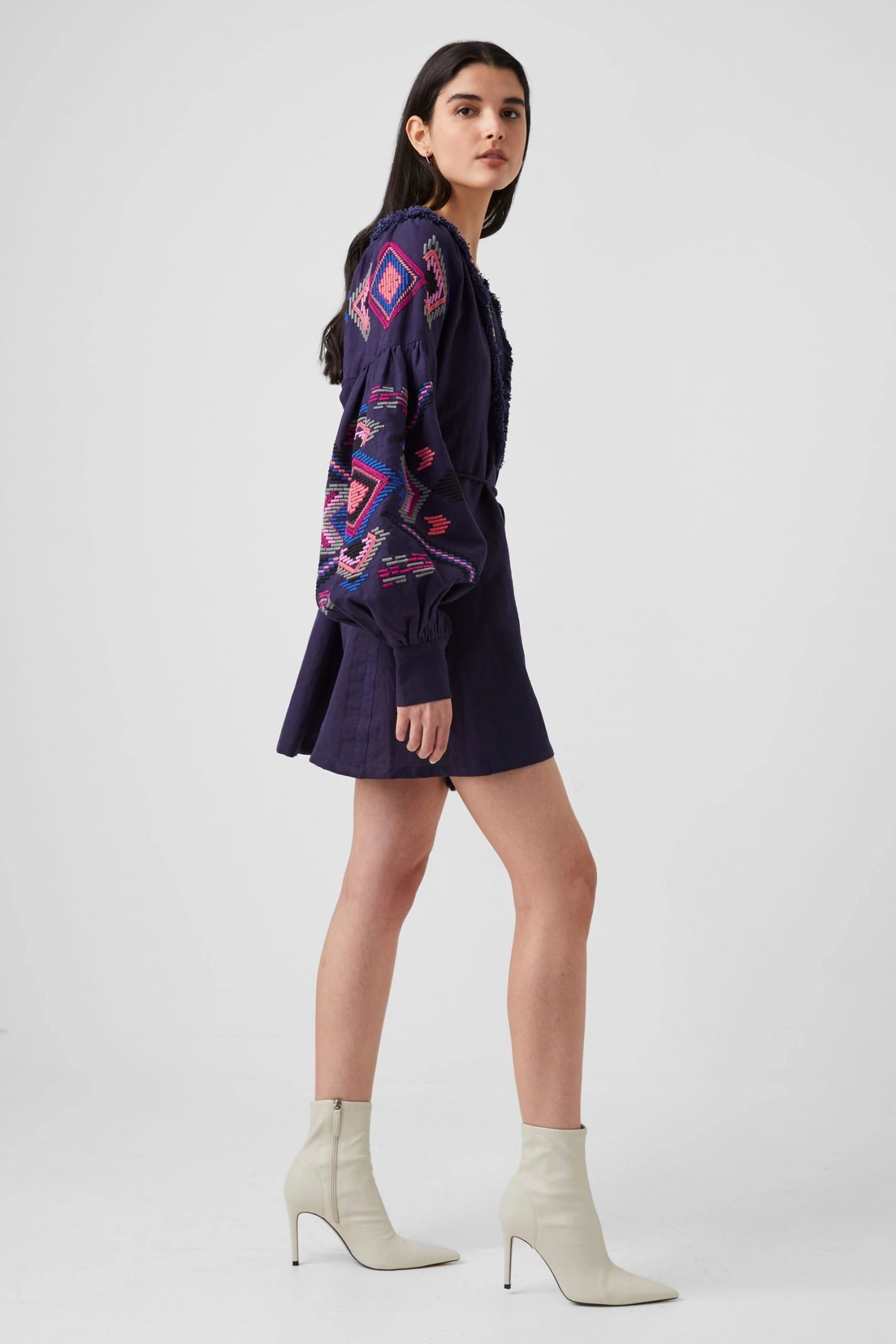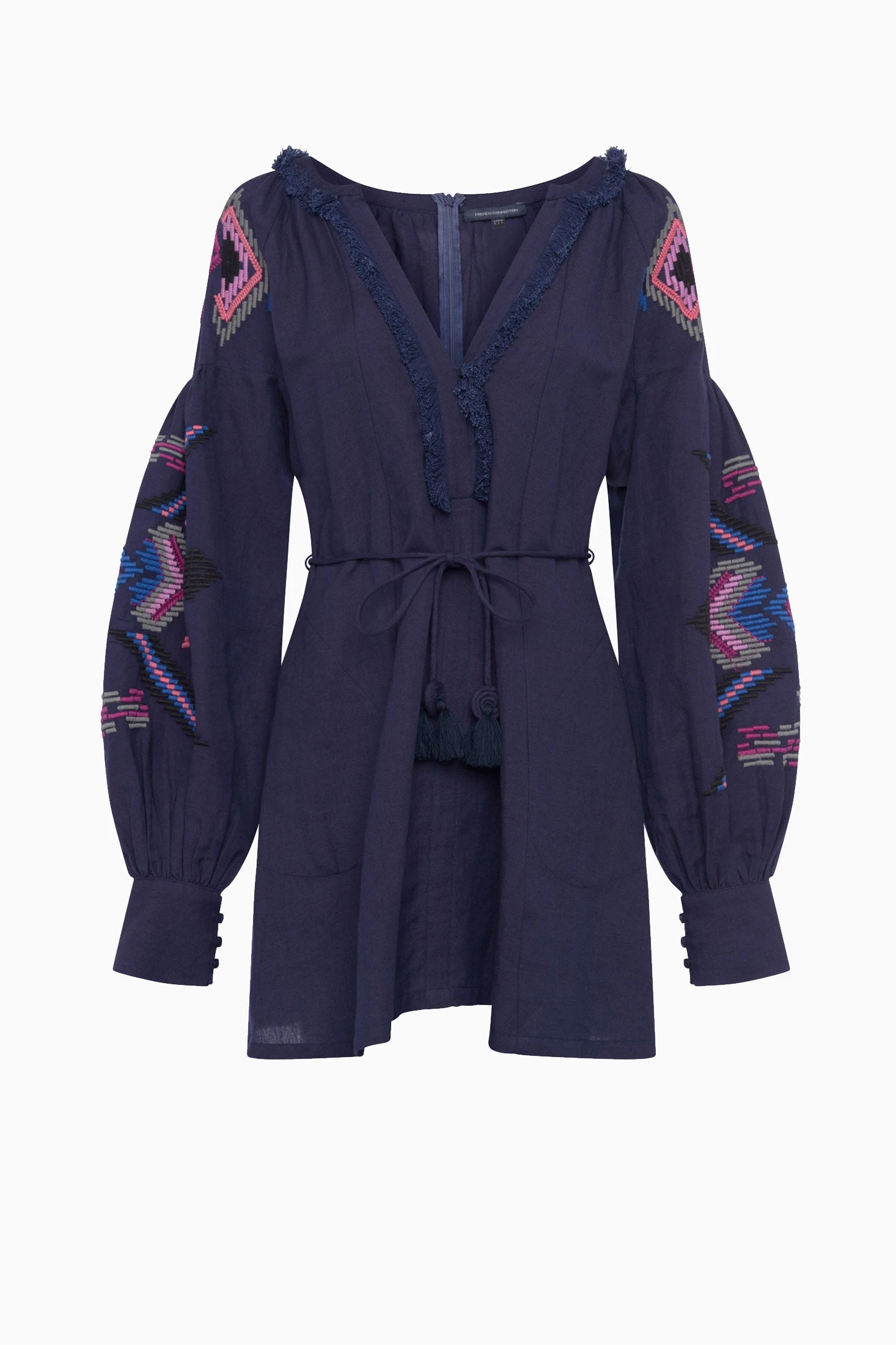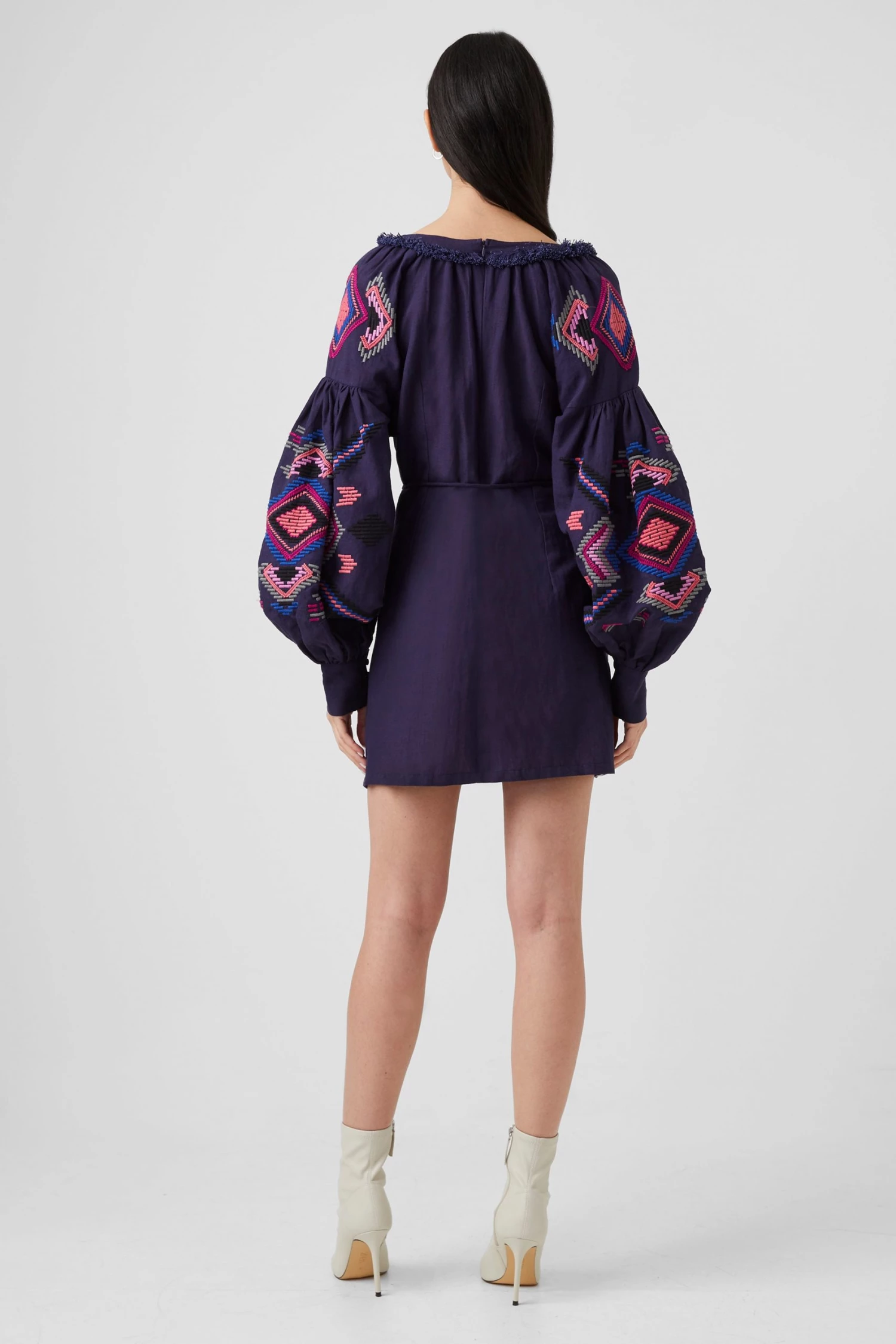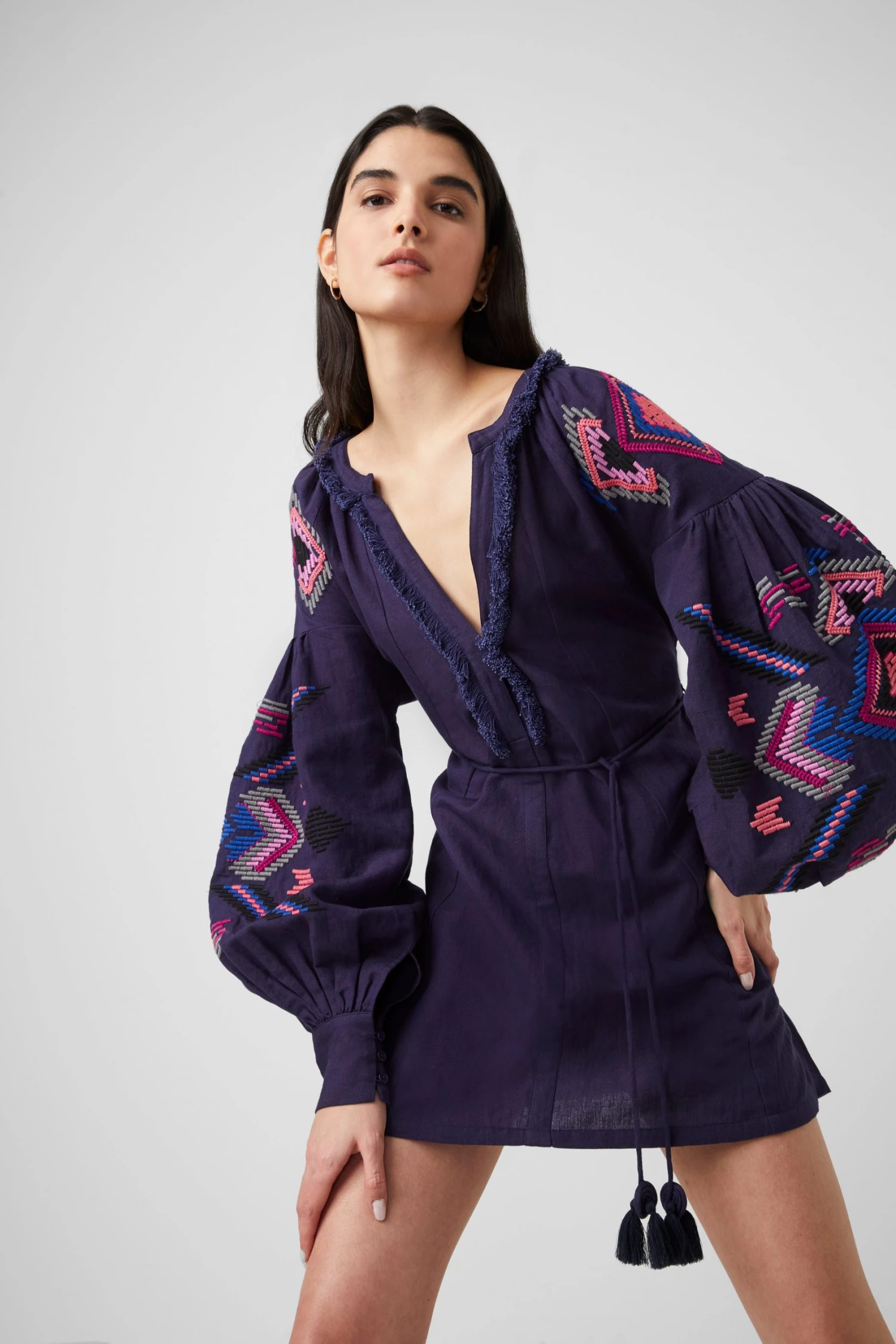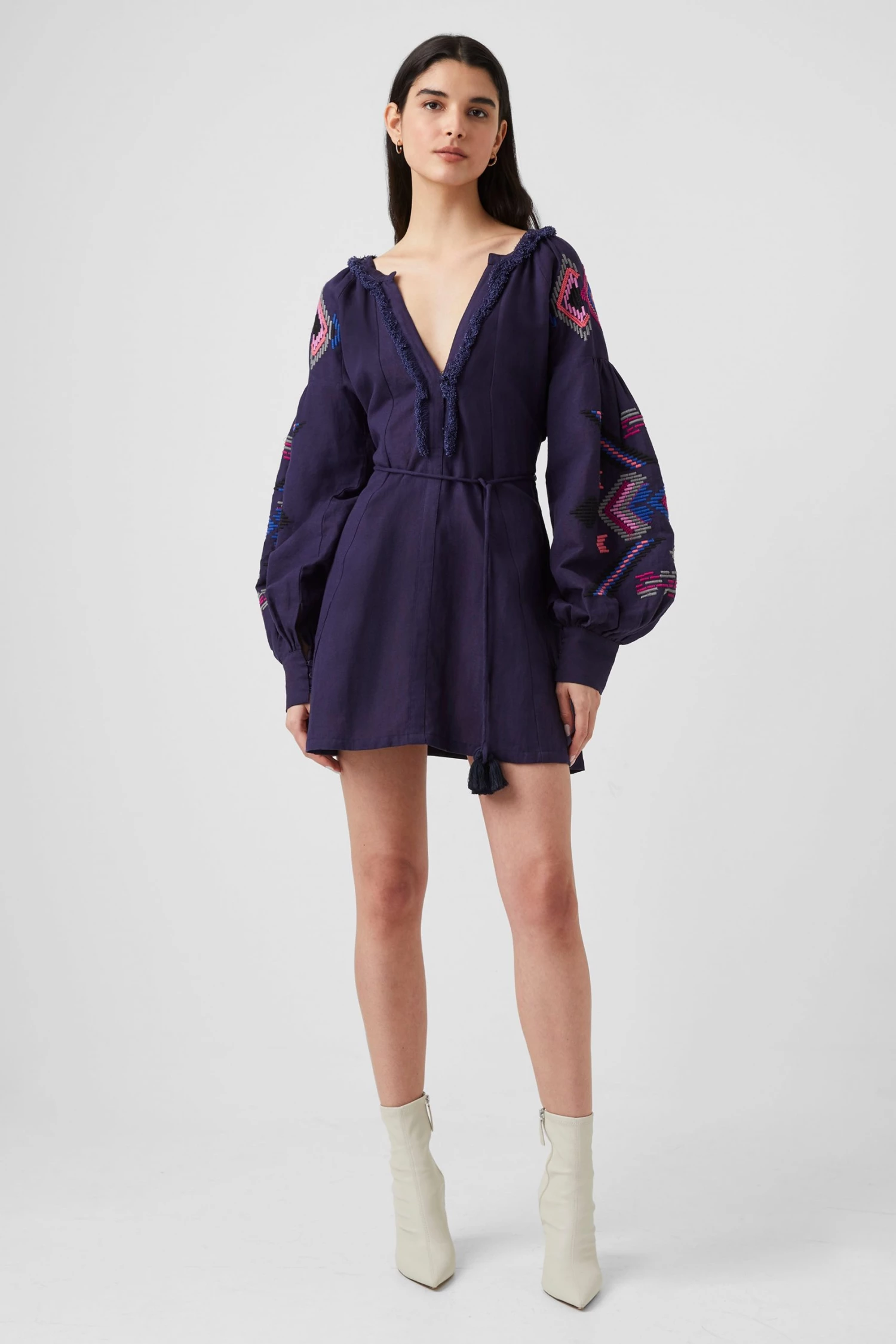 Turn heads at every social event when dressed in the Alotta Embroidered Linen Mini Dress. The flattering silhouette is offset with voluminous sleeves and embroidered patterns.