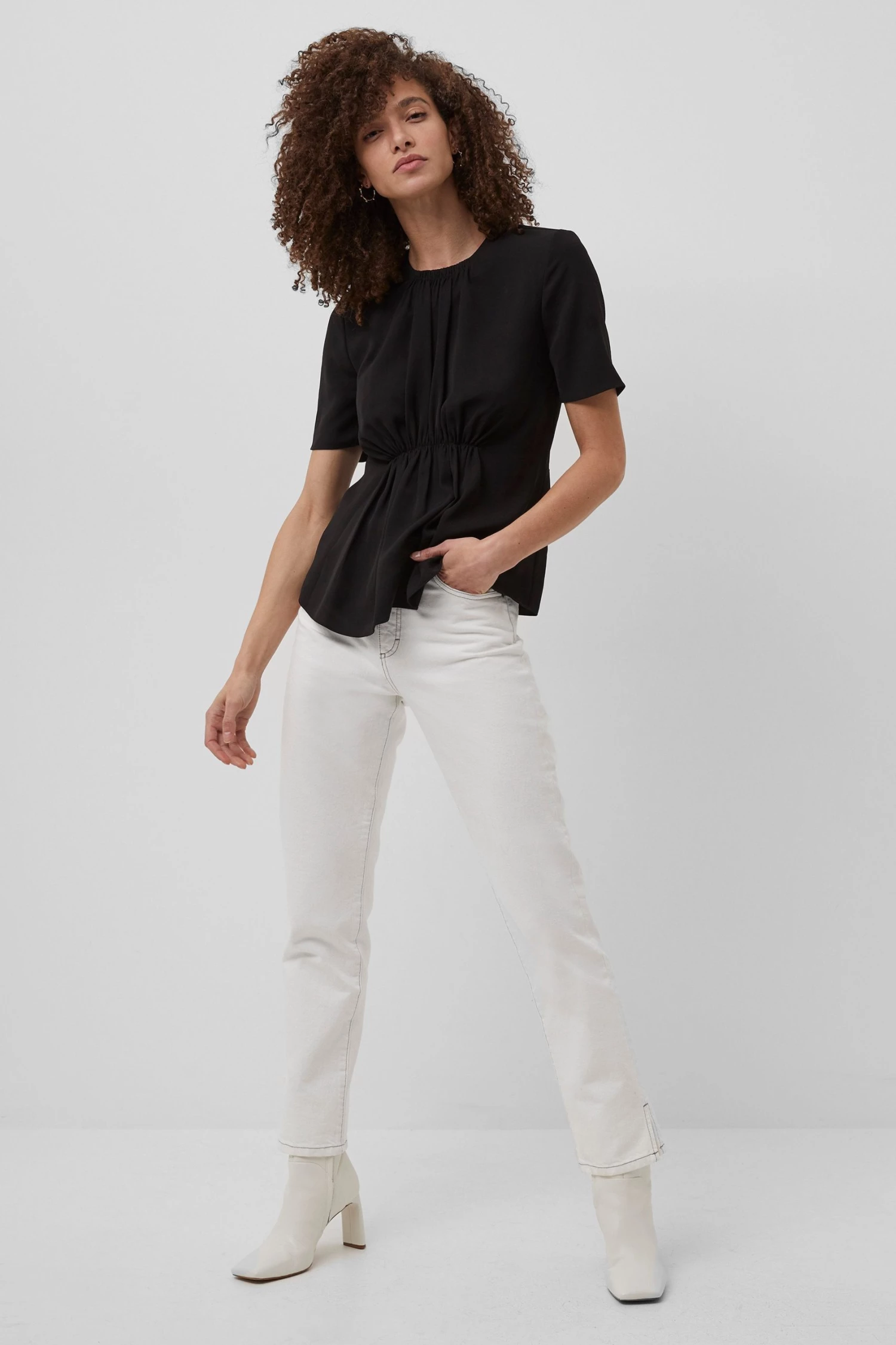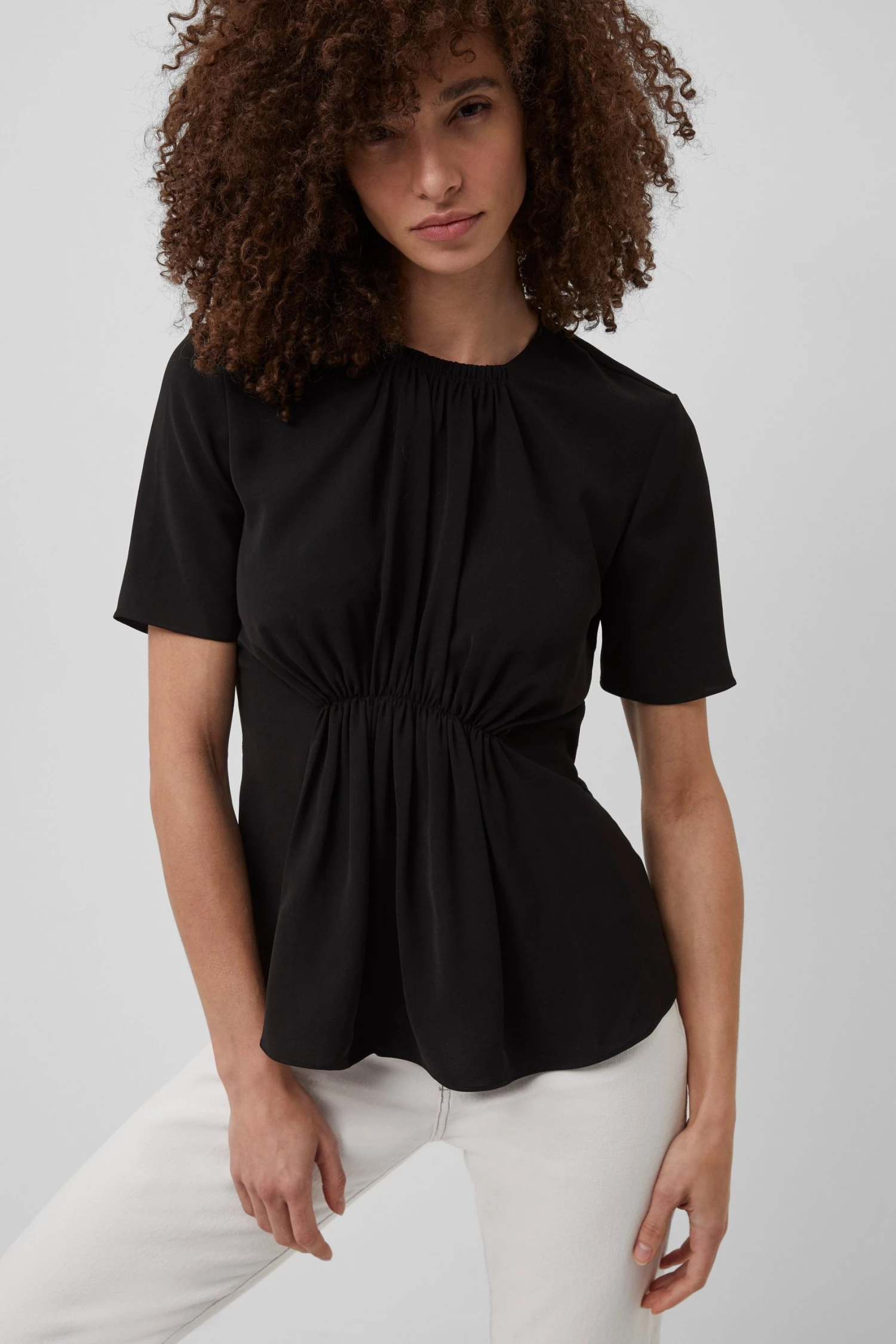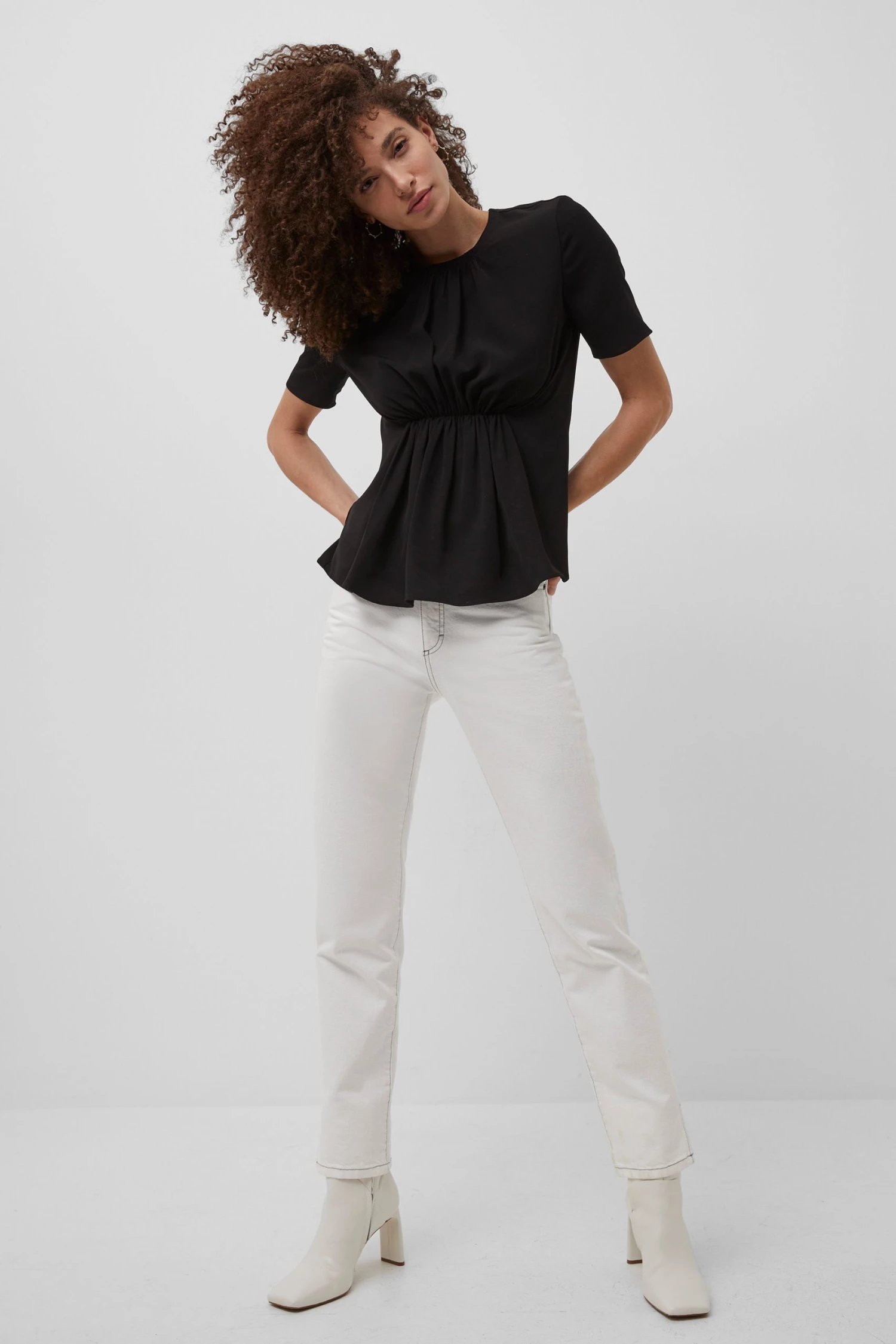Designed with flattering gathered detailing at the waist, the Emmy Crepe Top is a timeless piece you’ll love forever. Featuring on-trend voluminous sleeves, a simple round neck and elegant keyhole detail, the Emmy top’s focal point is its eye catched curved gathering detail, creating a flattering empire waist fit. Compliment the top with relaxed denim for the perfect smart-casual look.