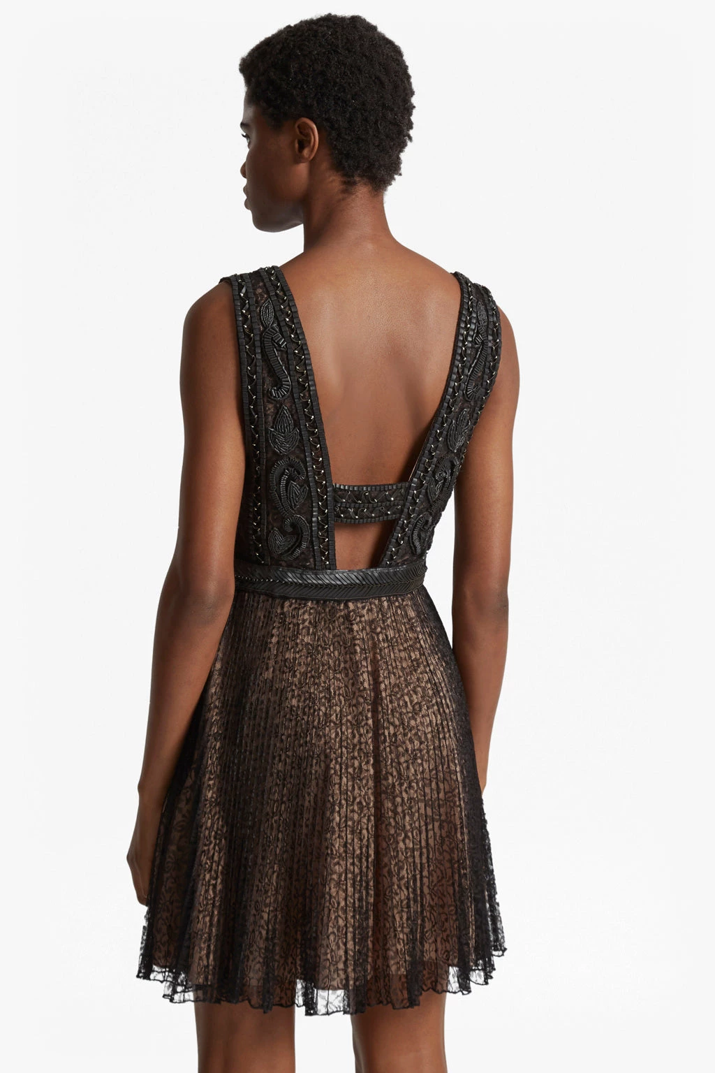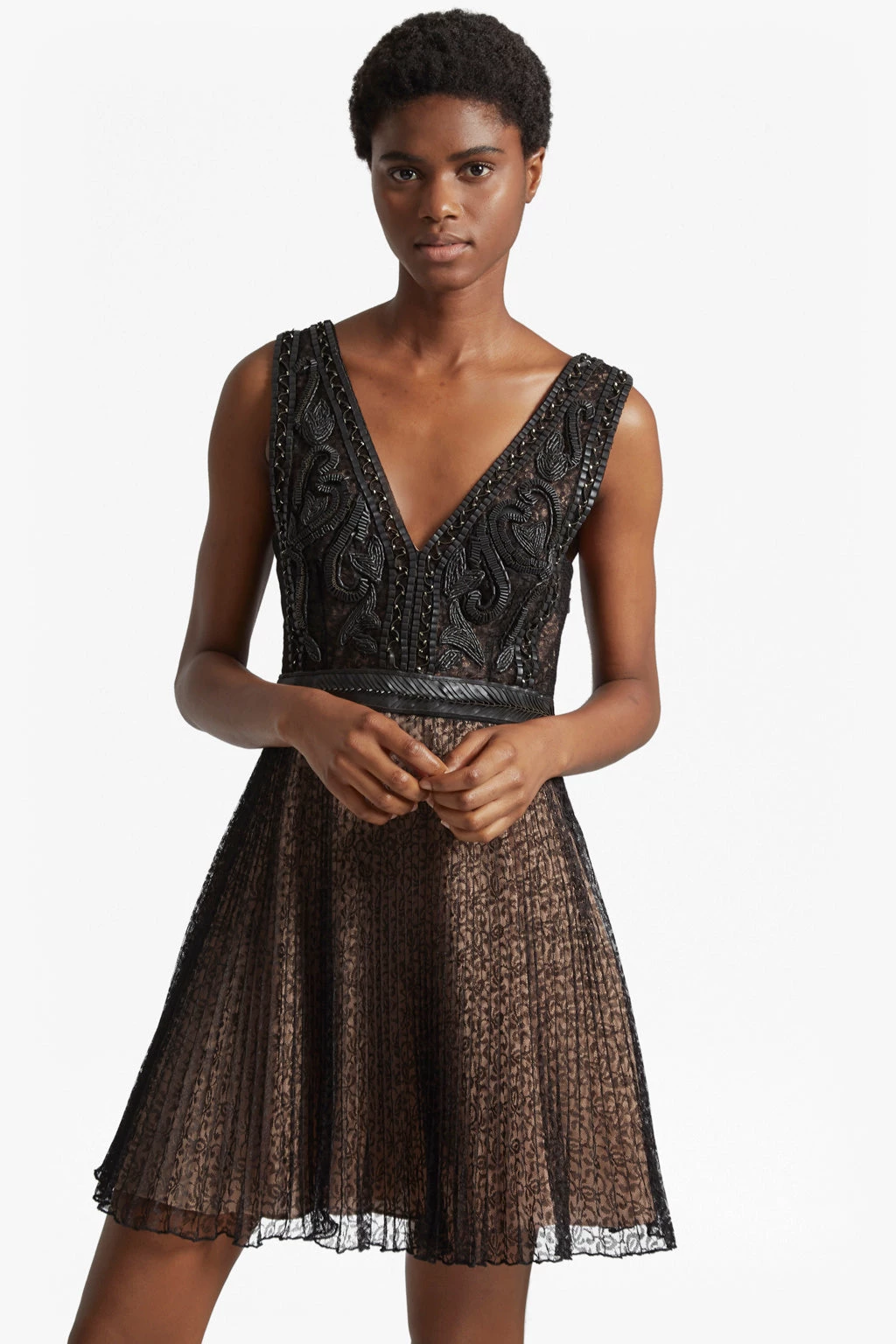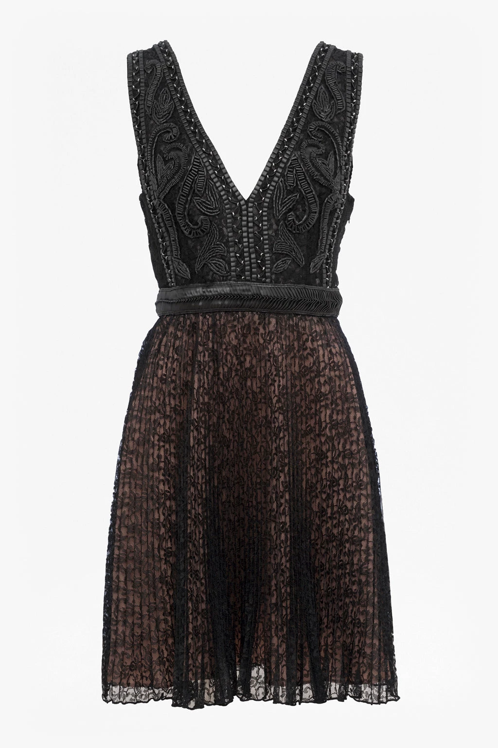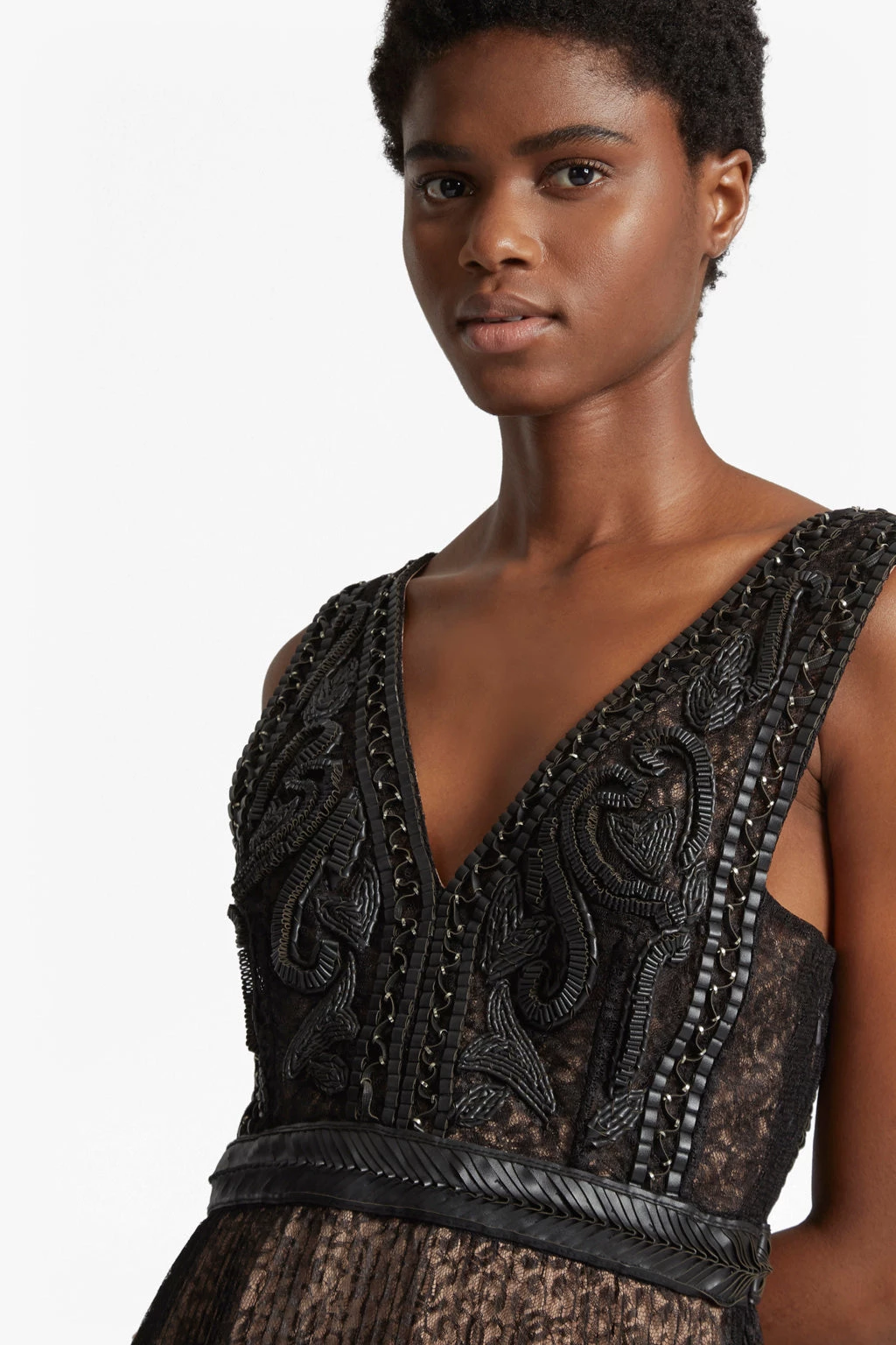 Faux-leather detailing brings a tough edge to the Florence Lace Dress. The embellished bodice falls to a low V-neck at the front, plunging at the back, while the gathered lace skirt swings from the fitted faux-leather waistband. Wear on its own or, for extra comfort, pair with a camisole or simple cotton t-shirt underneath A simple heeled sandal will add a balanced finish.