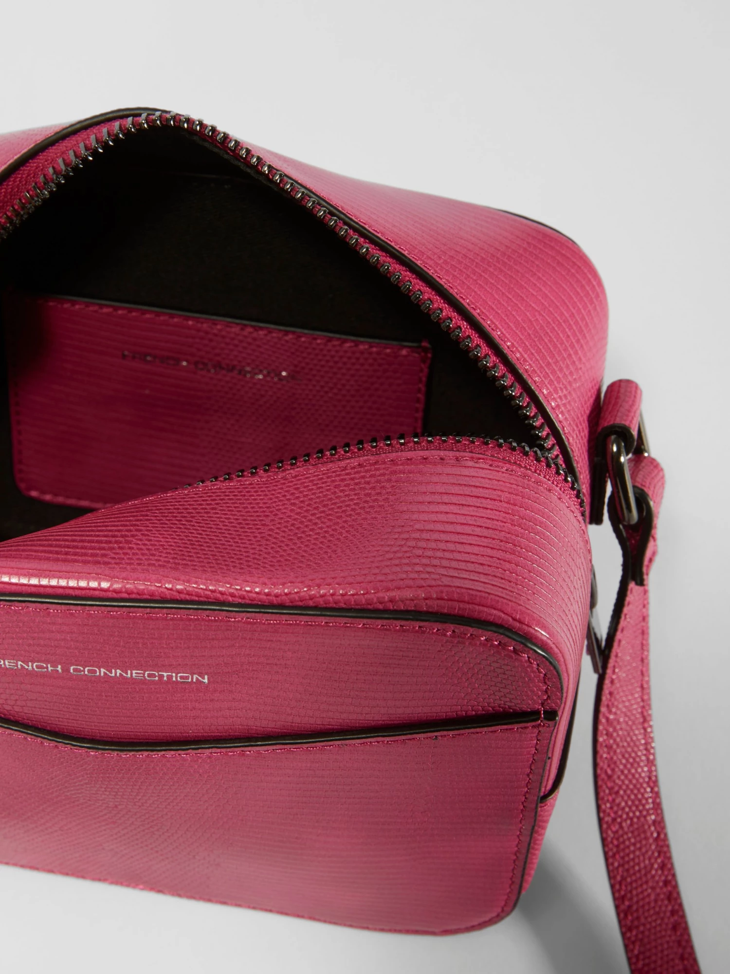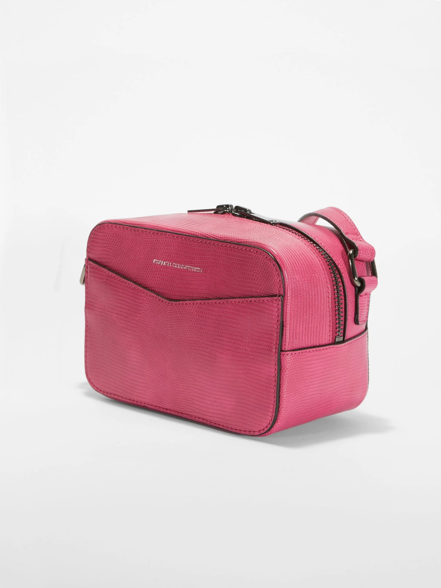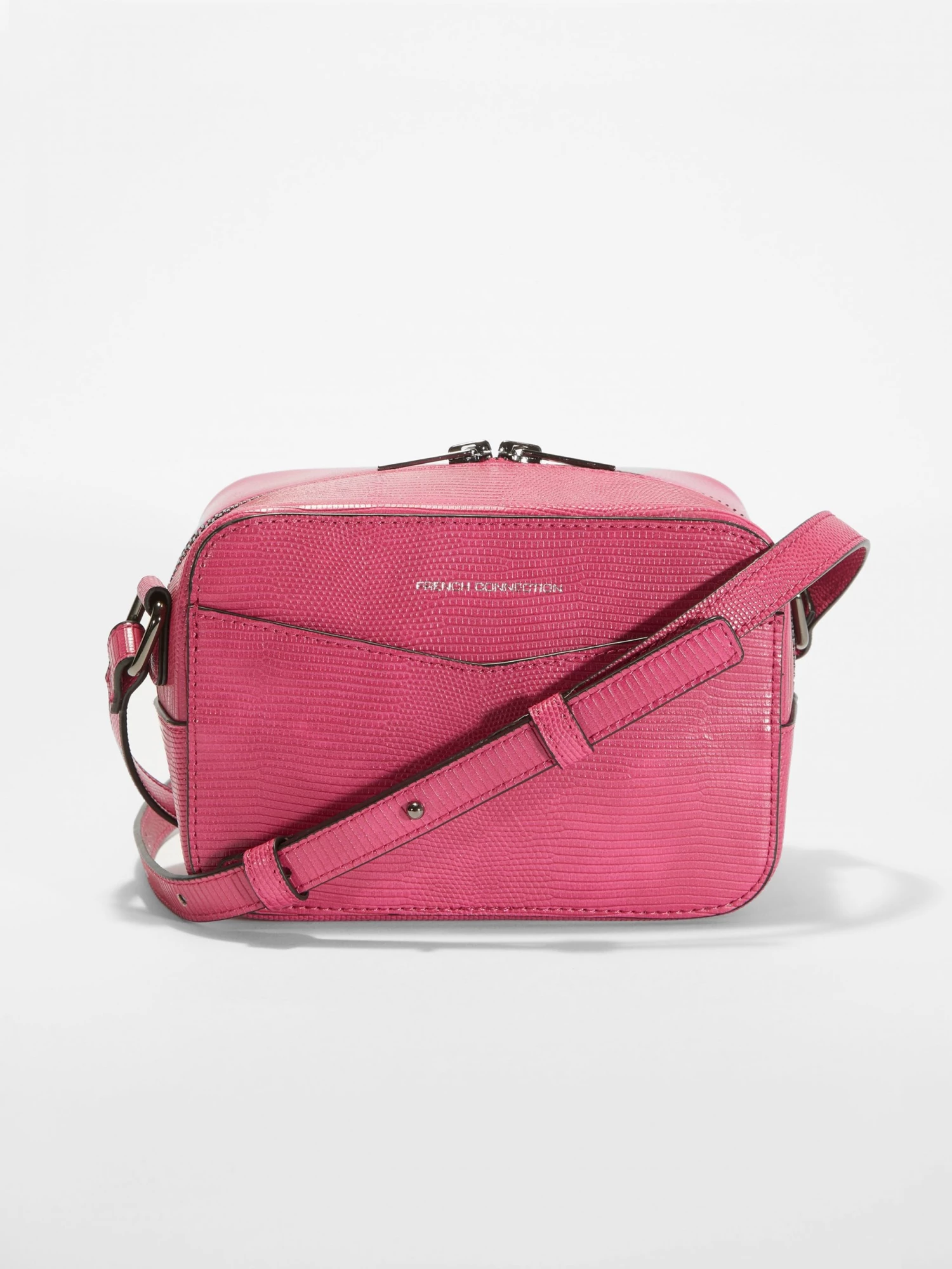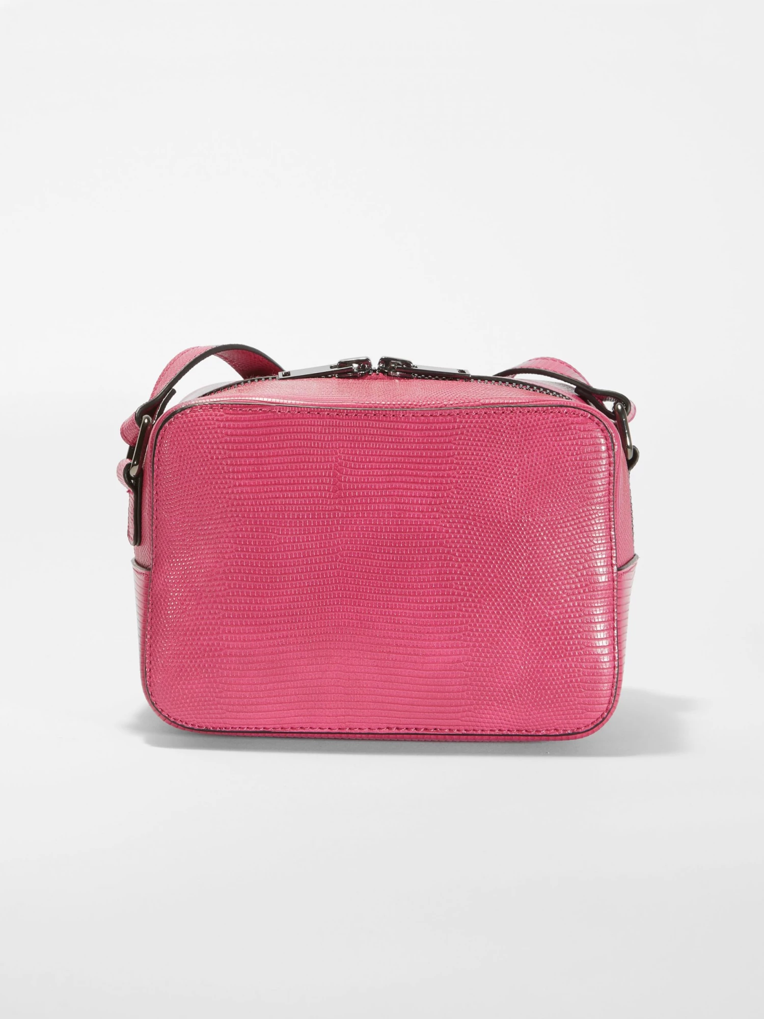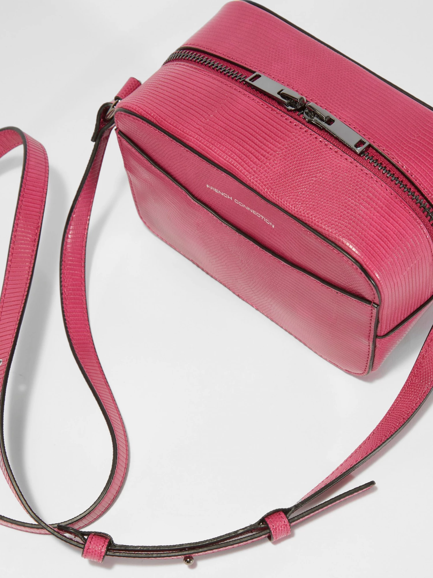 The Lizard Emboss Camera Bag will add a colour pop to any outfit. It has a boxy shape, metallic hardware and cross body strap.