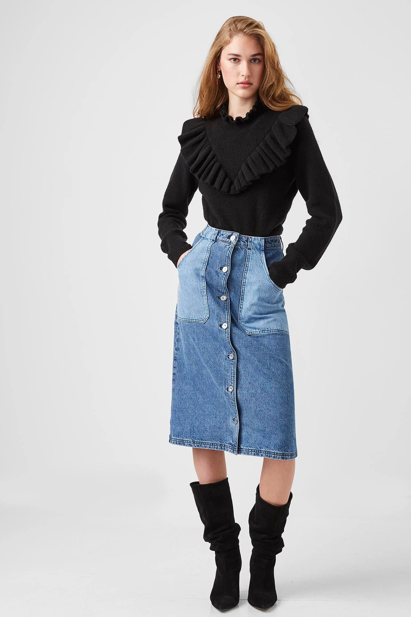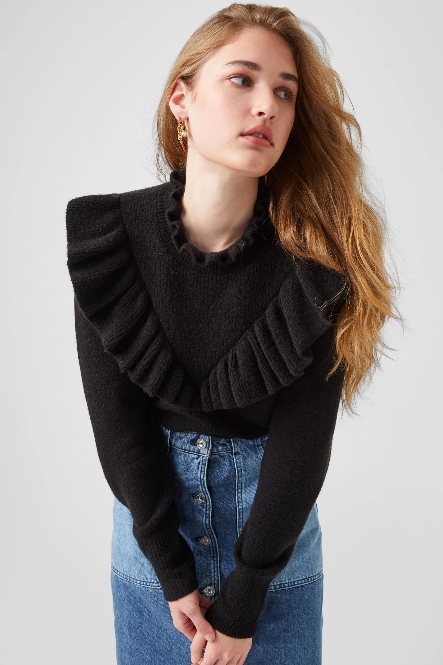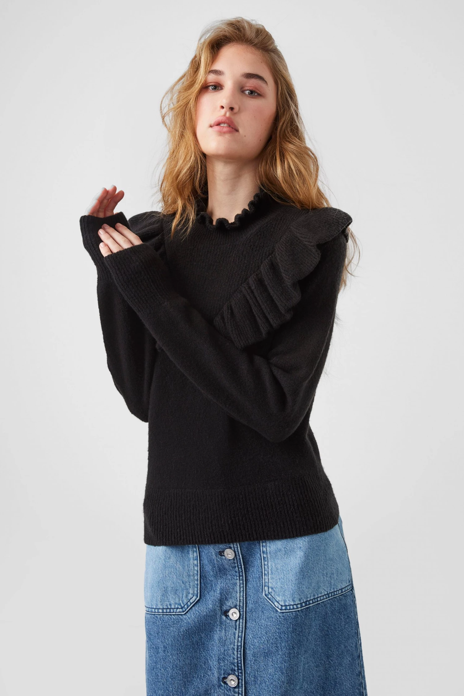Proving that even knitwear can be eye-catching, the Mira Flossy Jumper is knitted from a soft fabric blend and decorated with frills and ruffles.