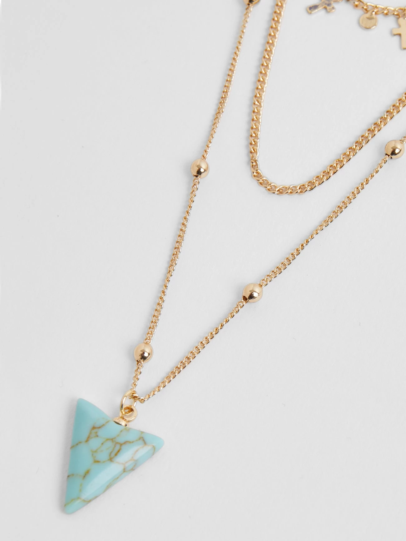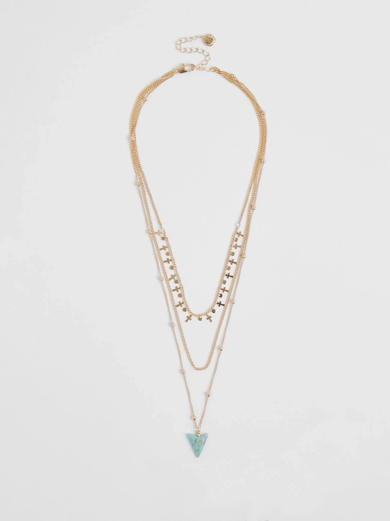 Layering made easy, the Multi-Chain Cross Arrow Necklace is made from three chains with different charms for an effortlessly put-together effect.