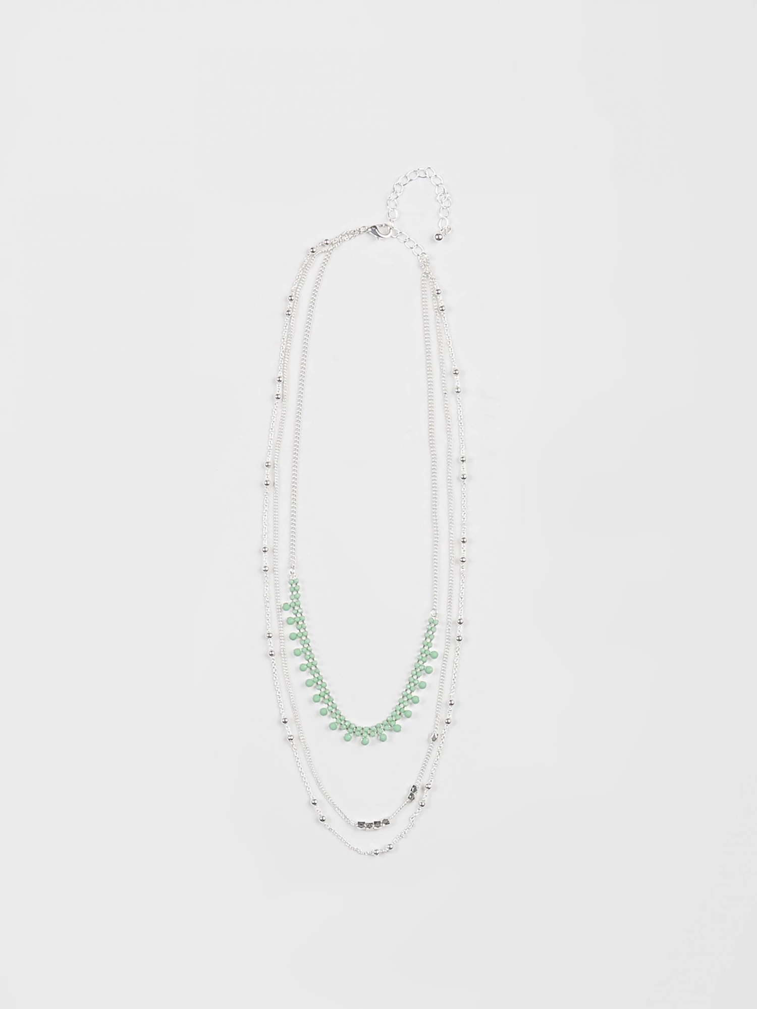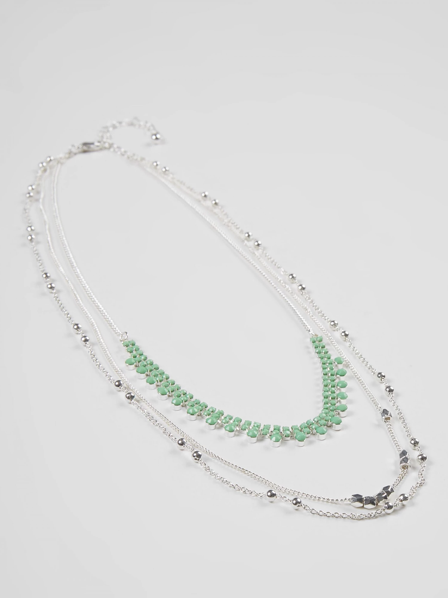 Effortless elegance and layering is achieved with our Delicate Diamante Multi-Strand Necklace. In silver tone, this necklace presents a trio of fine decorated chains, with the stand-out being a delicate display of glistening green diamantes.