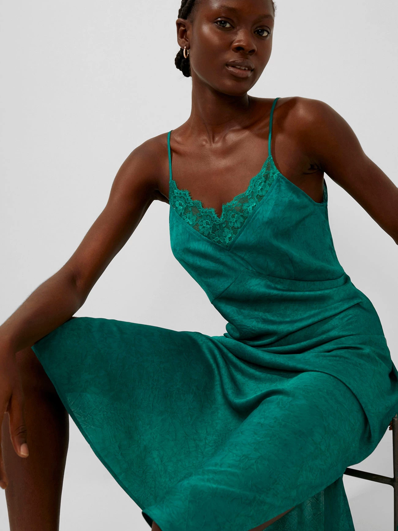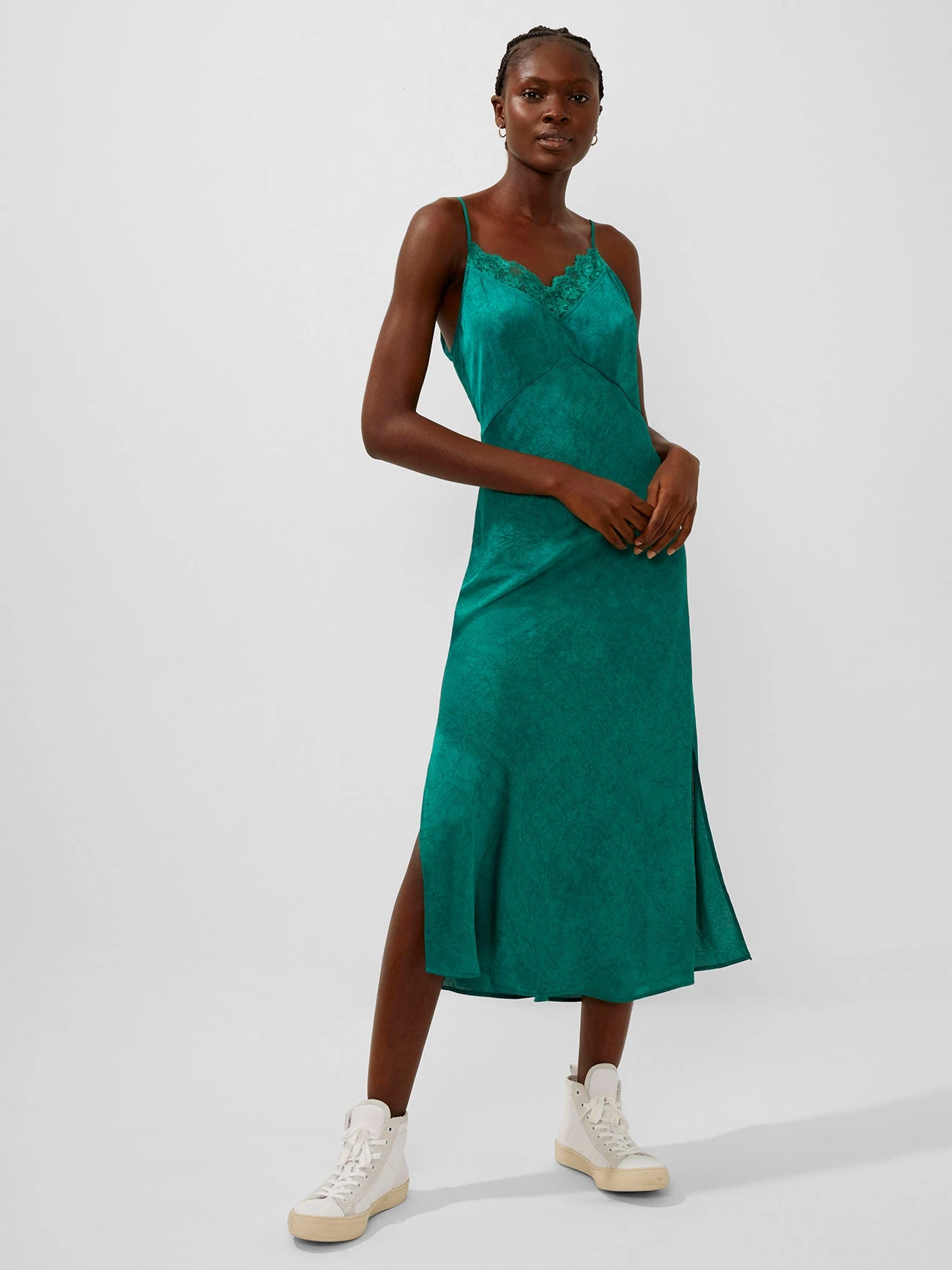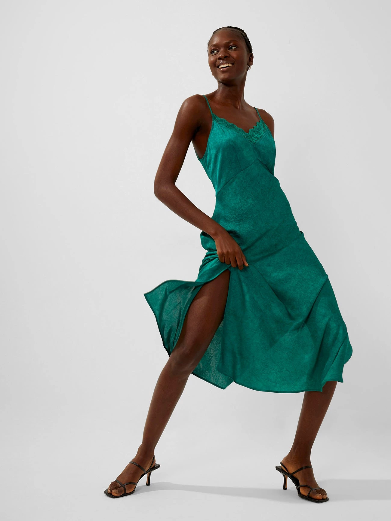 So alluring and elegant at the same time. The Dola Drape Slip Midi Dress falls to a calf-skimming length, with a satin-like sheen, lace trimmed v-neckline and side split duo.