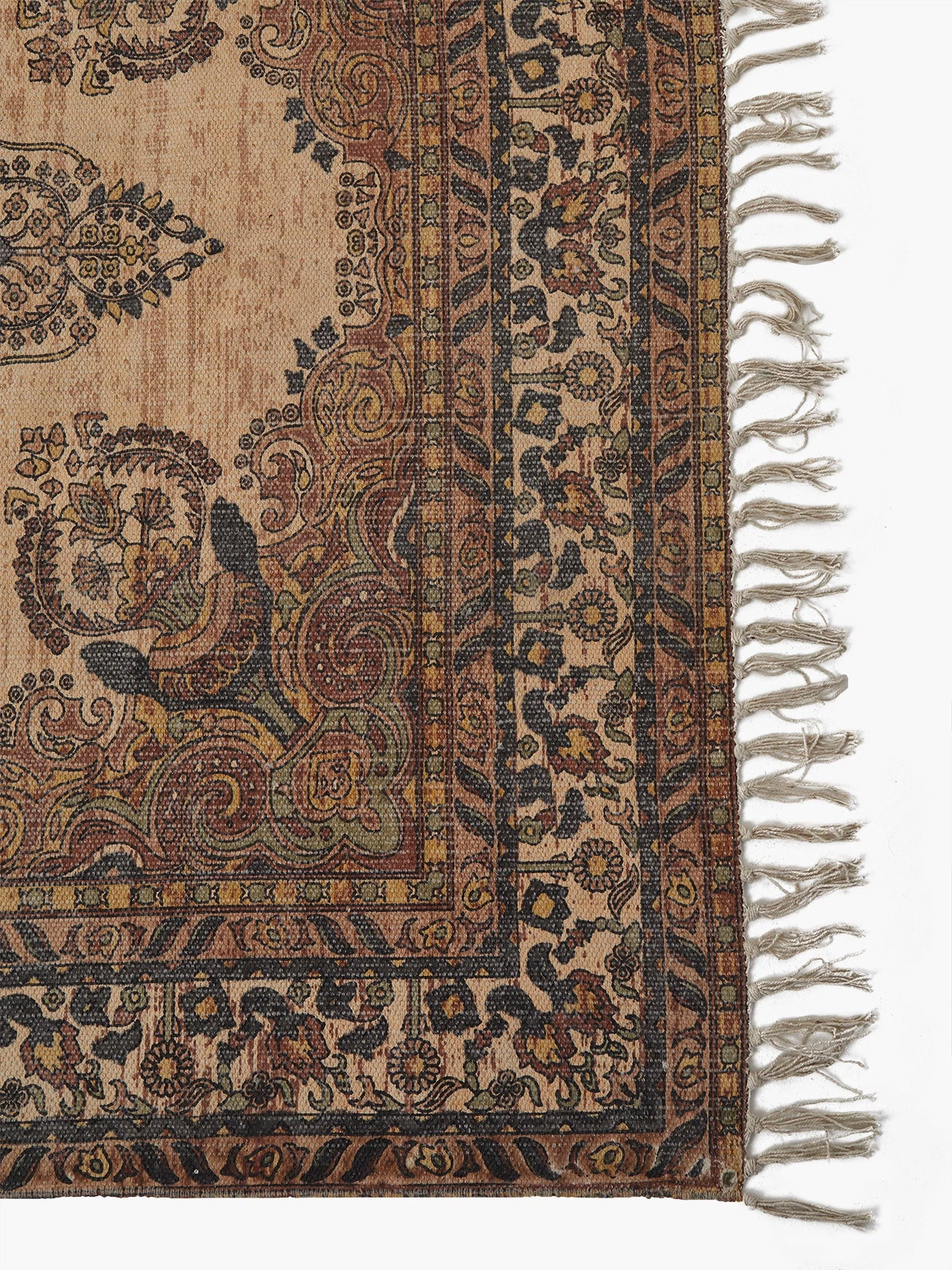 Neutral tones and an eye-catching print combine to create the Mandala rug. Boasting a unique vintage-inspired floral design, purposeful faded antiquing and bohemian fringed edges, this rug is the perfect base to create a calm and stylish space.
