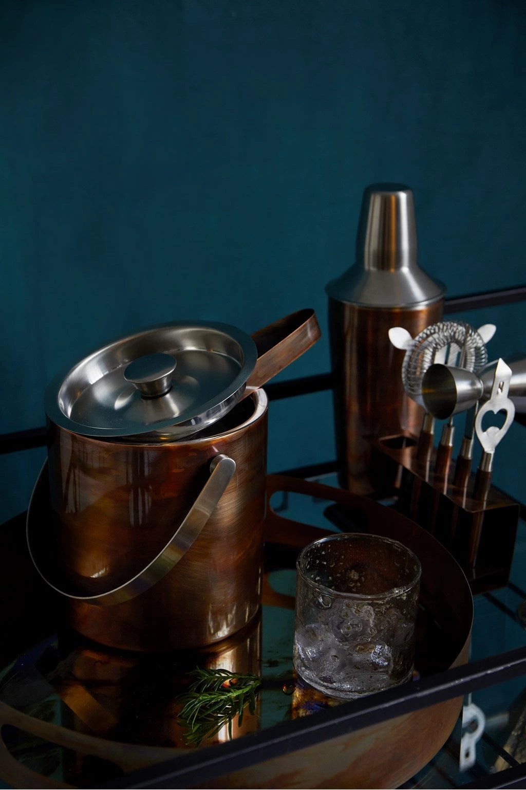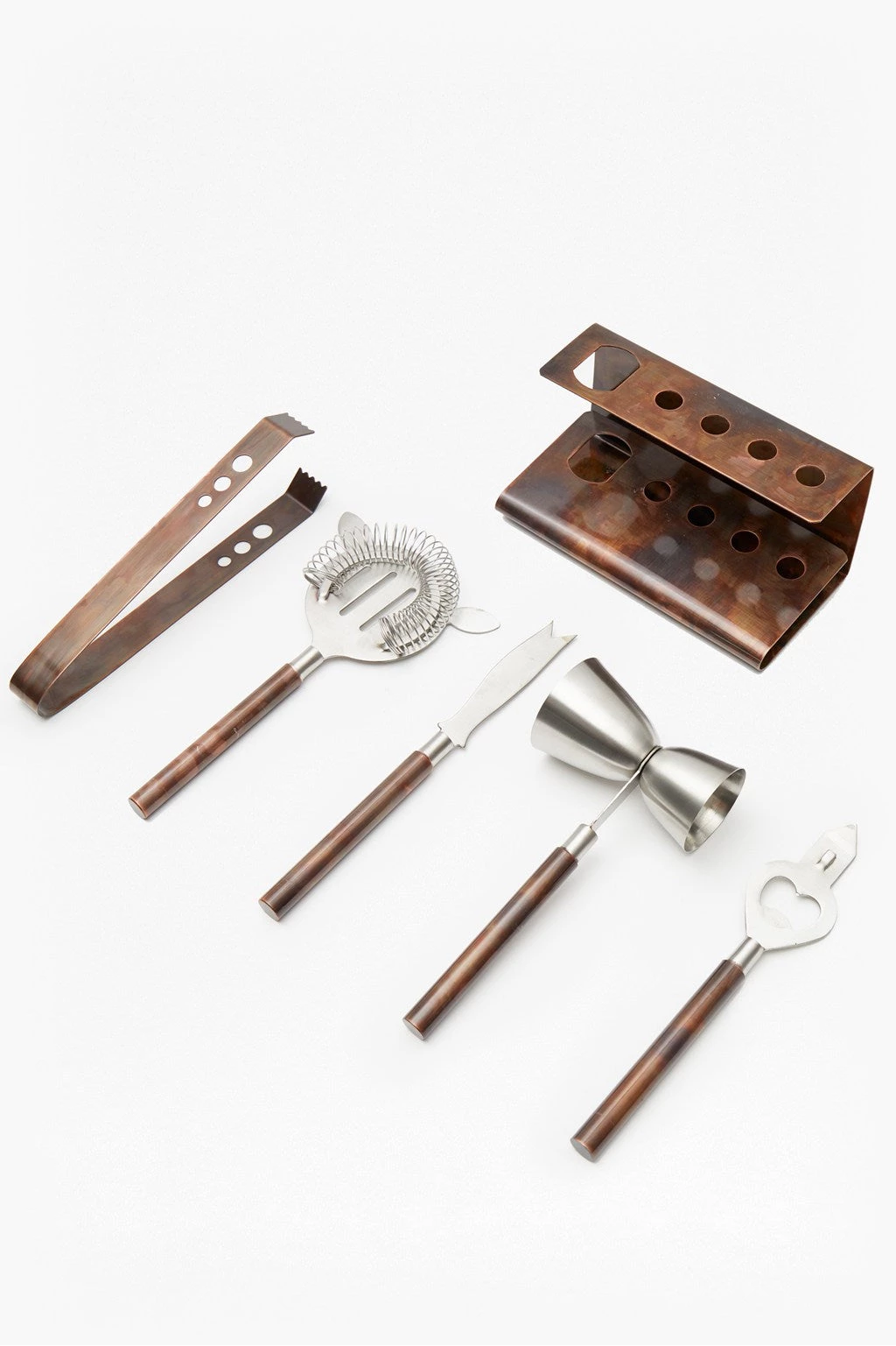 Make cocktail hour a celebratory occasion with the Galaxy 5 Piece Cocktail Set. Featuring a strainer, measuring jigger, two bar spoons and a set of tongues, the set will help you craft the perfect drinks. With an antiqued copper finish and elegant metallic design, the cocktail set brings form and function together in an elegant must-have bar essential.
