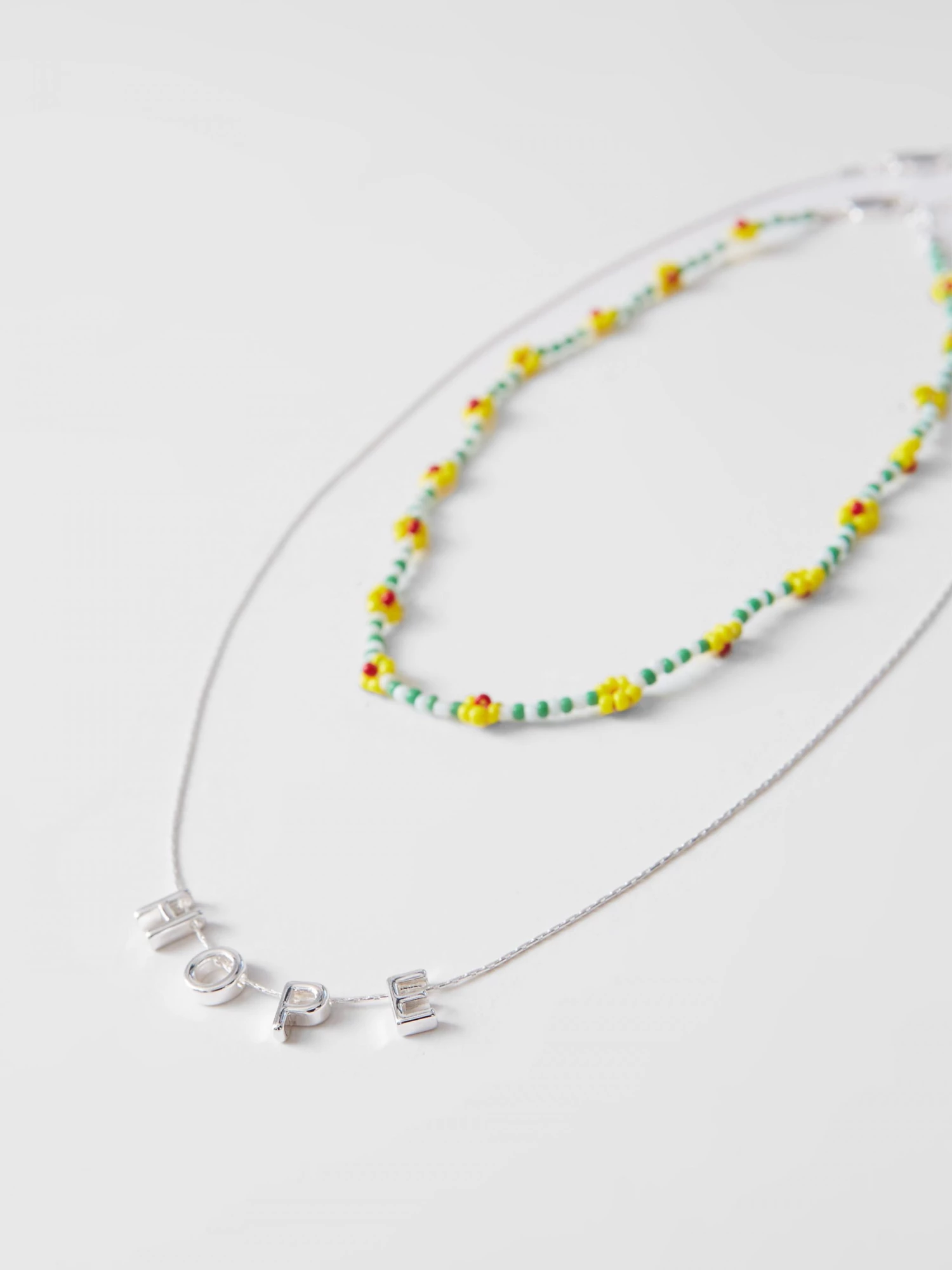 Inspire brighter days with the Hope And Bead Necklace 2 Pack, a sweet and sentimental pairing. In sleek silver tone, one necklace delicately presents letter charms spelling out ‘HOPE’, whilst the other is fashioned with flower stations formed with multi-coloured beads. At different lengths, these necklaces are ideal for layering together, or as wearing alone.
