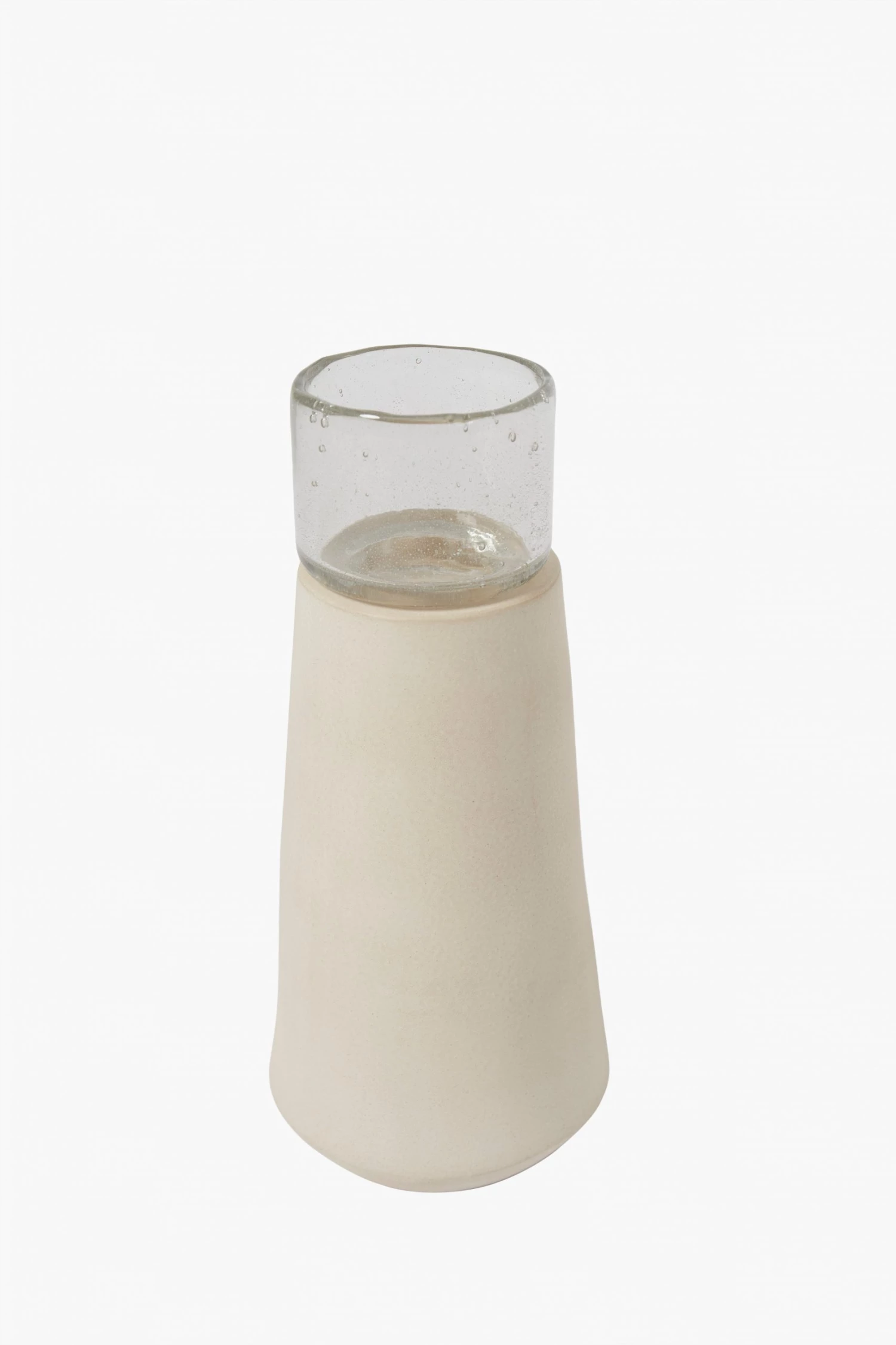 Add a calming warmth to your home with this artisanal stoneware candle holder. Boasting a hand-finished stoneware base with a recycled glass top, lending the piece an industrial finish, it is easily styled to suit any interior. Envelop your home in ambient lighting with all three sizes of the holder for maximum impact.