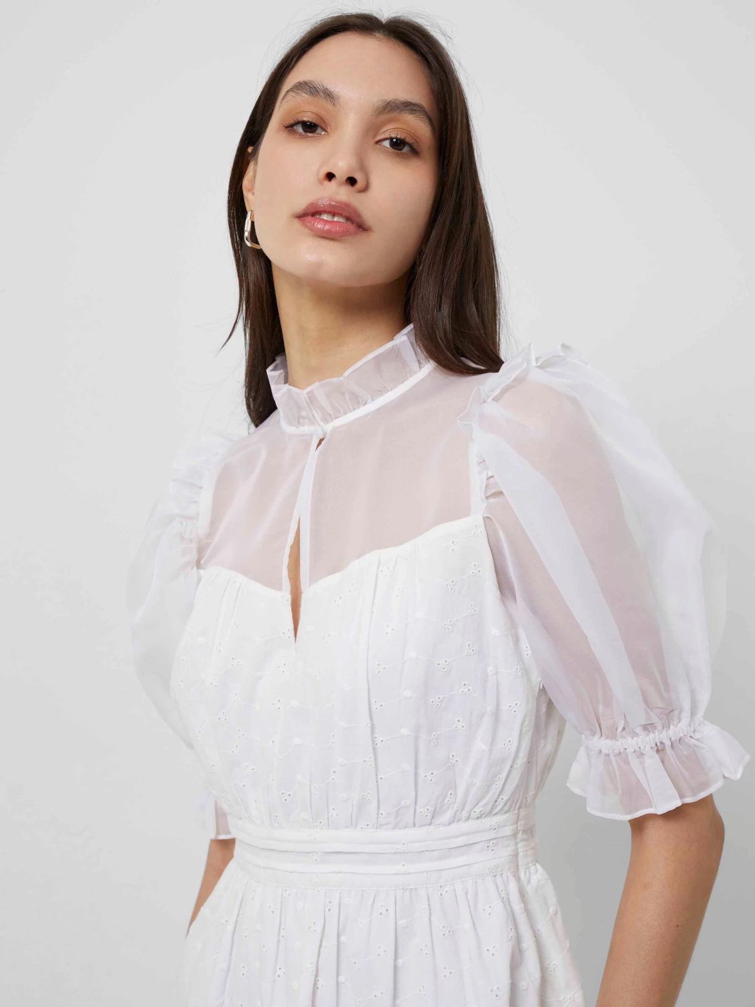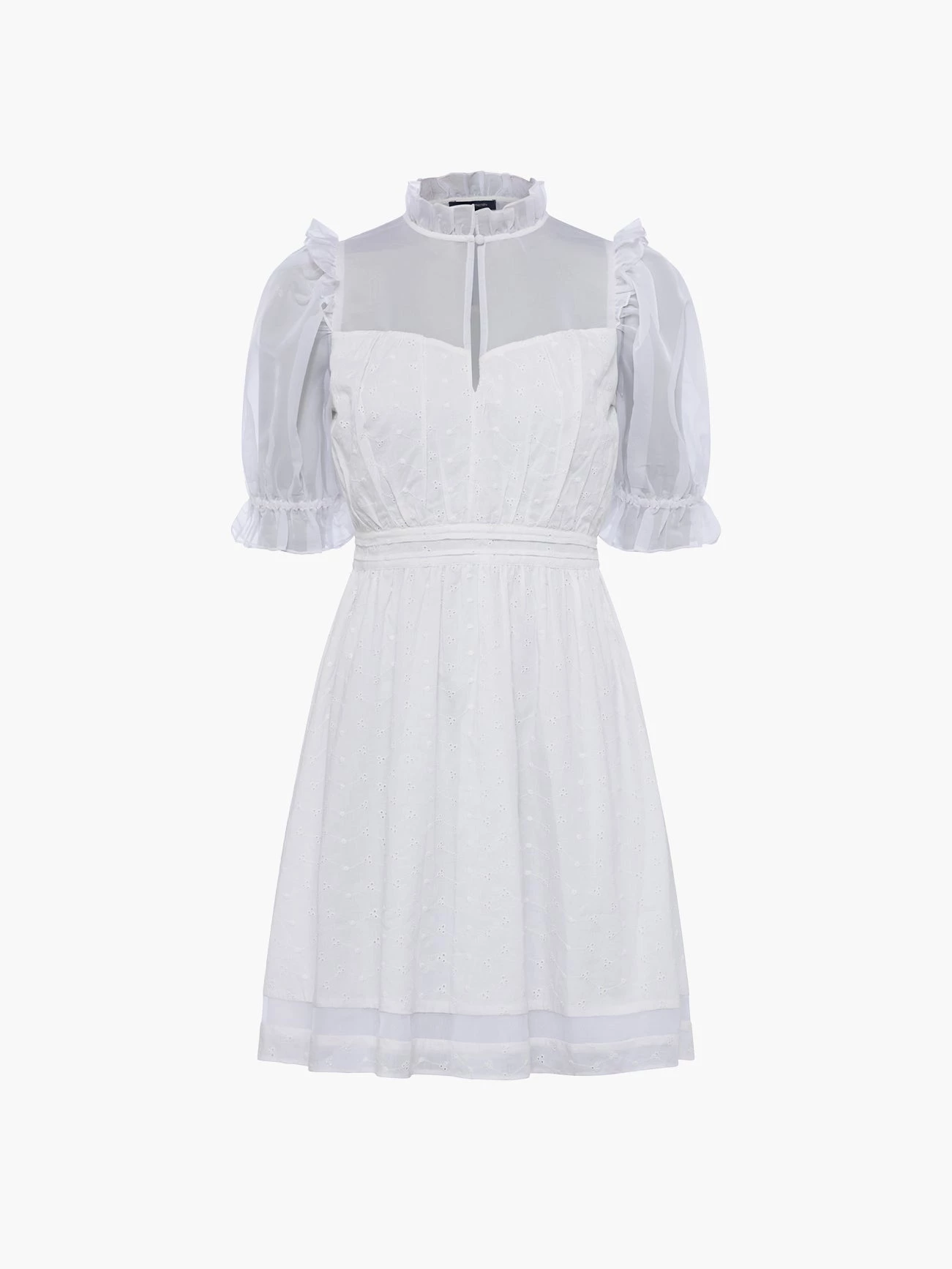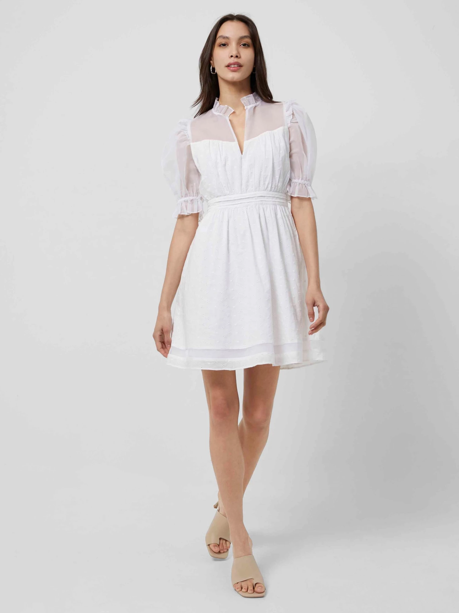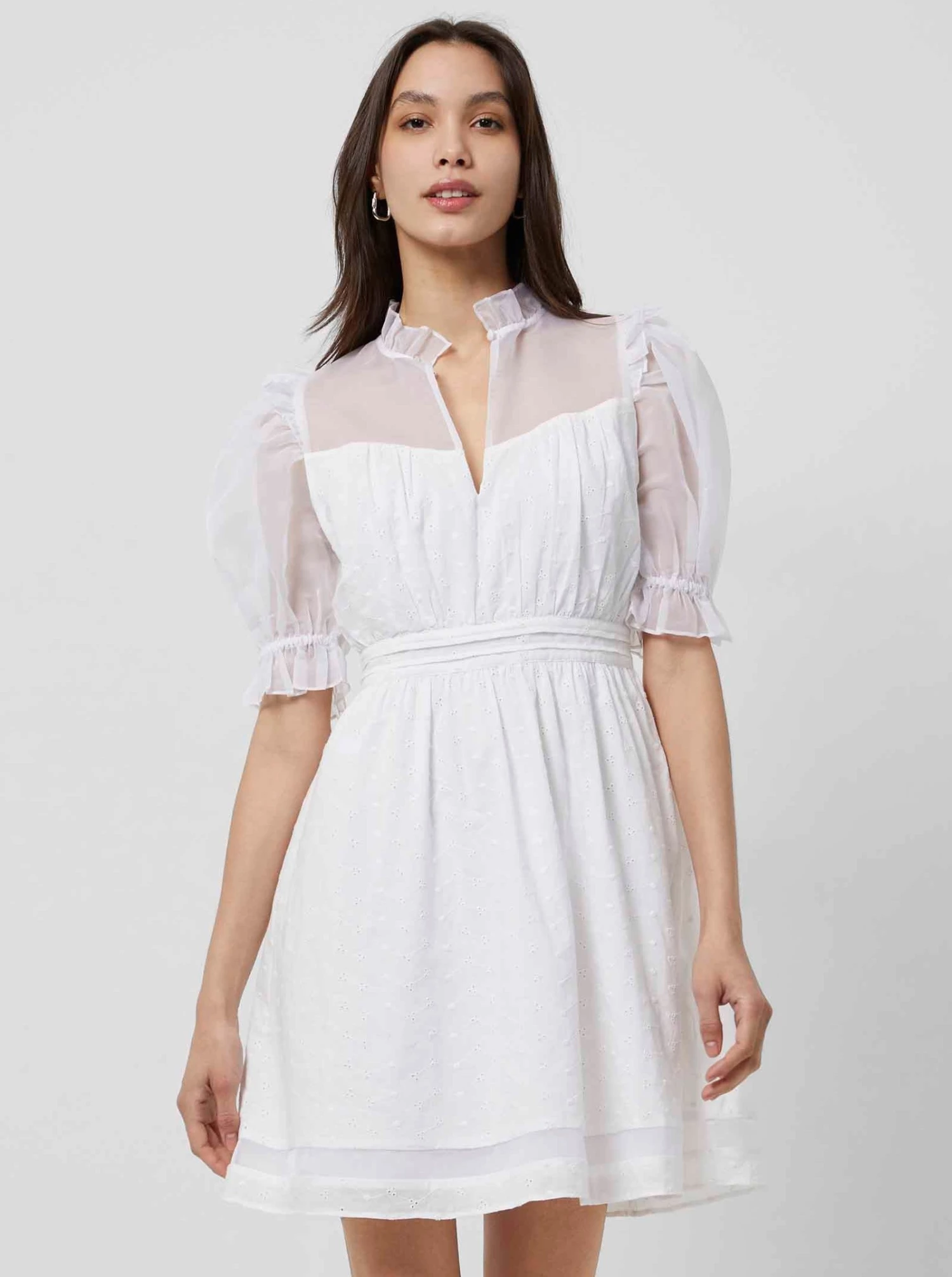 Mixing textures is our forte – and the Organic Cotton Mini Dress proves that. Boasting semi-sheer panels for a hint of skin, it has ruffled neckline and button detail.